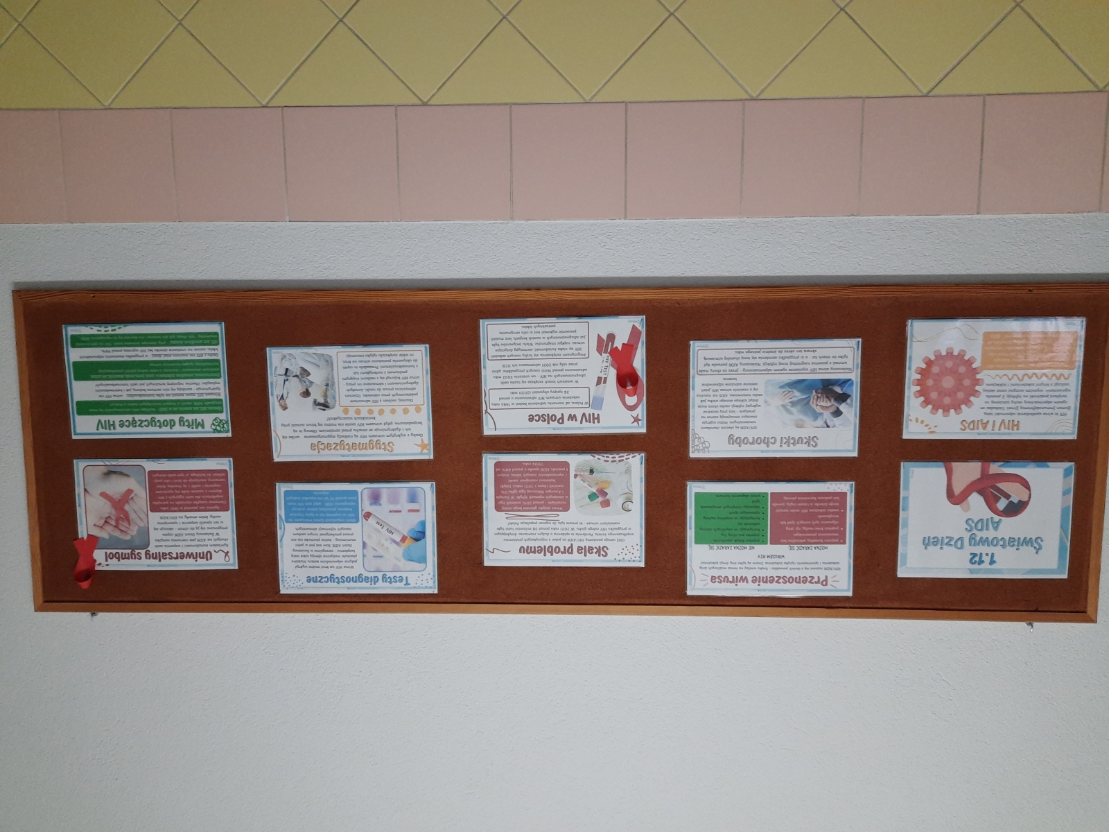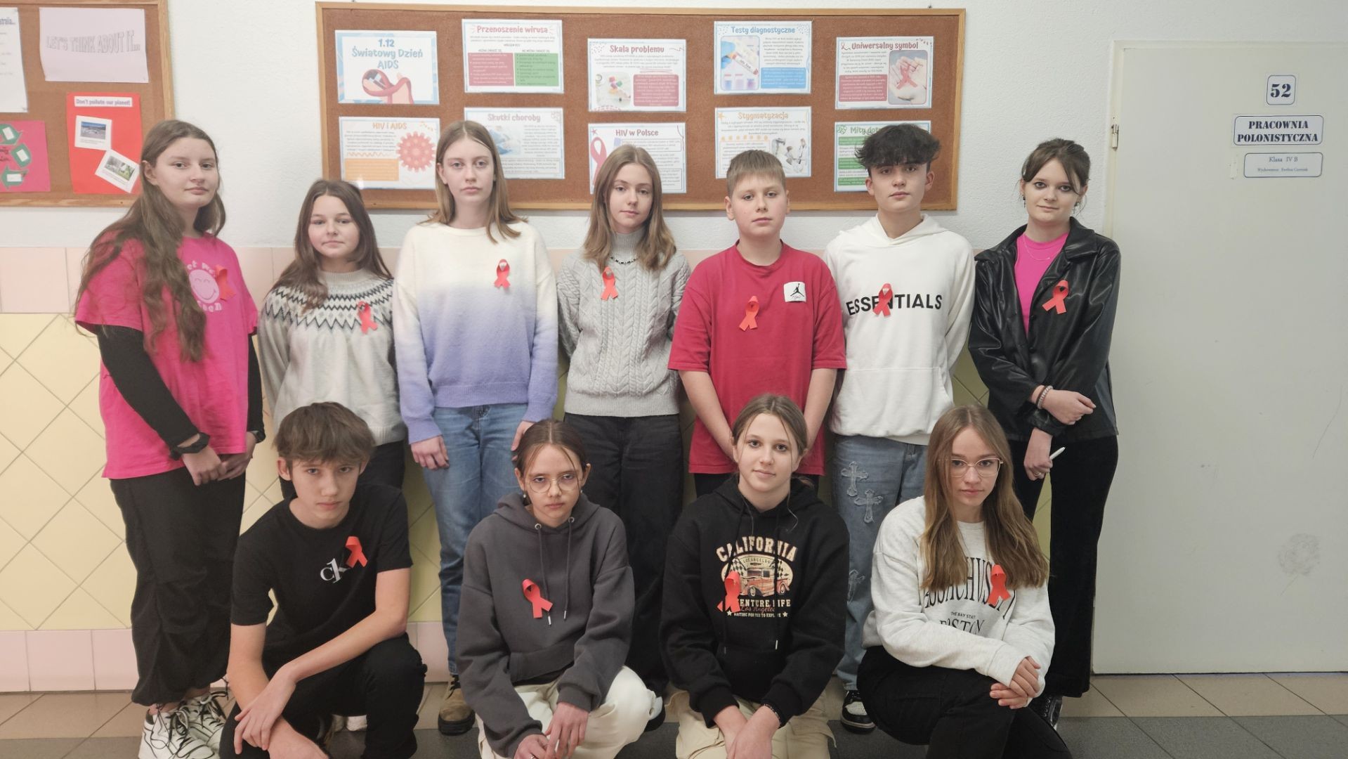 Uczniowie klas siódmych i ósmej uczestniczyli w konkursie wiedzy na temat HIV i AIDS, w którym wykazali się znajomością zachowań ryzykownych i bezpiecznych wobec osób zakażonych HIV. Potrafili doskonale odróżnić fakty od mitów, które do tej pory krążą wśród wielu osób. Są także świadomi, iż substancje psychoaktywne zwiększają ryzyko zakażenia, ponieważ zmniejszają naszą czujność i kontrolę zachowania. Z testem najlepiej poradzili sobie: Alicja Kraska VIIB, Martyna Wawrzyniak VIIB, Filip Krzeszewski VIIA oraz Ewa Gorzała VIIB. Uczniowie dodatkowo włączyli się w akcję Czerwona Kokardka wyrażając tym symbolem solidarność z osobami chorymi na AIDS i zakażonymi HIV oraz członkami ich rodzin. Dla społeczności szkolnej przygotowana została także gazetka informacyjna na korytarzu szkolnym.