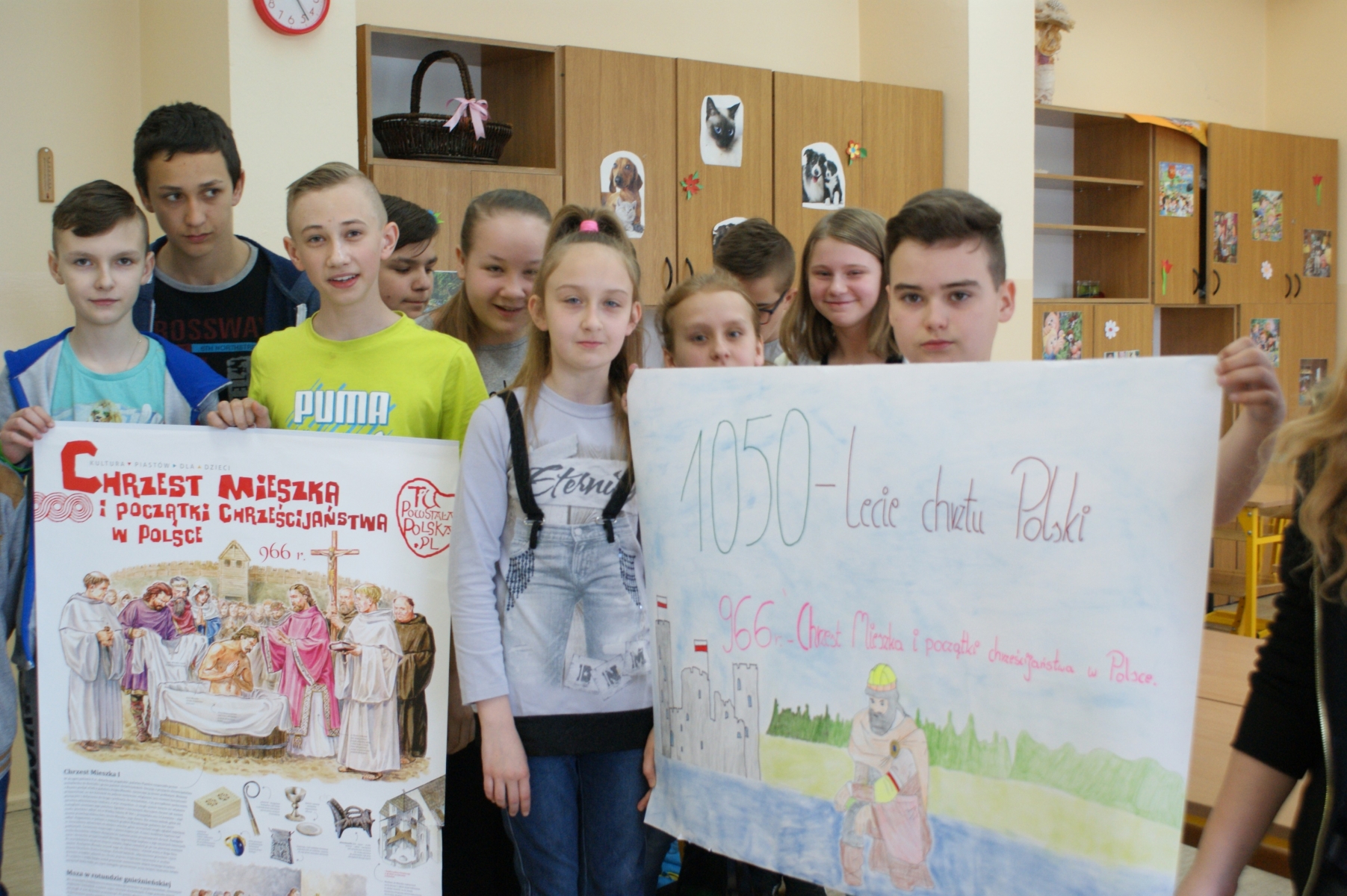 Uczniowie klas VI abc włączyli się w Ogólnopolską Kampanię Edukacyjną związaną z 1050-leciem chrztu Polski. Z tej okazji przygotowali okolicznościowe plakaty. Zrealizowany został również cykl lekcji „Od legendy o Piaście do historii o Mieszku”. Celem zajęć było utrwalenie wiadomości, ale i zdobywanie nowych informacji . Uczniowie przedstawili różne źródła historyczne, korzystali ze współczesnych źródeł informacji dotyczących najdawniejszych dziejów Polski. Szóstoklasiści wskazali dowody na historyczność Mieszka jako pierwszego władcy Polan(teksty pisane i zabytki materialne),wyliczali różne źródła informacji pozyskiwane przez historyków i archeologów. Uczniowie pracowali z tekstami źródłowymi, z mapą historyczną i materiałem ikonograficznym. Zostały wykorzystane różne środki dydaktyczne m.in. fragmenty kroniki Galla Anonima, mapa państwa Mieszka, ilustracje wybranych grodów wczesnopiastowskich oraz karty pracy.