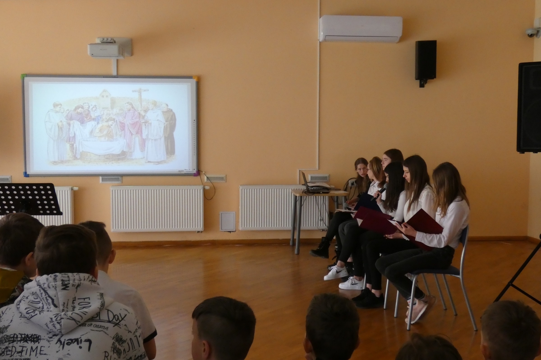 Święto Chrztu Polski społeczność naszej szkoły uczciła uroczystą akademią już w czwartek 7 kwietnia. Święto Chrztu Polski zostało ustanowione przez Sejm RP w lutym 2019 r. i ma na celu „upamiętnienie chrztu Polski dokonanego 14 kwietnia 966 r.” zważywszy na doniosłość decyzji Mieszka I, cywilizacyjną wagę tego wydarzenia i kluczowe znaczenie dla rozwoju naszej Ojczyzny”. Data tego święta nie jest tożsama z faktyczną datą przyjęcia chrztu przez Mieszka I – brakuje nam źródeł historycznych. Nie ma jednak wątpliwości co do tego, że wydarzenie to zapoczątkowało okres chrystianizacji i włączania państwa Mieszka do grona państw Europy łacińskiej, dzięki czemu rozwinęła się na naszych ziemiach kultura piśmienna, administracja państwowa i kościelna, dyplomacja, szkolnictwo…Uczennice klasy 8 a wierszem opowiedziały o tym przełomowym wydarzeniu, podkreśliły jego wielostronne znaczenie. Przekaz słowny uatrakcyjniony został prezentacjami multimedialnymi i pięknym śpiewem.
