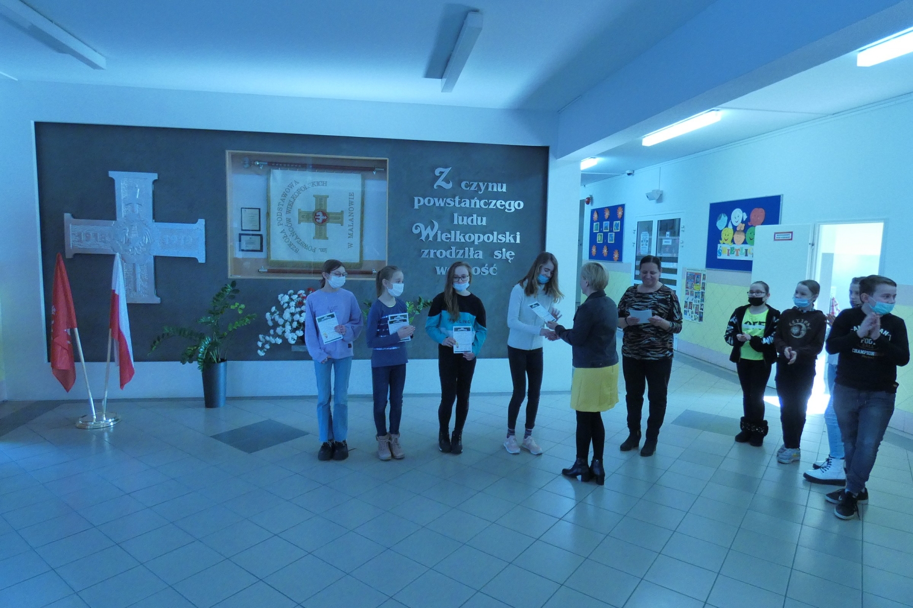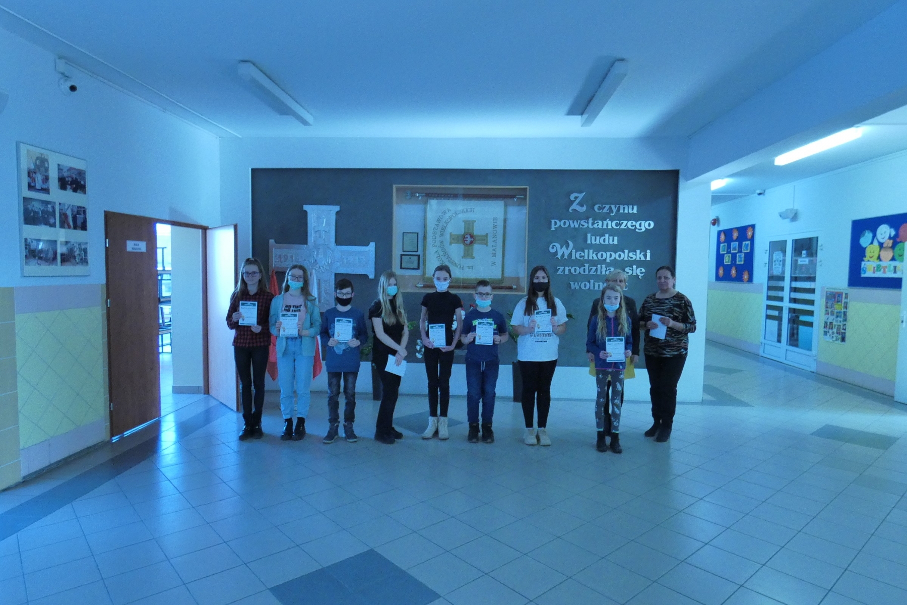 Dyplomy uznania za uzyskanie bardzo dobrego wyniku w konkursie otrzymały : Klaudia Kąciak z klasy V a, która zajęła 1 miejsce w województwie, 45 miejsce w kraju, Nadia Kąciak z klasy V a – 2 miejsce w województwie, 59 w kraju i Amelia Adamczak z klasy VIII c, która zajęła 9 miejsce w województwie.