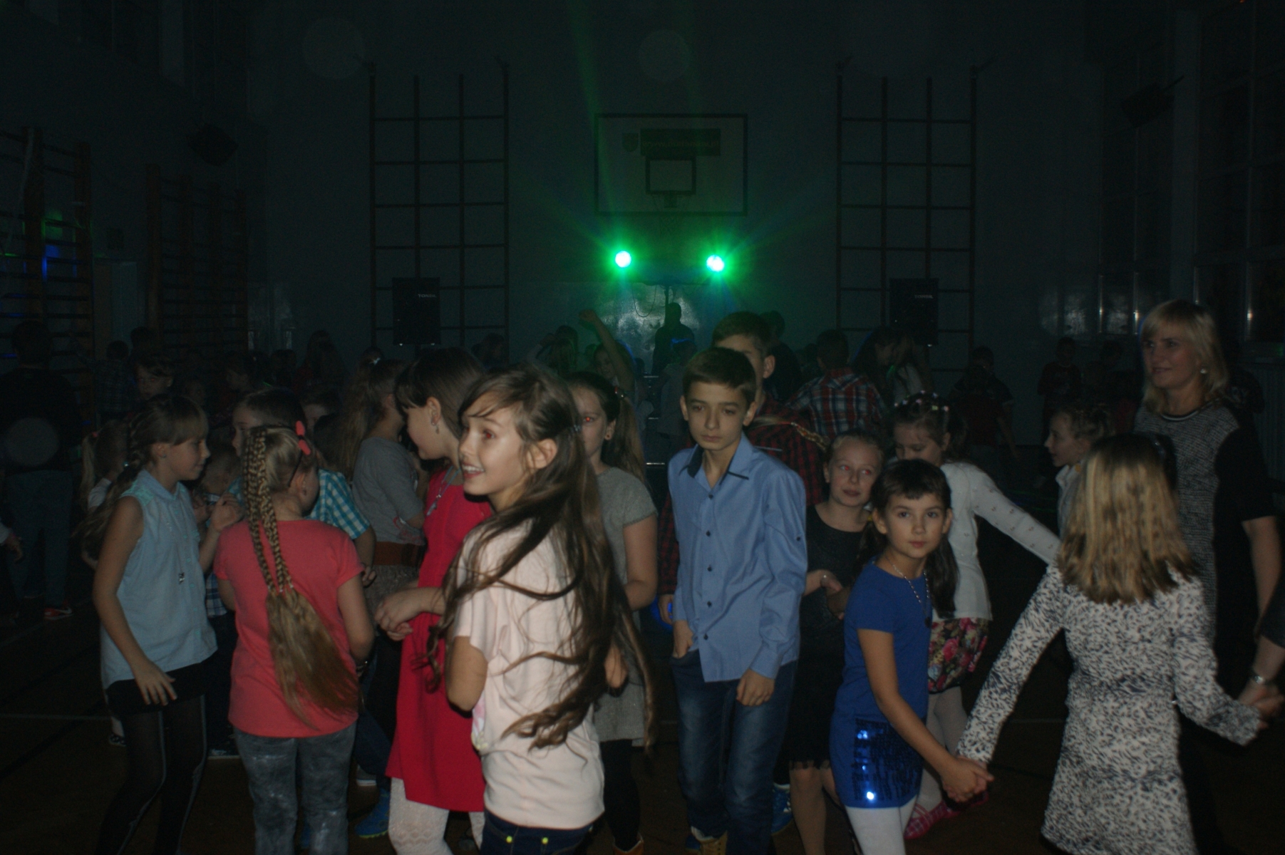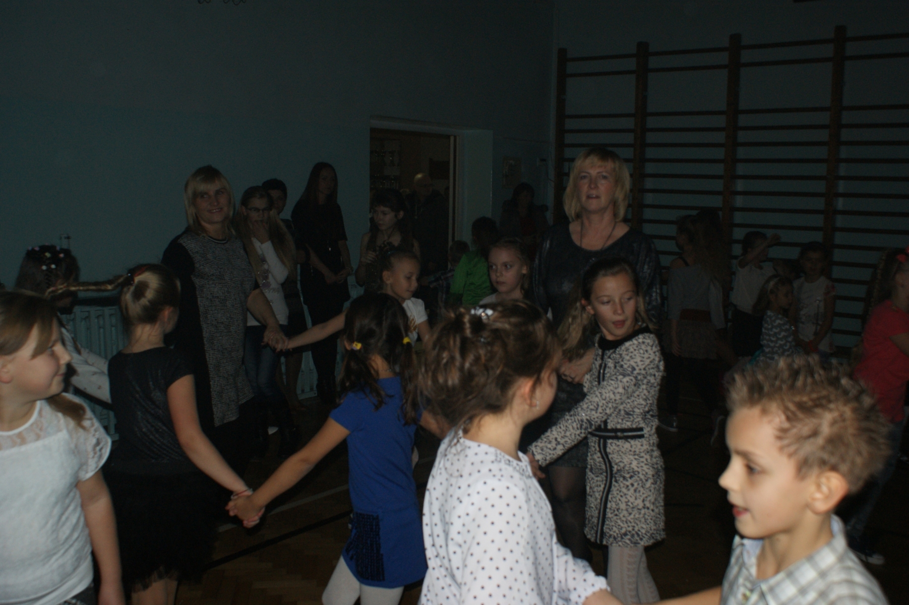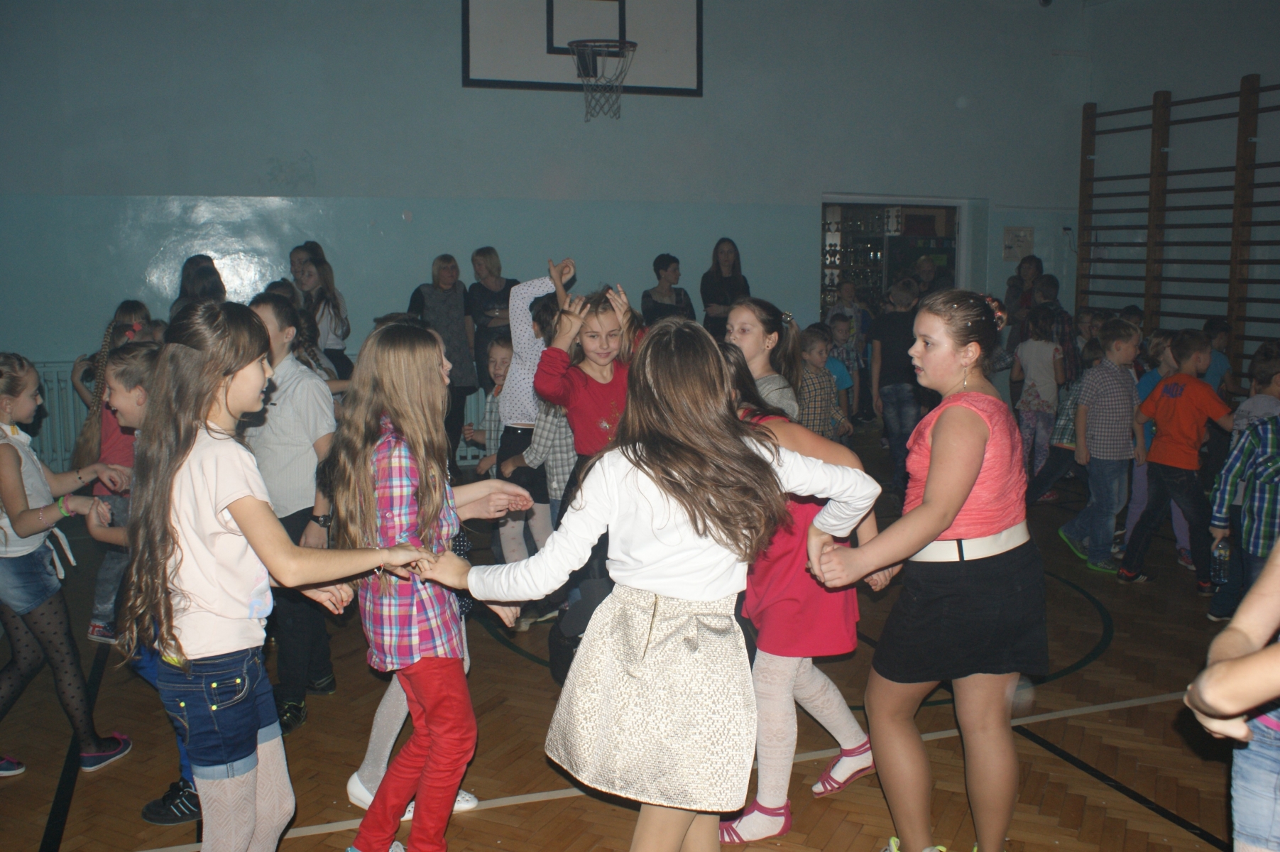 Po zajęciach lekcyjnych o godzinie 16.00, dzieci zebrały się na sali gimnastycznej, gdzie rozpoczęła się dyskoteka. Z radością można było obserwować, jak wspólnie potrafią bawić się uczniowie młodsi i starsi.