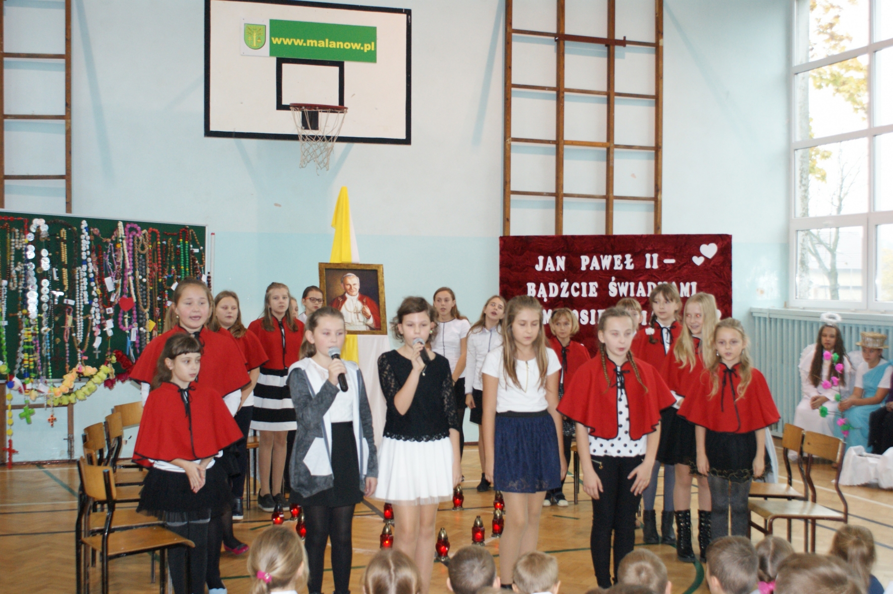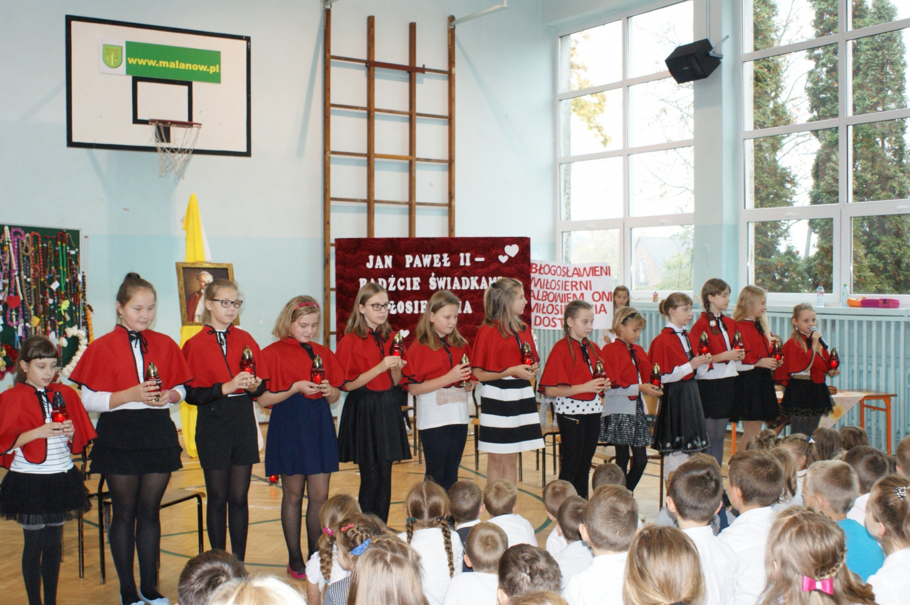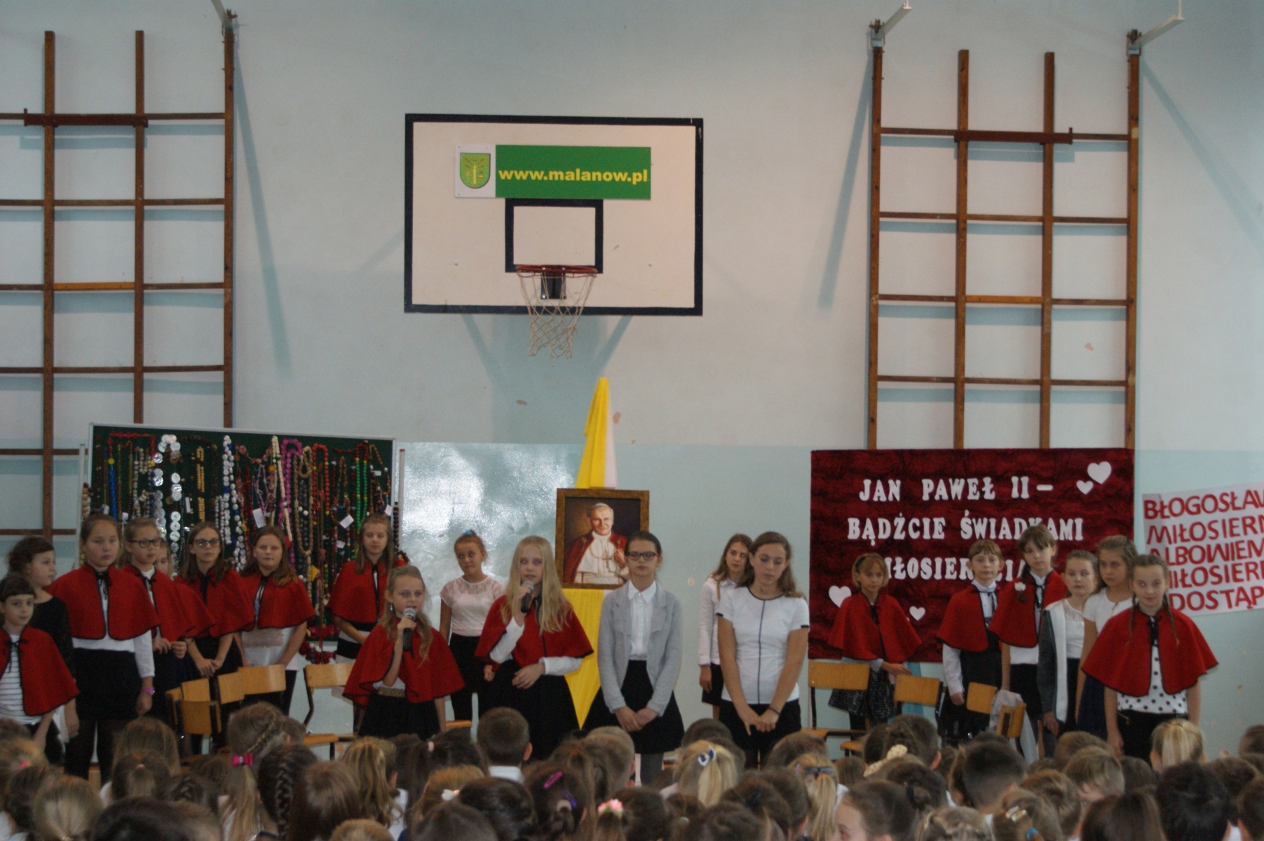 ,,Jan Paweł II – bądźcie świadkami Miłosierdzia”- pod takim hasłem odbył się apel w Szkole Podstawowej w Malanowie przygotowany przez katechetkę Małgorzatę Przybylak z okazji kolejnego już Dnia Papieskiego. Uroczystość rozpoczął Pan dyrektor Marek Nowicki witając zaproszonego gościa ks. Prałata Stanisława Płaszczyka oraz całą społeczność szkolną. Uczniowie w prezentowanych scenkach zachęcali, za Janem Pawłem II, do świadczenia miłosierdzia wobec drugiego człowieka. Nie zabrakło także pięknego śpiewu pod kierunkiem p. Katarzyny Tomczyk. Na podniosłą atmosferę uroczystości wpłynęła dekoracja przygotowana z pomocą p. Emilii Stefaniak. Apel zakończył się podsumowaniem konkursu różańcowego. Ks. Prałat wręczył dyplomy i nagrody zwycięzcom konkursu różańcowego oraz wyróżnienie i nagrodę Marice Stefaniak z klasy Va , która brała udział w konkursie powiatowym pt .,,Twórczość Jana Pawła II” na temat:,, Rok Miłosierdzia Bożego”.