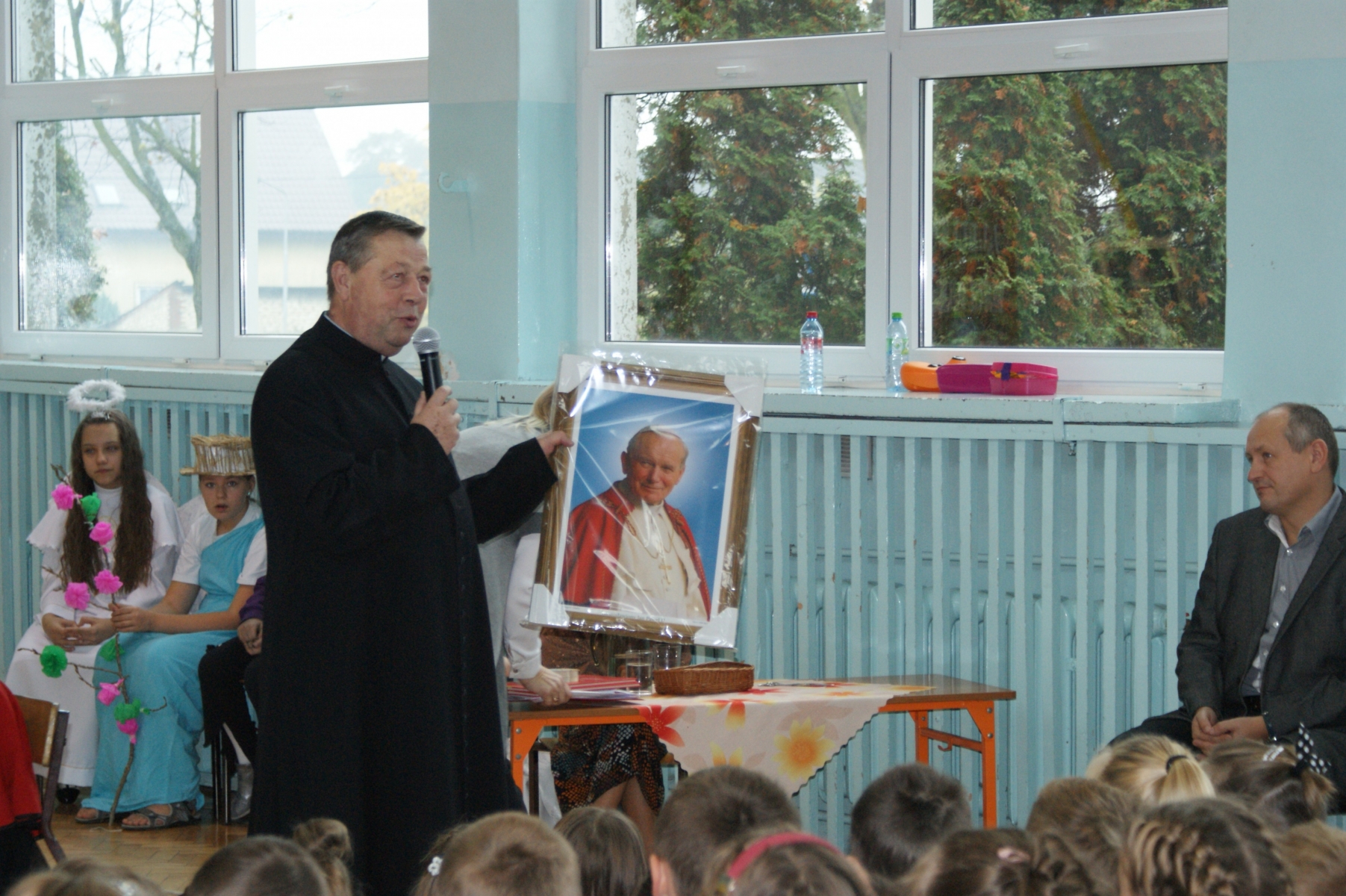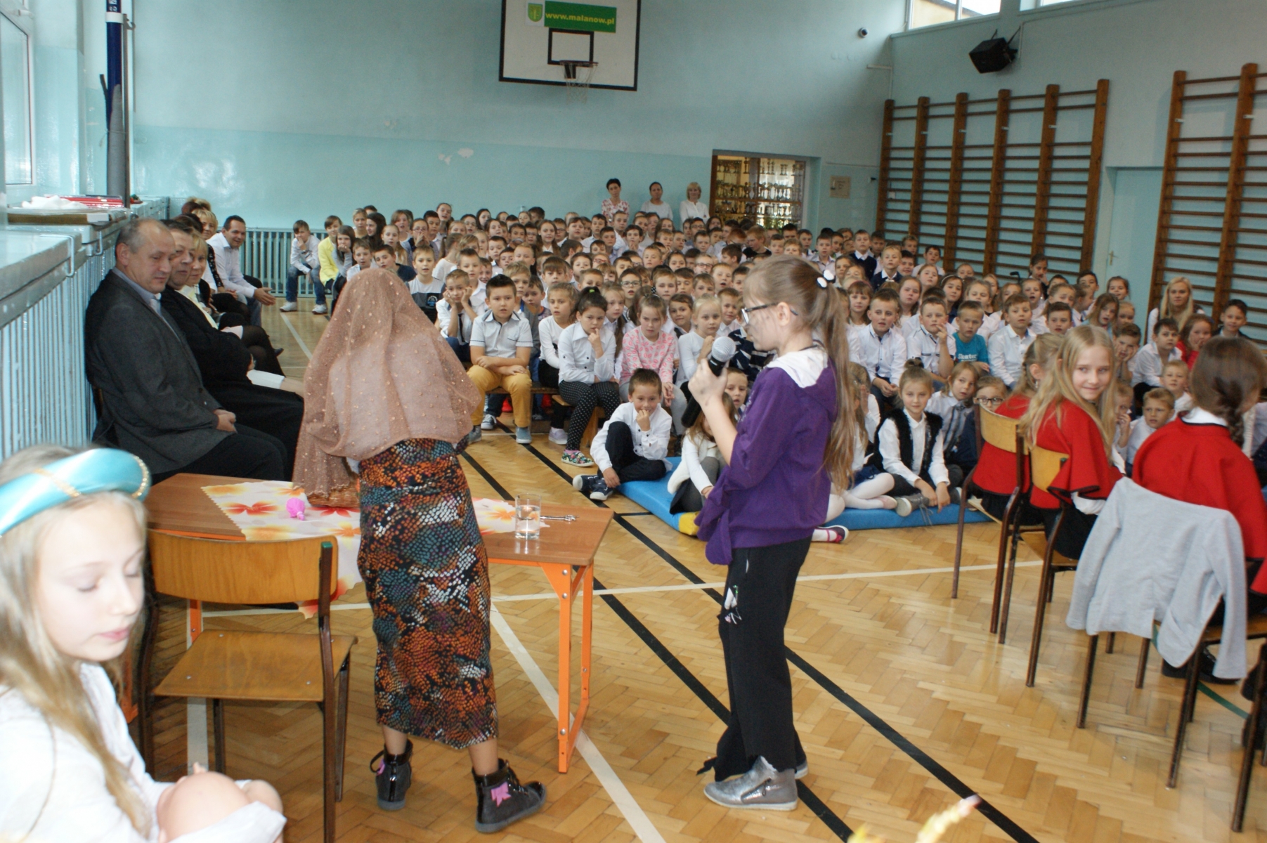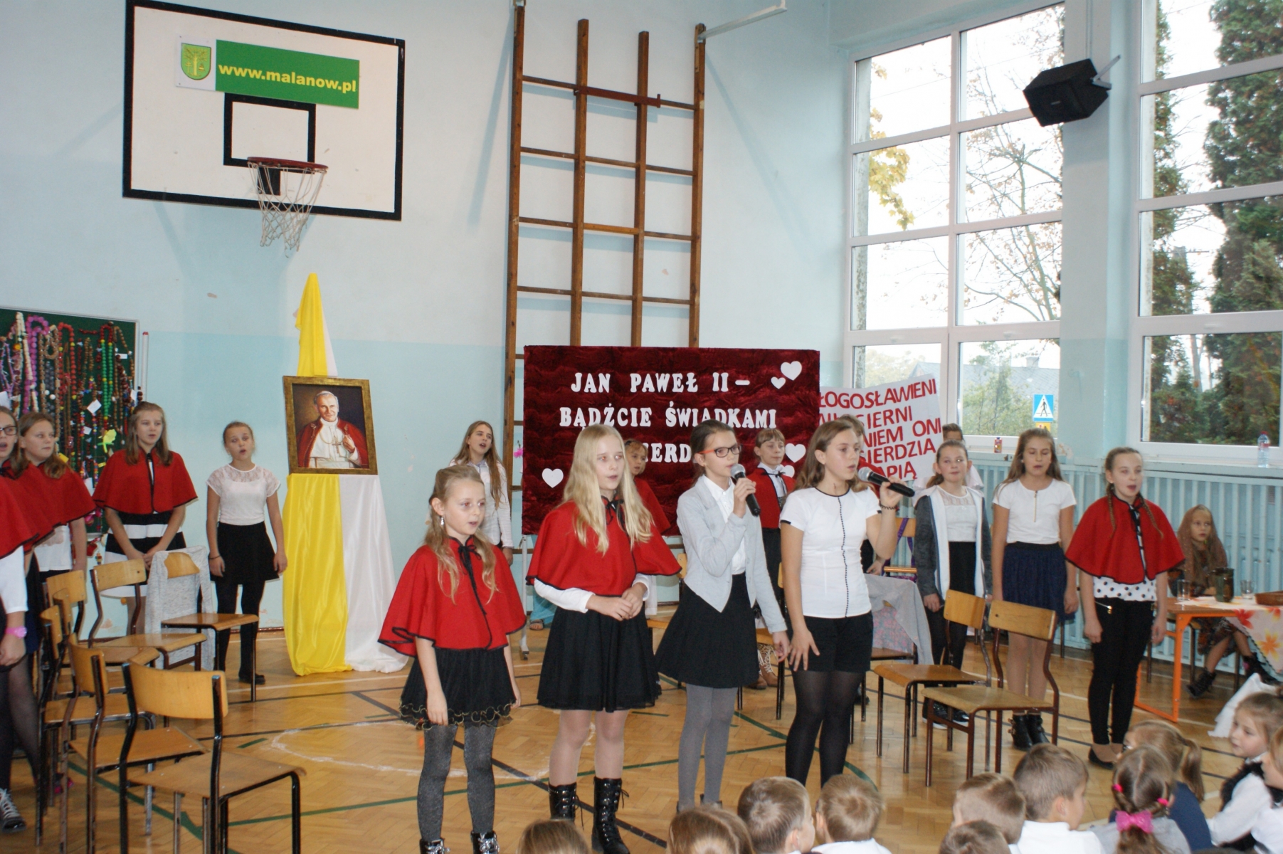 ,,Jan Paweł II – bądźcie świadkami Miłosierdzia”- pod takim hasłem odbył się apel w Szkole Podstawowej w Malanowie przygotowany przez katechetkę Małgorzatę Przybylak z okazji kolejnego już Dnia Papieskiego. Uroczystość rozpoczął Pan dyrektor Marek Nowicki witając zaproszonego gościa ks. Prałata Stanisława Płaszczyka oraz całą społeczność szkolną. Uczniowie w prezentowanych scenkach zachęcali, za Janem Pawłem II, do świadczenia miłosierdzia wobec drugiego człowieka. Nie zabrakło także pięknego śpiewu pod kierunkiem p. Katarzyny Tomczyk. Na podniosłą atmosferę uroczystości wpłynęła dekoracja przygotowana z pomocą p. Emilii Stefaniak. Apel zakończył się podsumowaniem konkursu różańcowego. Ks. Prałat wręczył dyplomy i nagrody zwycięzcom konkursu różańcowego oraz wyróżnienie i nagrodę Marice Stefaniak z klasy Va , która brała udział w konkursie powiatowym pt .,,Twórczość Jana Pawła II” na temat:,, Rok Miłosierdzia Bożego”.