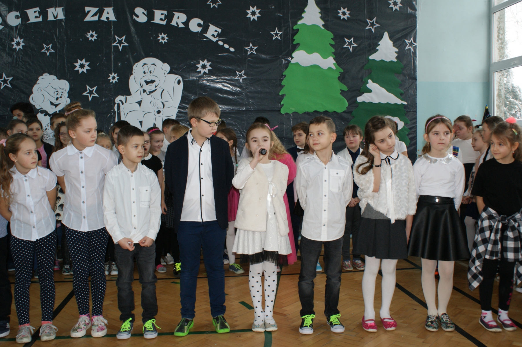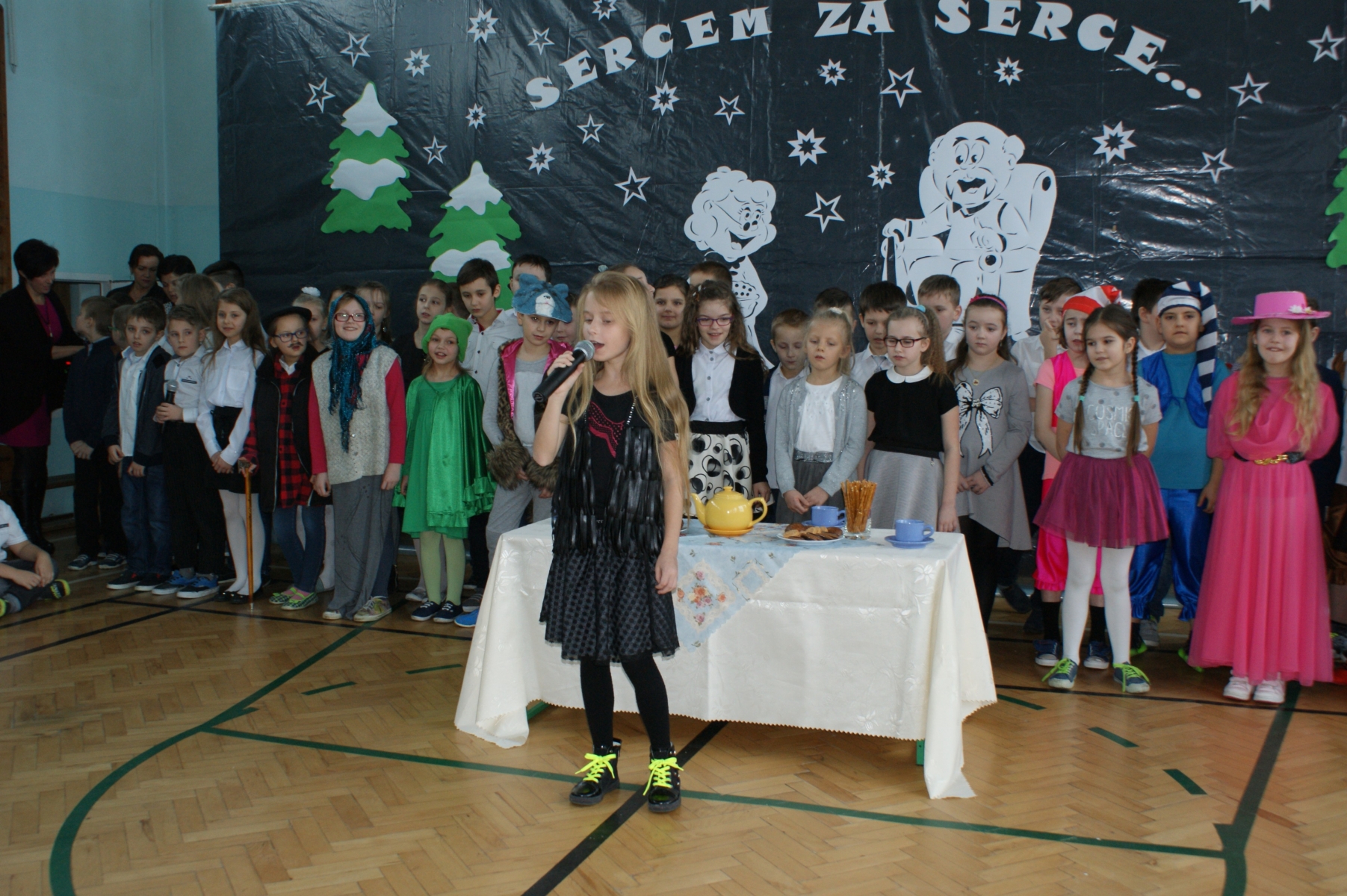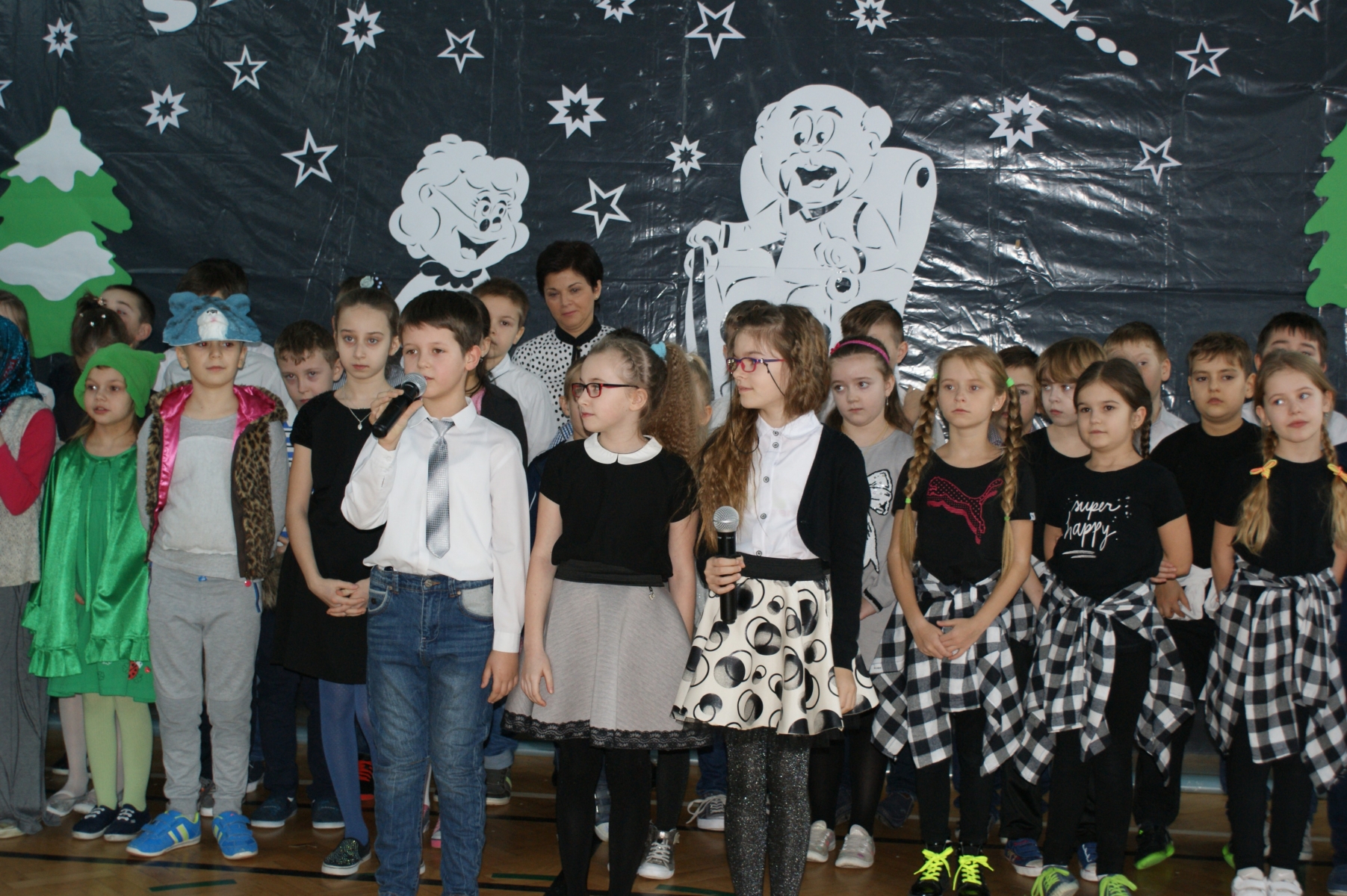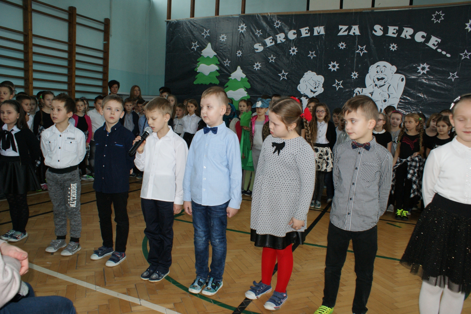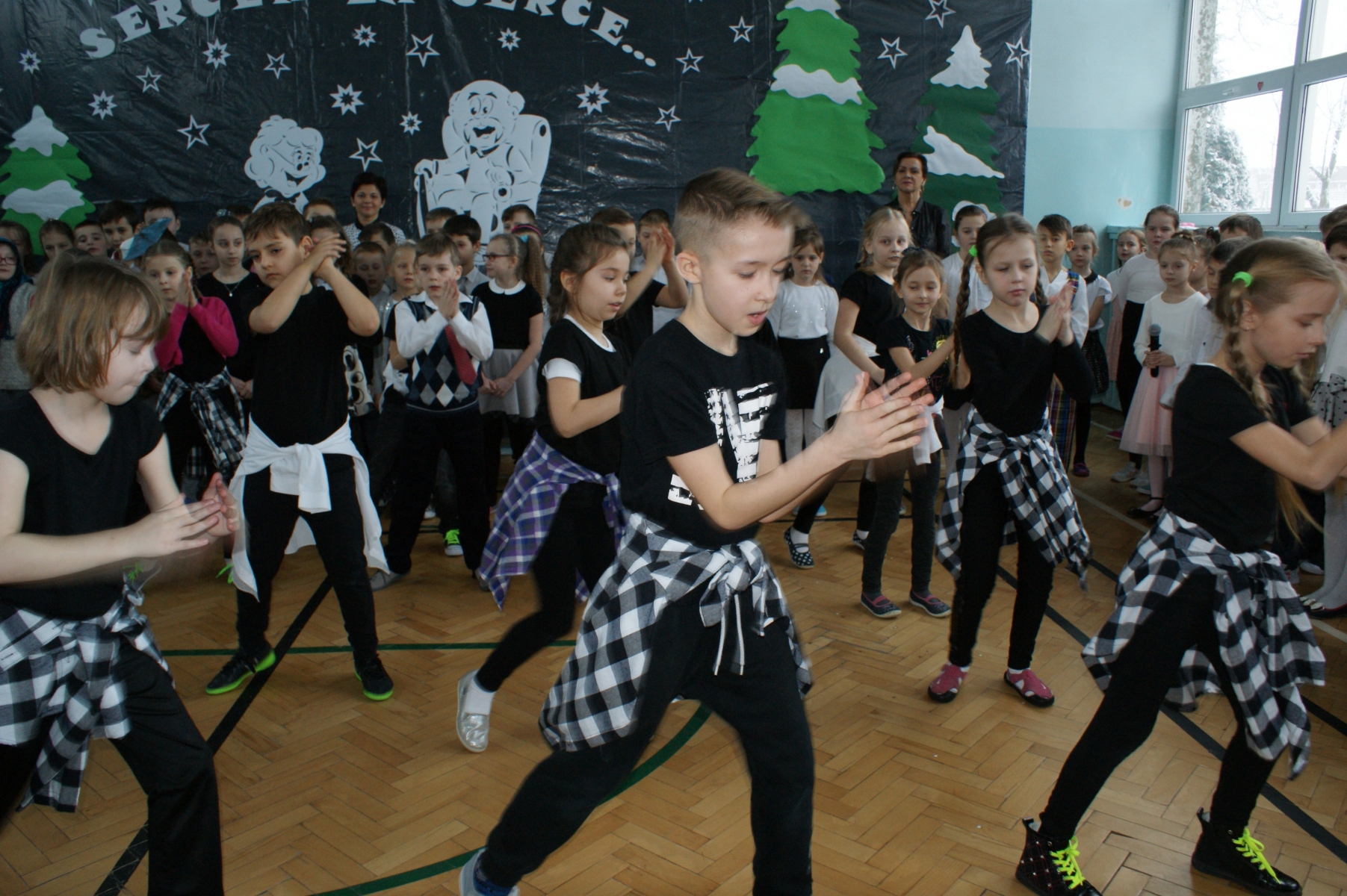 Wszystkie wnuczęta bardzo dobrze pamiętają o tym, jak wspaniale Babcie i Dziadkowie opowiadają bajki, śpiewają kołysanki, przytulają i pocieszają, kiedy w trudnych chwilach. Dlatego w tym dniu bardzo się starali, aby Goście miło i wesoło spędzili czas. Wierszem i piosenką wyrażali swoją miłość, wdzięczność i przywiązanie. Dumnie prezentowali się kolejno uczniowie wszystkich klas, nie zabrakło też odrobiny dobrego humoru. Dodatkową atrakcję stanowił występ zespołu tanecznego, którego opiekunem jest p. Ewa Stelmaszak.