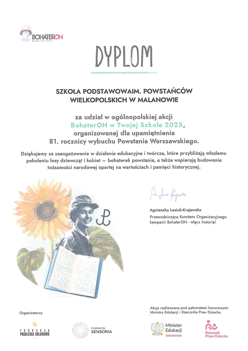 Nasza szkoła kolejny raz uczestniczyła w ogólnopolskim projekcie BohaterOn w Twojej Szkole. Kampania ma na celu upamiętnienie i uhonorowanie uczestników Powstania Warszawskiego, a także promocję historii Polski XX wieku oraz kształtowanie postaw patriotycznych. Tegoroczna edycja poświęcona została dziewczynom, kobietom walczącym u boku mężczyzn. Odegrały istotną rolę w przebiegu powstania. Szacuje się, że stanowiły 20% wszystkich powstańców. Walczyły z bronią w ręku, opatrywały rannych, prały, gotowały, przenosiły meldunki i listy. Na zajęciach uczniowie przygotowywali biogramy, śledzili losy kobiet – powstańców, rozmawiali o ich sile i poświęceniu, o obowiązku utrwalania pamięci o bohaterskich dziewczętach, którym odebrano młodość i przyszłość.