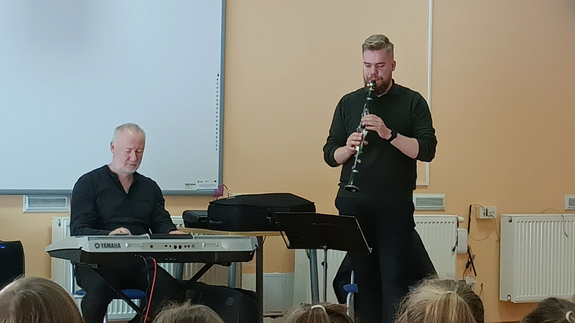 W drugiej części spotkania słuchaliśmy utworów, które pan Michał wykonał na klarnecie. Należy on również do grupy instrumentów dętych drewnianych. Jest podobnie jak rożek basetowy, jednym z najzdrowszych instrumentów, bardzo pozytywnie wpływających na rozwój dziecka oraz popularnym i wszechstronnym w muzyce klasycznej, folkowej, rozrywkowej i jazzowej.