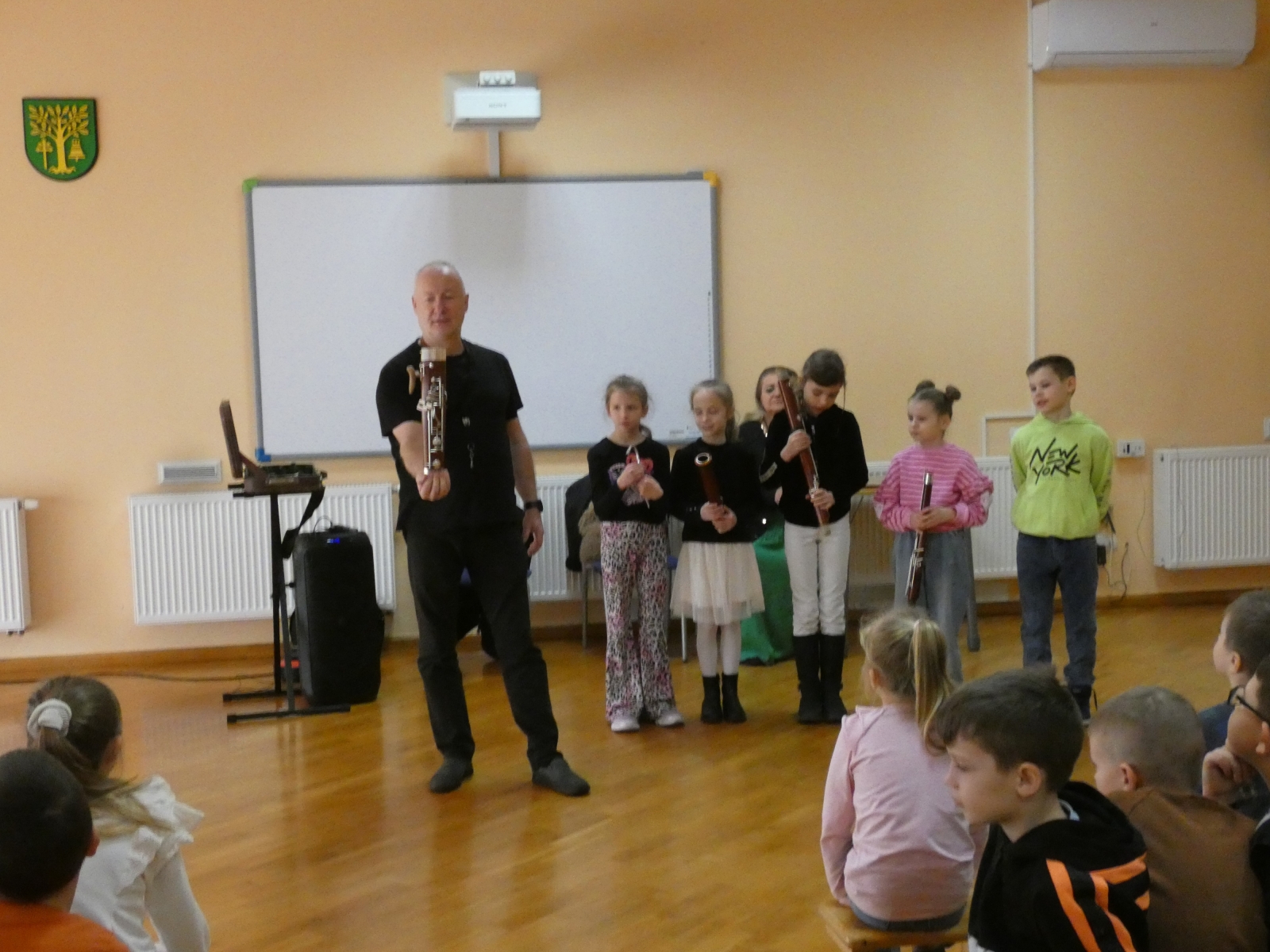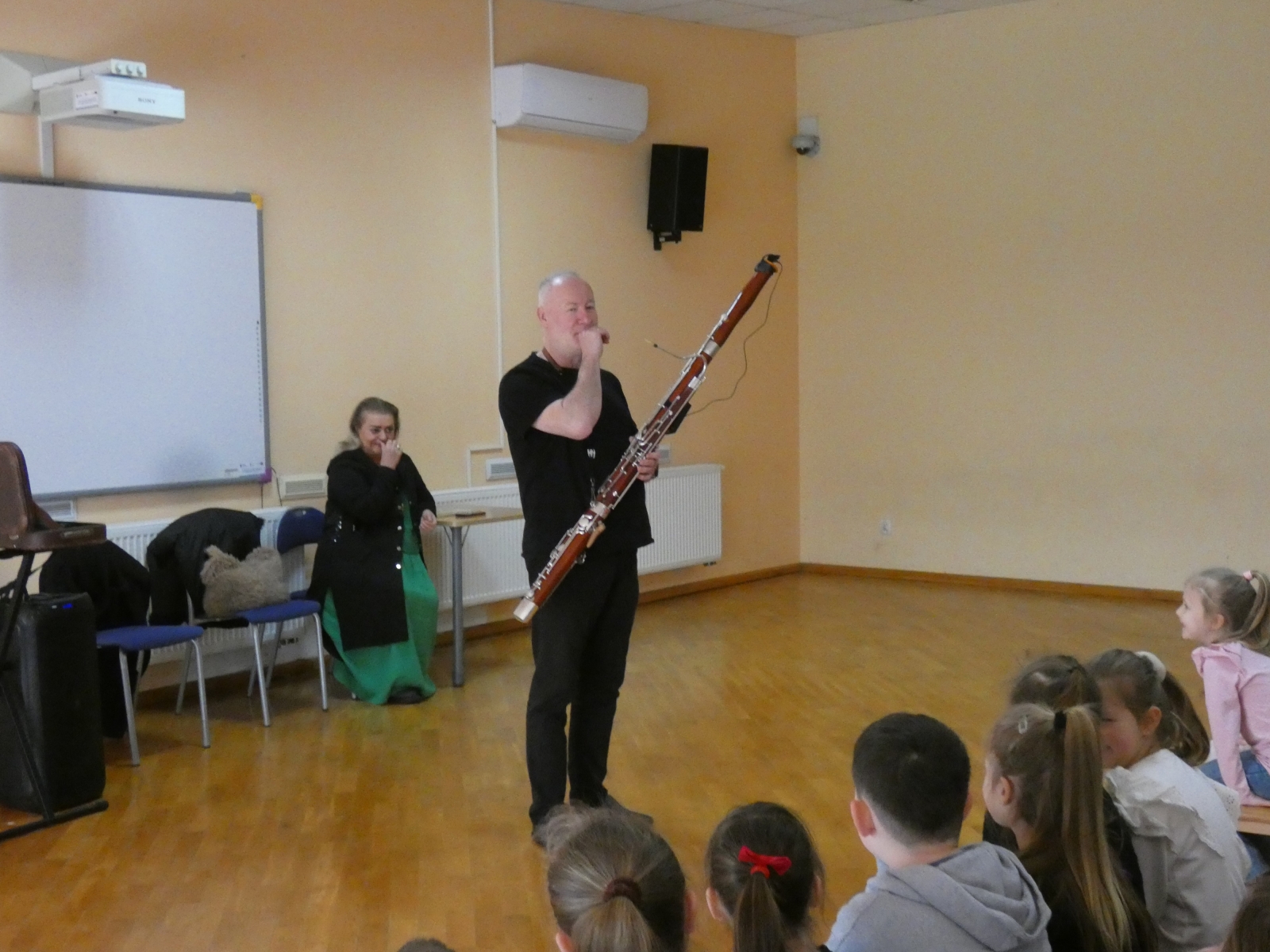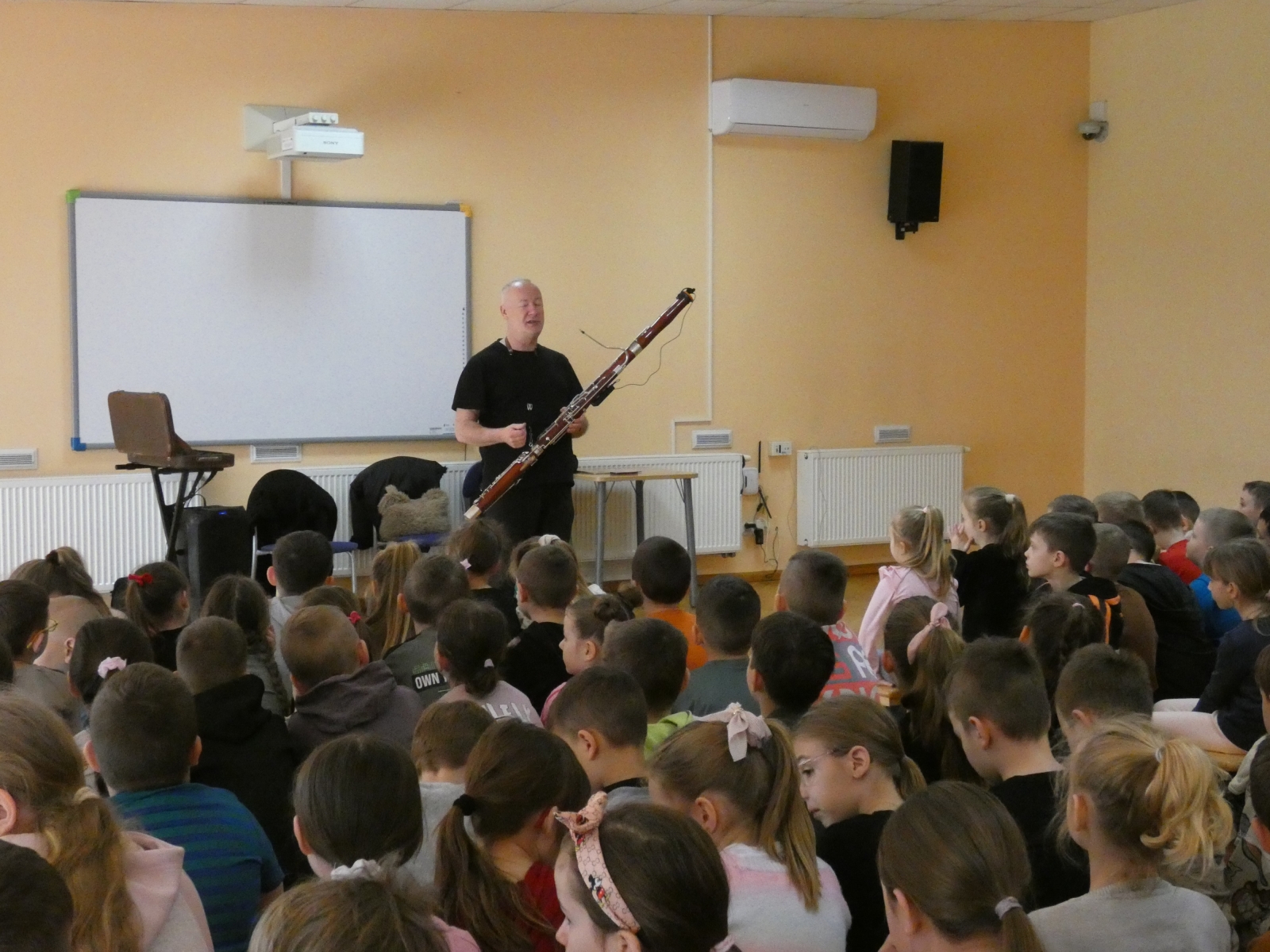 14 marca b.r. w naszej szkole odbyła się kolejna audycja muzyczna zatytułowana „Co to za instrument?”. Uczniowie poznali nowy instrument z rodziny dętych drewnianych - fagot, o którym mówi się, że jego brzmienie ma właściwości terapeutyczne. Następnie prowadzący omówił budowę instrumentu. Rozkładając fagot na poszczególne części podawał ich nazwy: stroik, es, czara głosowa, rura basowa, skrzydło i stopa. Później dzieci wysłuchały radosne utwory takie jak: „Wesoły wieśniak”, „ Tarantella”, „Tijuana”. W trakcie audycji pani Ewa dla ułatwienia zapamiętania nazwy instrumentu nauczyła uczniów rymowanki “Graj kocie, graj kocie - na fagocie”. Na zakończenie audycji dzieci z opiekunami wysłuchały muzycznego utworu cza – cza pochodzącego z dzikiego zachodu pt. „Moje małe buciki”, przy którym wszyscy wesoło się bawili.