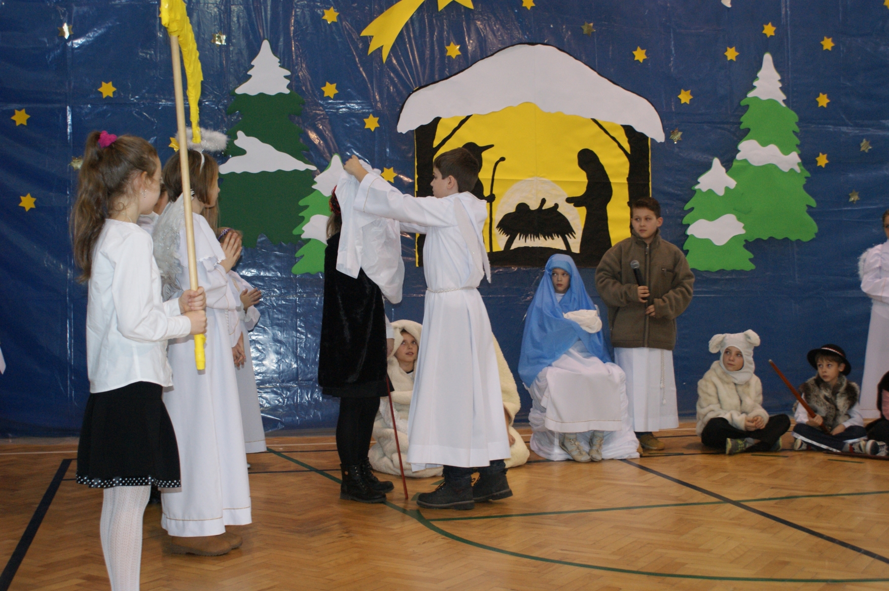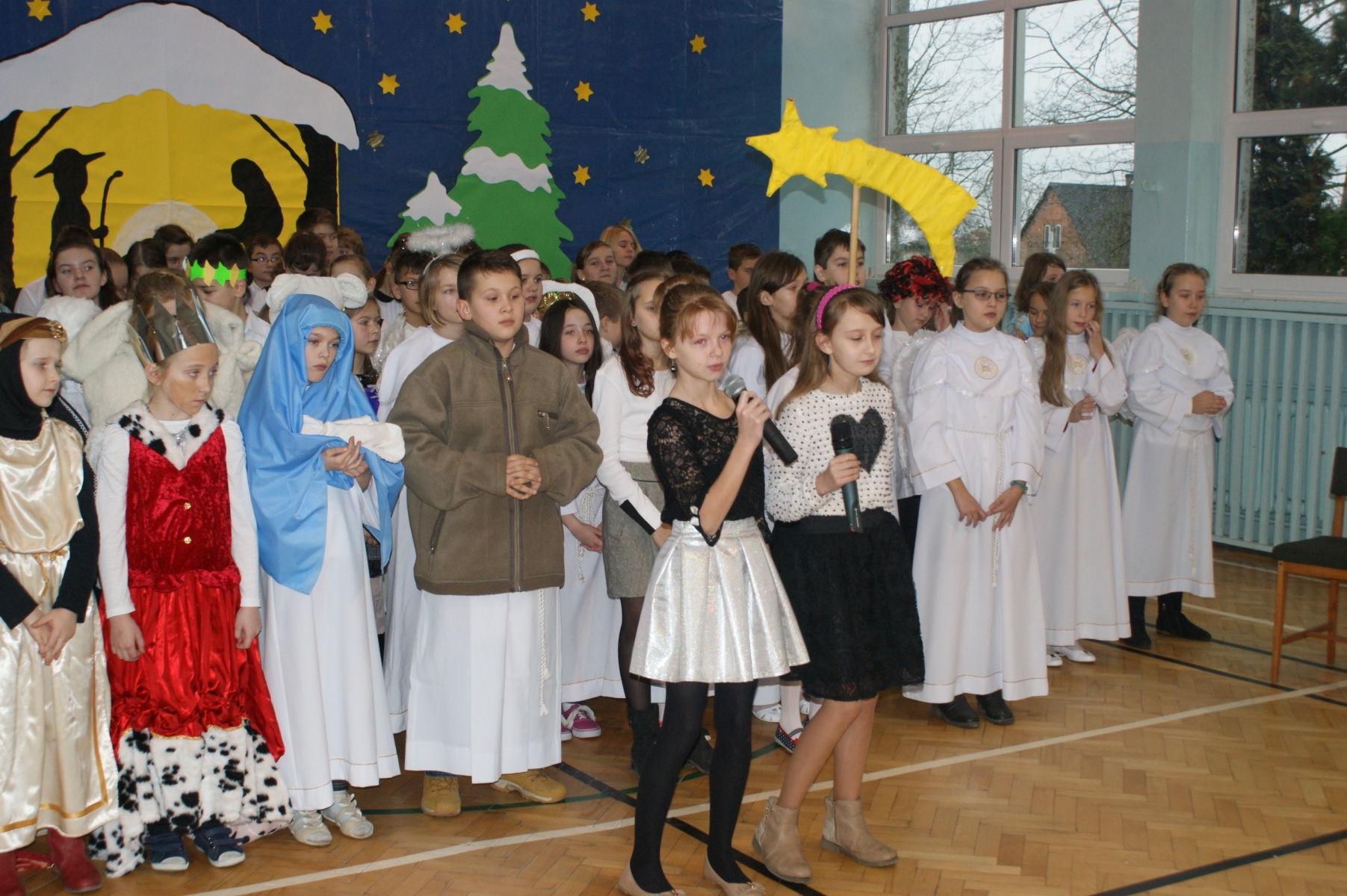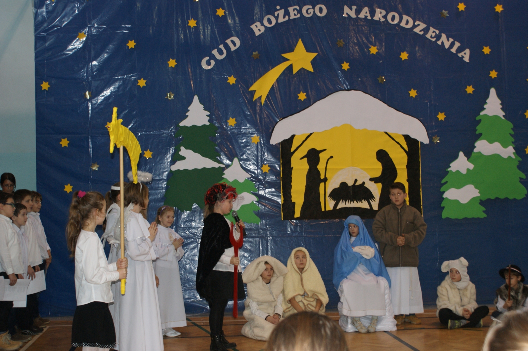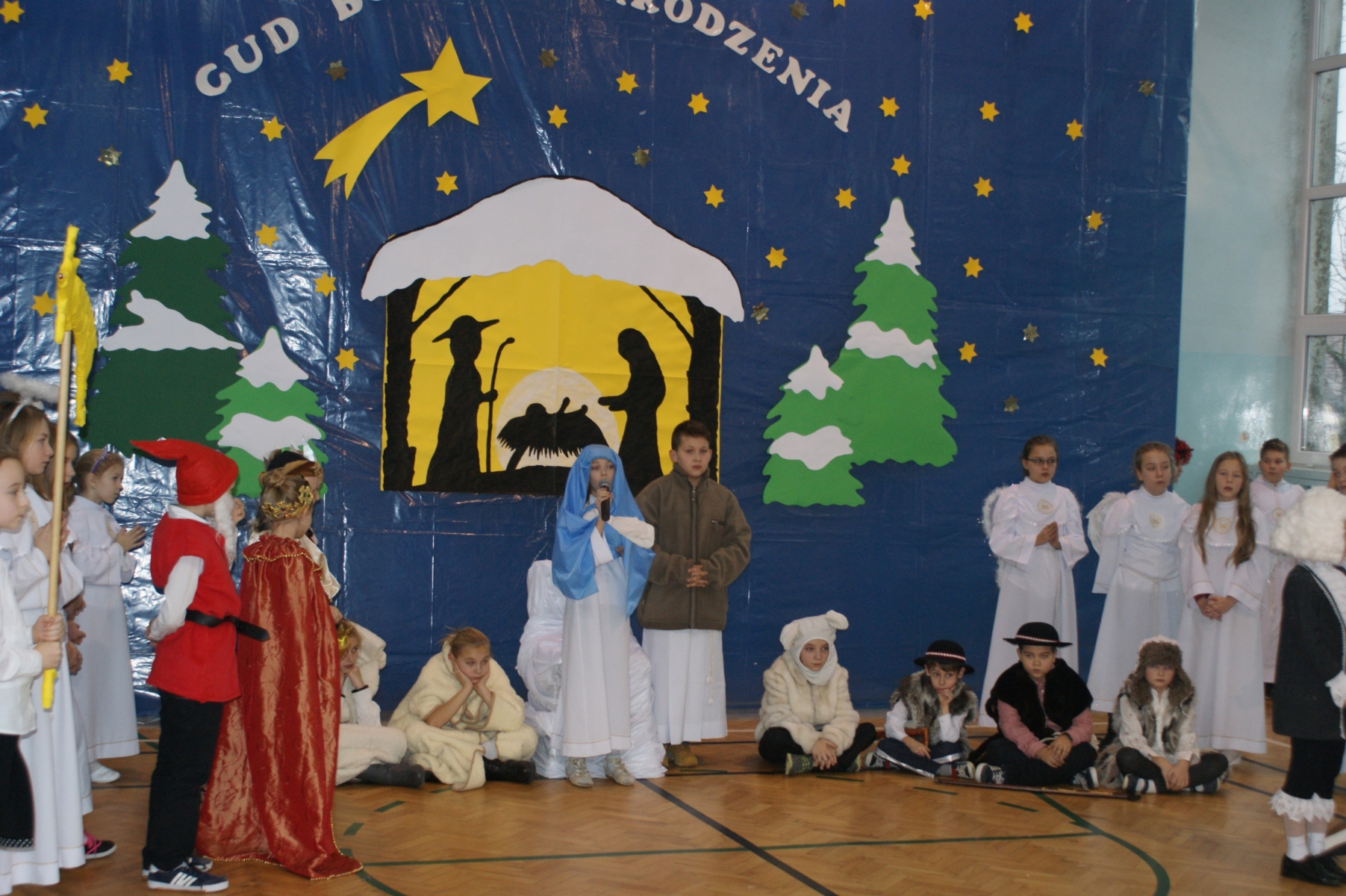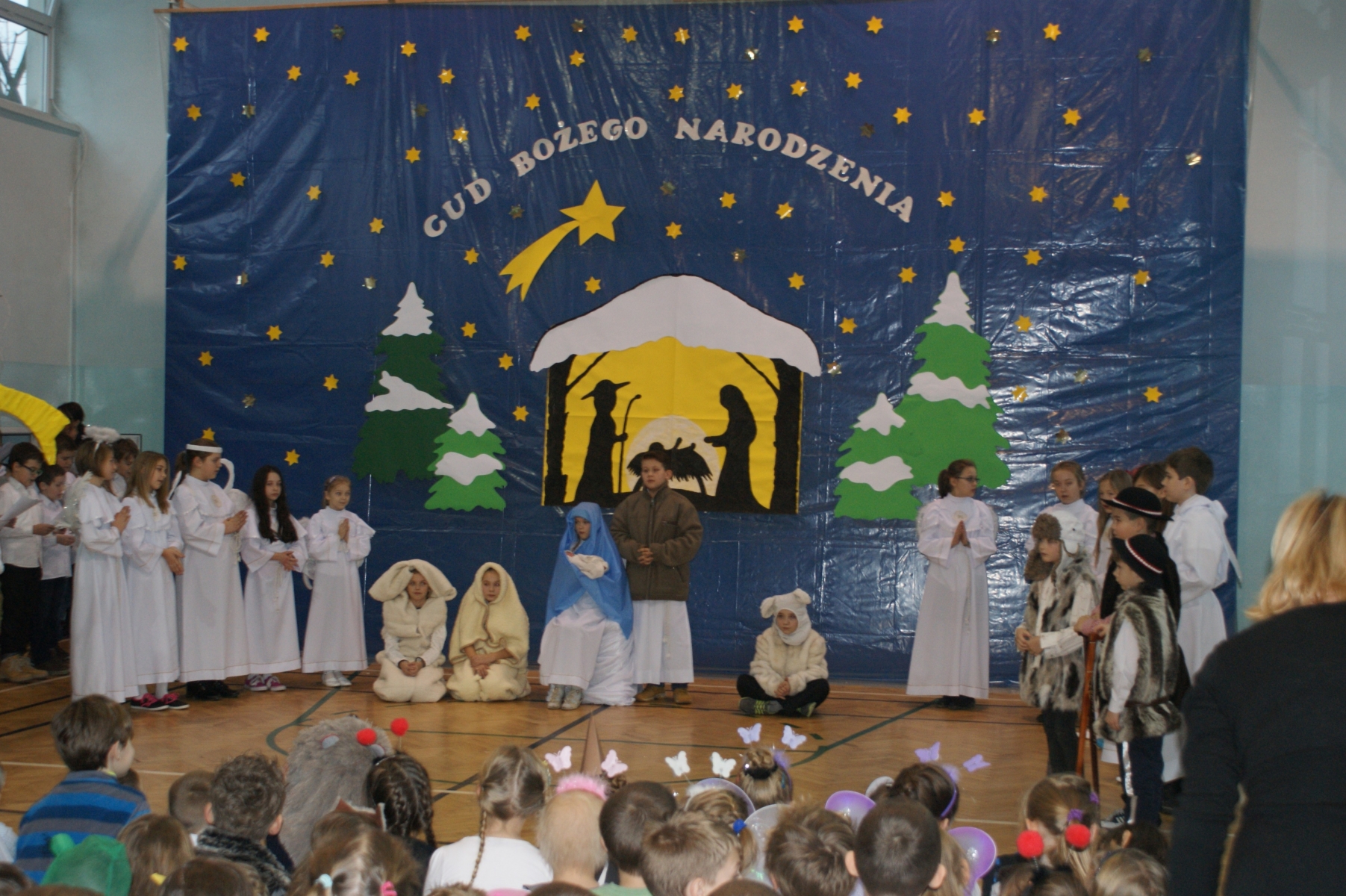 Jasełka przygotowali: ks. Tomasz Smoliński i p. katechetka Małgorzata Przybylak. Przedstawienie przeplatane było pięknymi kolędami w wykonaniu uczniów klas IV – VI pod kierunkiem p. Katarzyny Tomczyk. Na świąteczny nastrój wpływ miała dekoracja wykonana przez p. Emilkę Stefaniak.