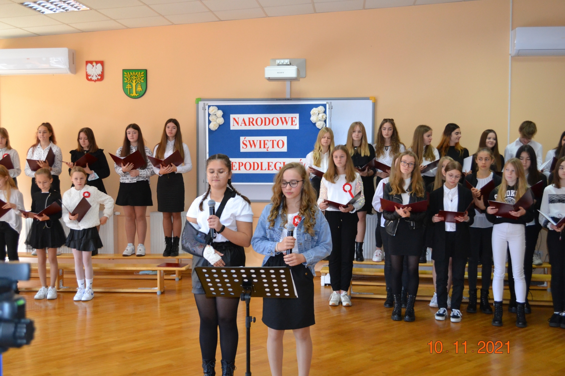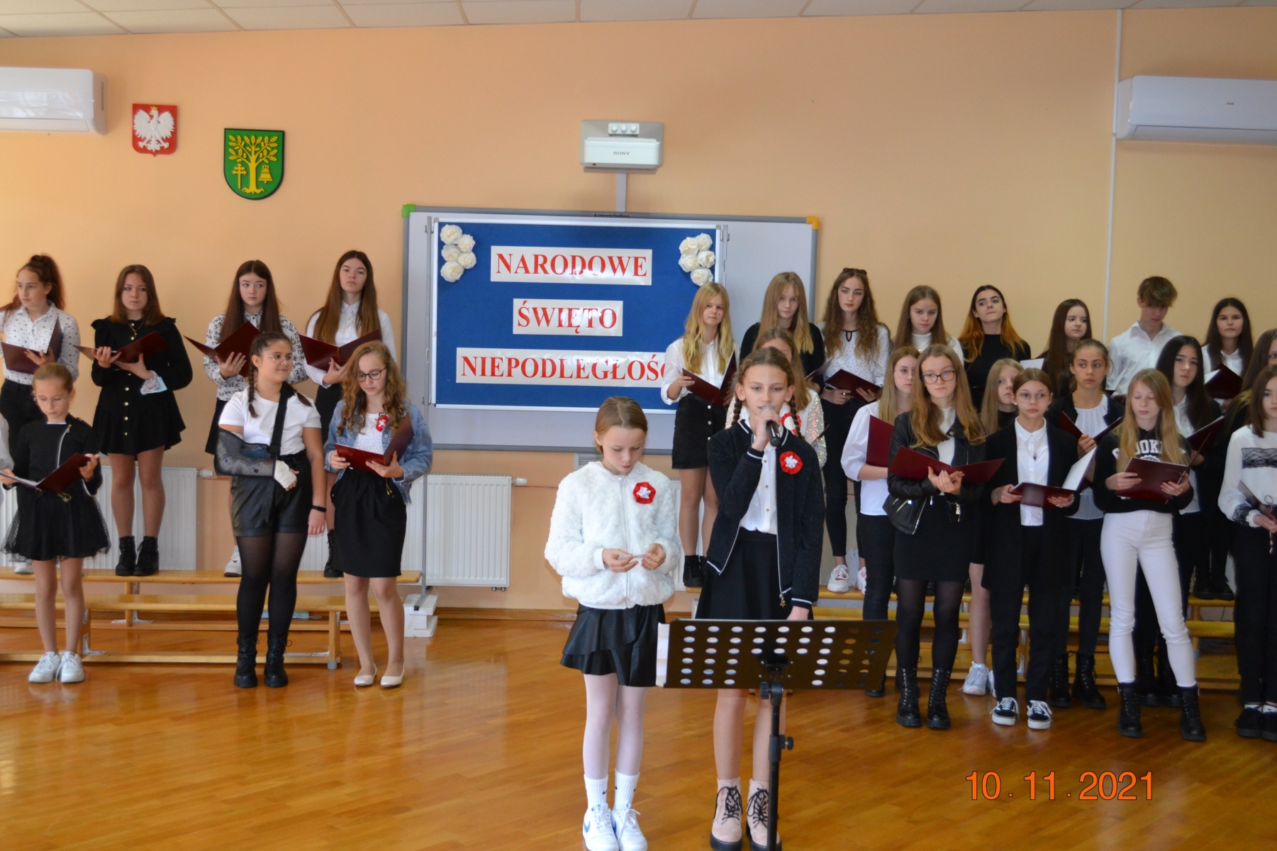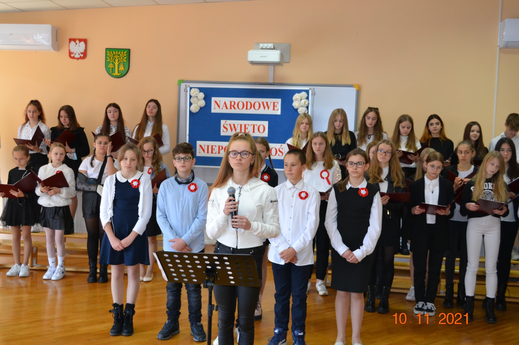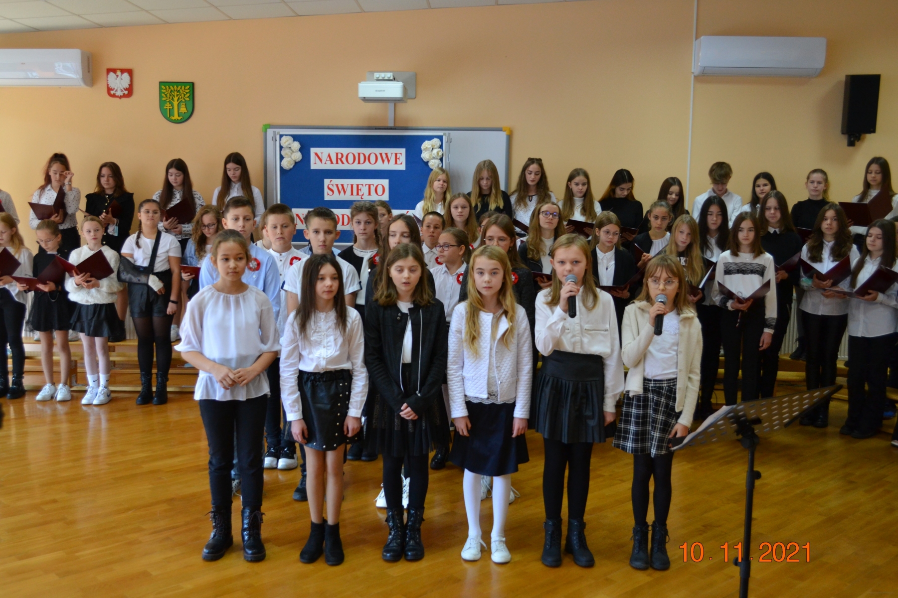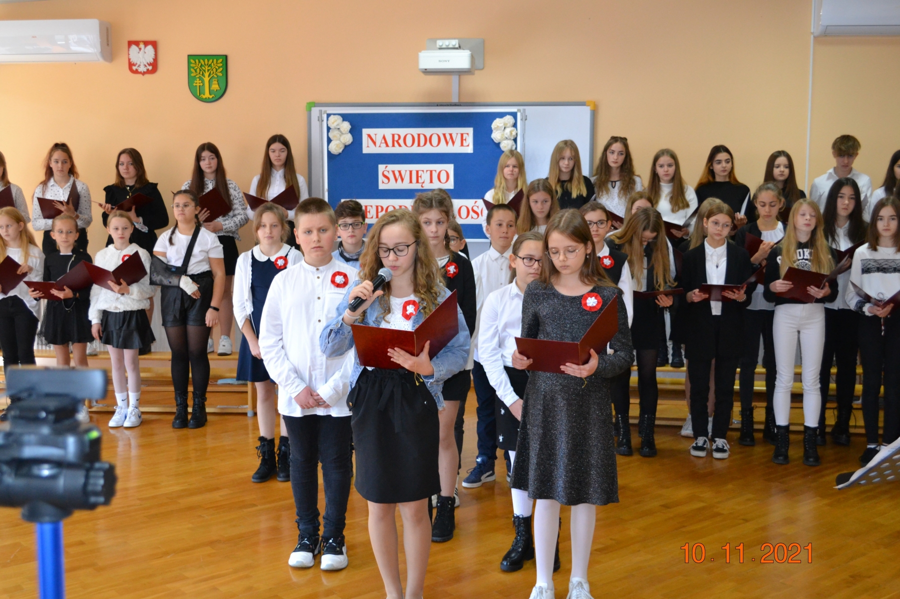 Z okazji Narodowego Święta Niepodległości uczniowie klasy V a , pod opieką wychowawczyni p. Magdaleny Nowickiej, przygotowali montaż słowno – muzyczny, który zaprezentowali podczas uroczystej akademii. Po wprowadzeniu sztandaru i odśpiewaniu hymnu można było usłyszeć piękne wiersze i piosenki patriotyczne, jak również poznać najważniejsze fakty historyczne ukazujące dążenia Polaków do odzyskania niepodległości po 123 latach niewoli. W związku z panującą pandemią uczniowie nielicznych klas mogli obejrzeć występ na żywo ( stosując się do wytycznych co do zgromadzeń grupowych, jak i obostrzeń z tym związanych.), pozostali uczniowie obejrzeli przedstawienie on line w swoich klasach. Mimo utrudnień wszyscy z uwagą wysłuchali słów, które skłoniły do refleksji, były lekcją patriotyzmu i historii oraz wyrazem pamięci o tych, dzięki którym żyjemy dziś w wolnej Polsce.