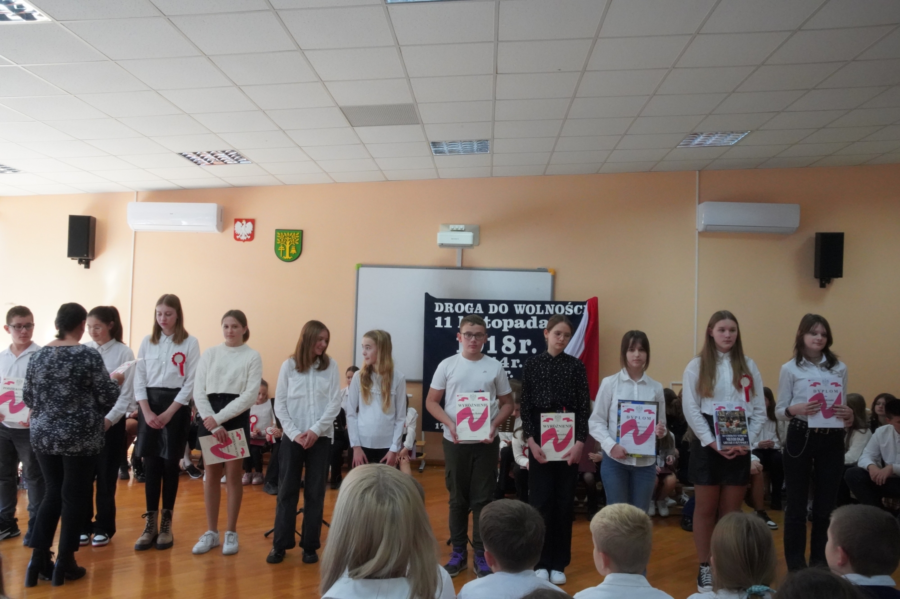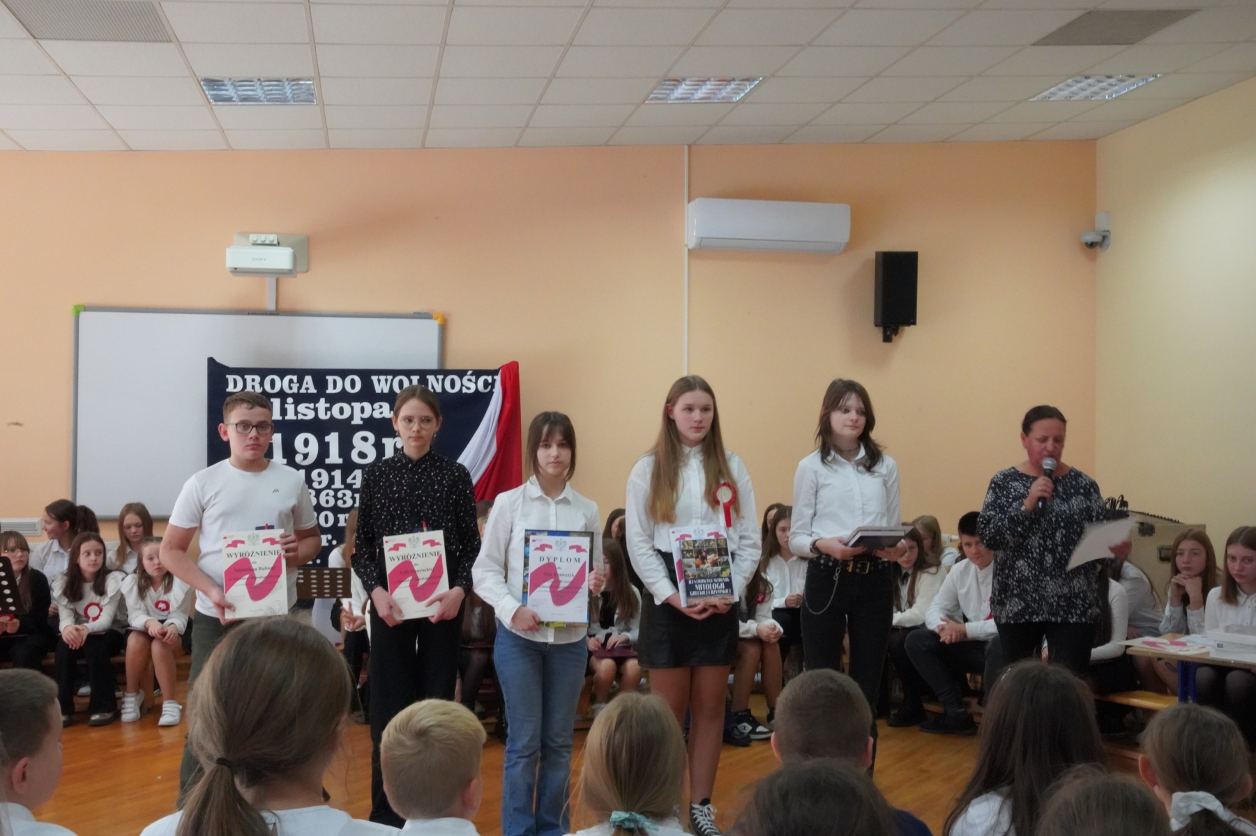 W środę 8 listopada odbył się w naszej szkole konkurs „Dyktando Niepodległościowe”, którego celem jest nie tylko doskonalenie umiejętności poprawnej pisowni, ale także kształtowanie świadomości językowej uczniów oraz upowszechnianie wiedzy na temat roli języka polskiego w zachowaniu tożsamości i rozwoju kultury narodowej. Konkurs skierowany był do uczniów klas VI – VIII. Najlepsi uczniowie otrzymali dyplomy i nagrody książkowe, uczniowie wyróżnieni – drobne upominki. Wyniki konkursu :I miejsce - Alicja Kraska z klasy VIIb, II miejsce - Zuzanna Błaszczyk z klasy VIIIa, III miejsce – Maja Krawczyk z klasy VI b Wyróżnienie - Zofia Nawrocka z klasy VII a, Sebastian Rabiega również z klasy VII a. Wszystkim uczestnikom gratulujemy i życzymy dalszych sukcesów.