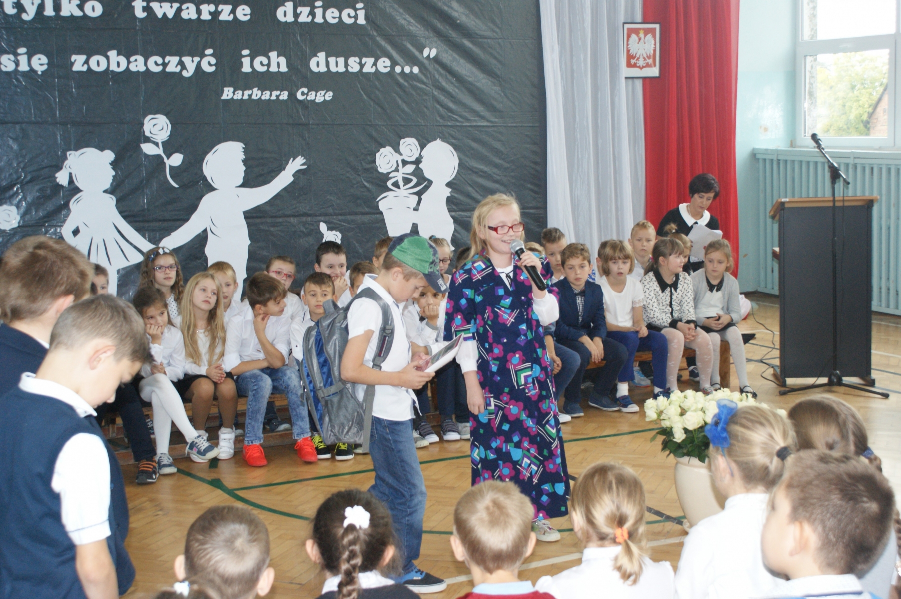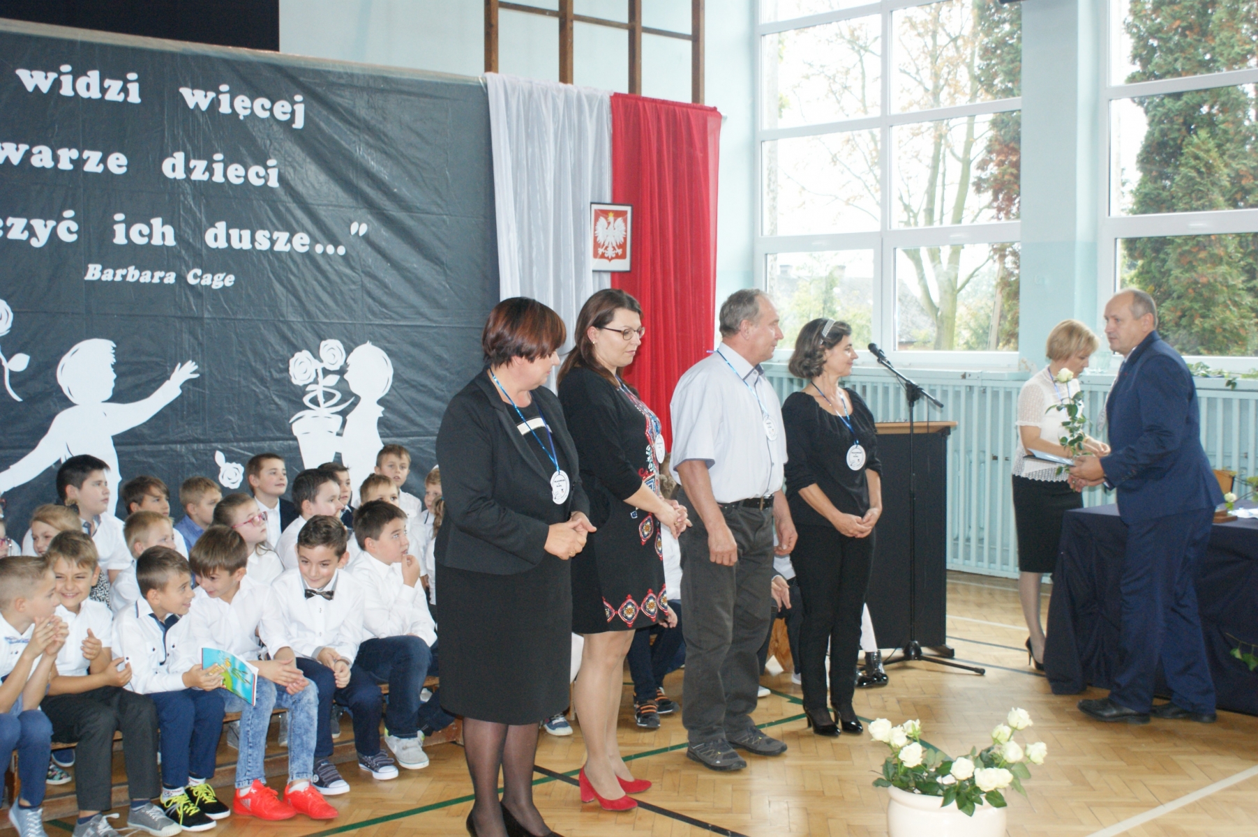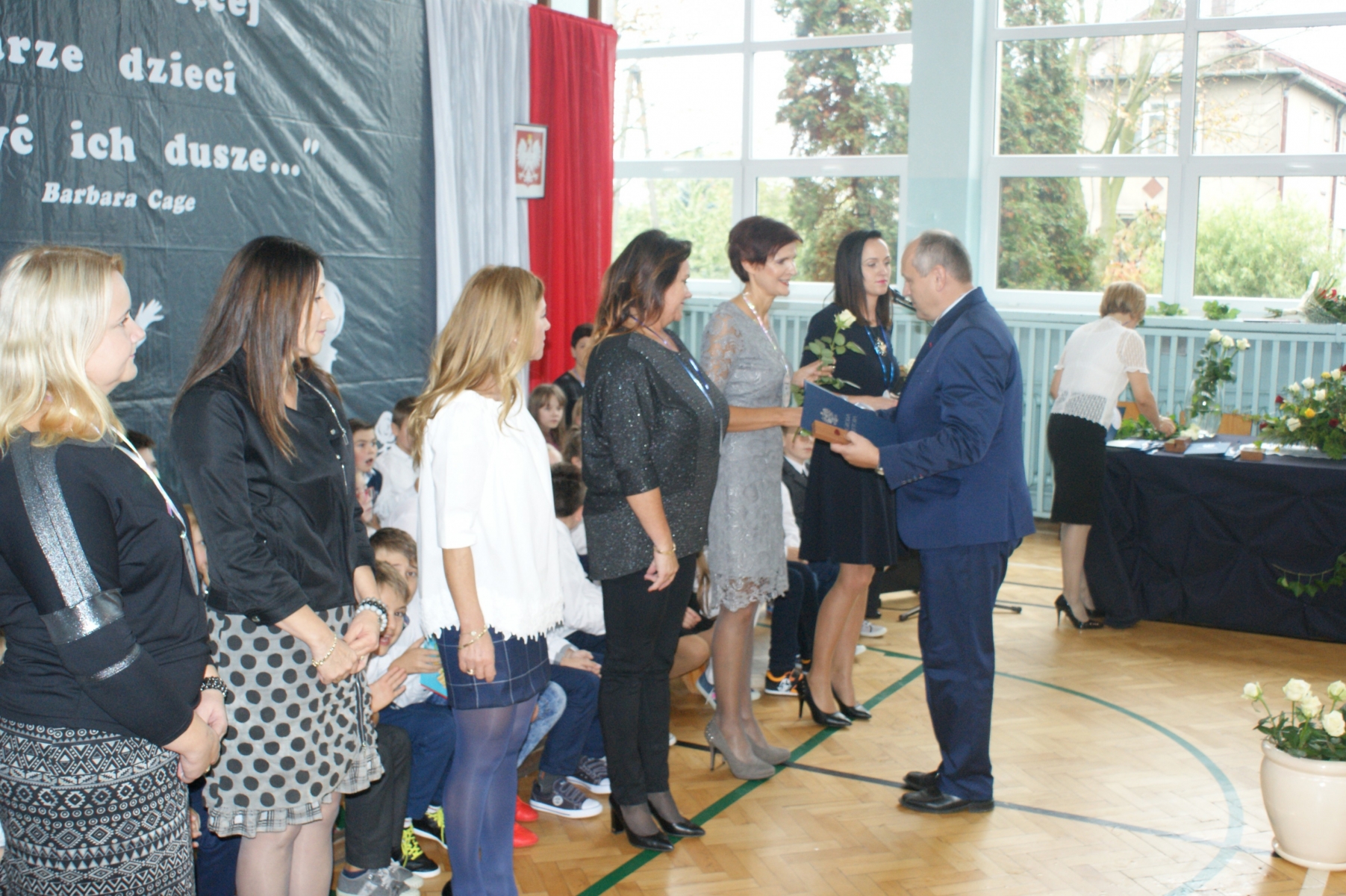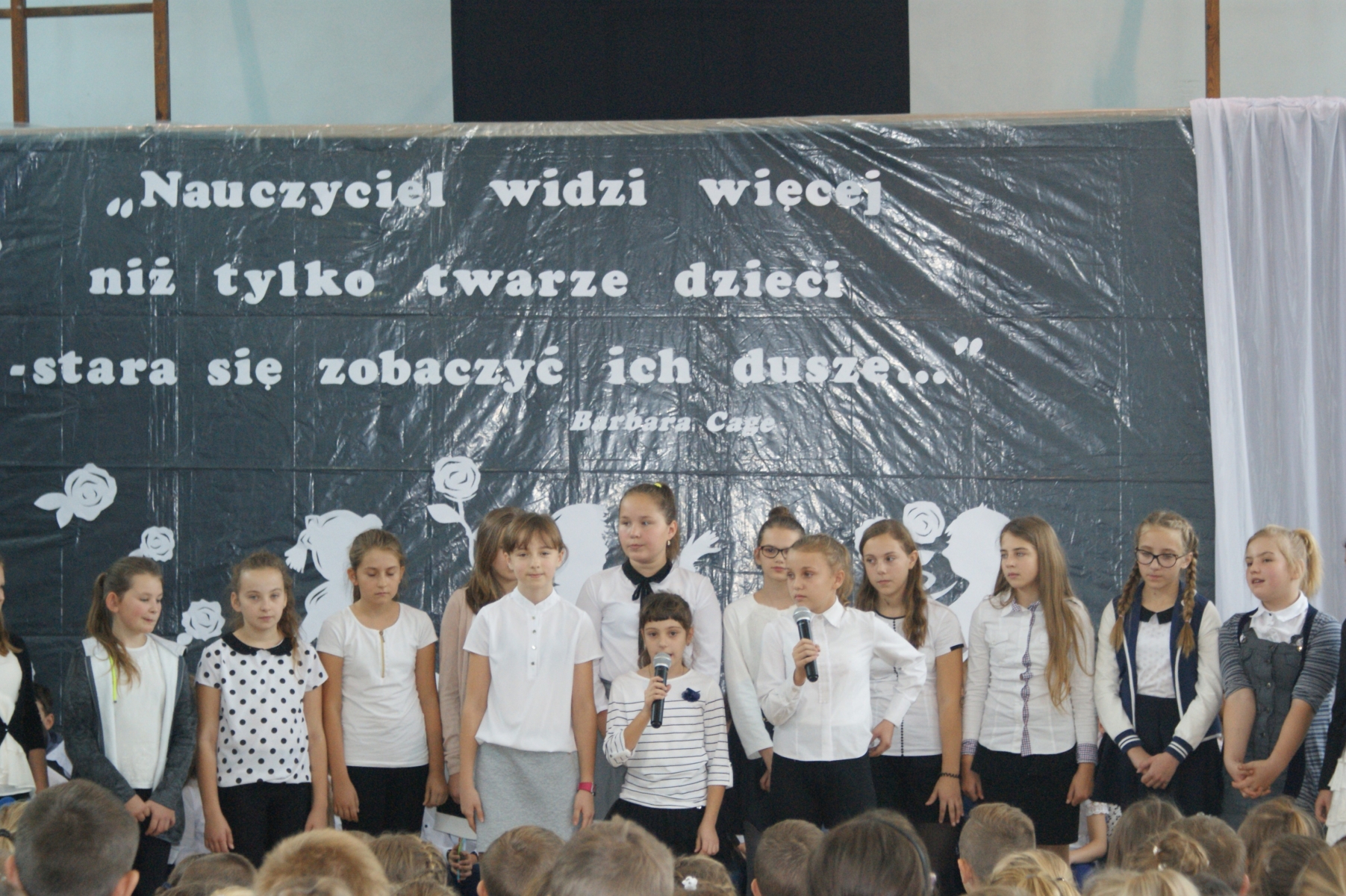 Uczniowie recytowali wiersze, śpiewali piosenki, były też fragmenty z humorem. W swoich słowach zwracali uwagę na to, że praca nauczyciela to trudna droga, a trud związany z krzewieniem wiedzy jest często niedoceniany. Podkreślali, że to oni wskazują właściwą drogę, po której uczniowie mają w przyszłości kroczyć, a wiedza, którą zdobywają wychowankowie rysuje przed nimi nowe horyzonty i otwiera wiele do tej pory zamkniętych drzwi. To nauczyciele - wychowawcy uczą dzieci szacunku do drugiego człowieka i wiary we własne siły. Potrafią swoim postępowaniem rozładować napiętą sytuację, powodują, że świat staje się znośniejszy. Uczniowie w swoich słowach dziękowali za to, że nauczyciele kochają dzieci po prostu: te grzeczne i mądre, ale i te niesforne, rozgadane, a czasem po prostu niegrzeczne i leniwe… trzeba lubić z nami być i trzeba chcieć pokazywać nam świat… Trzeba po prostu urodzić się nauczycielem. Za wkładany trud i pracę, Pan Dyrektor Marek Nowicki nagrodził Nauczycieli i Pracowników: Ewę Stelmaszak, Marię Prentczyńską, Małgorzatę Wągiel, Julitę Muszalską, Izabelę Bartczak - Klimek, Justynę Balcerzak, Urszulę Kamińską, Emilię Kapustę, Henrykę Bogacką, Barbarę Wielgocką i Andrzeja Przytułę.