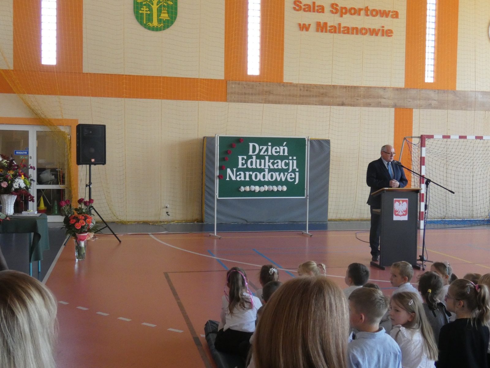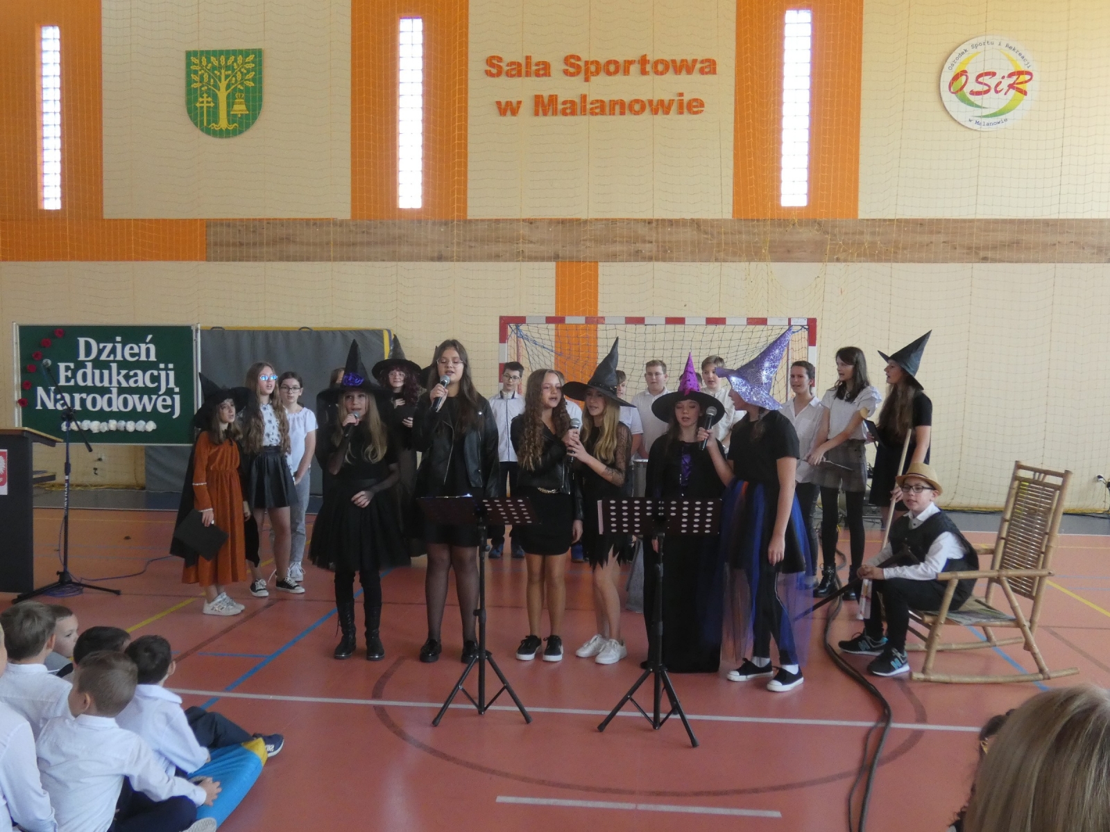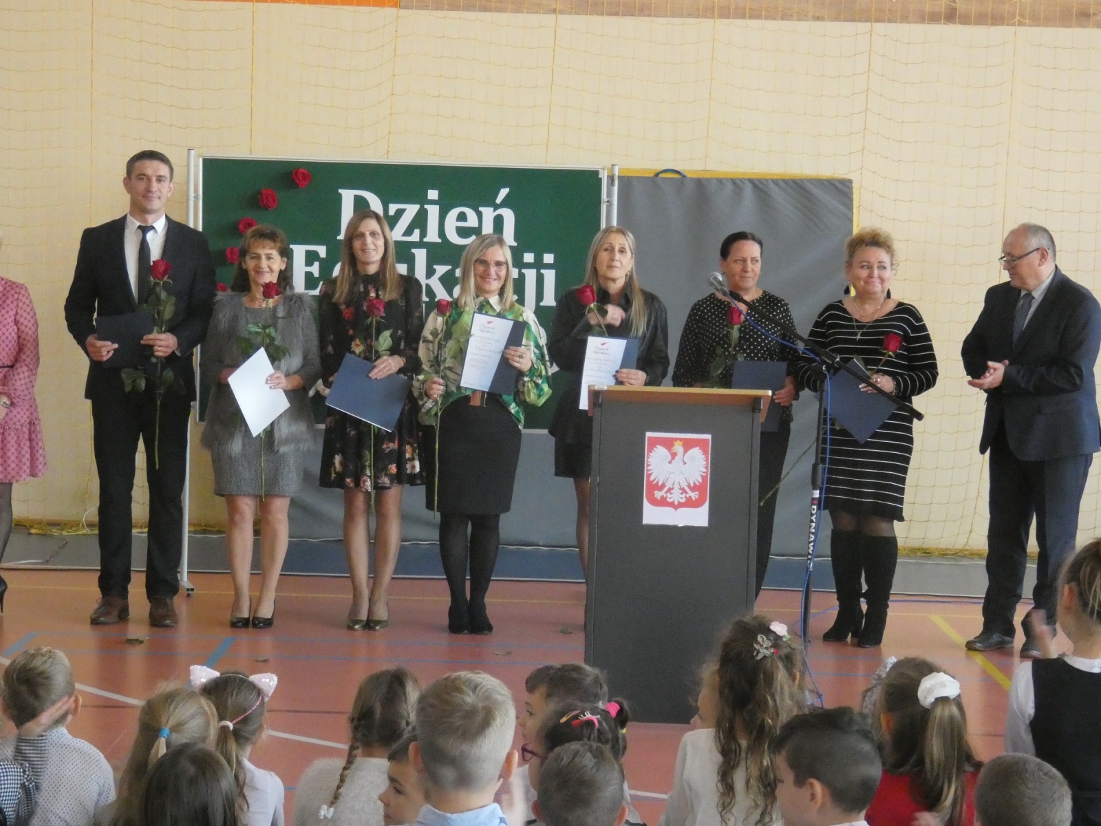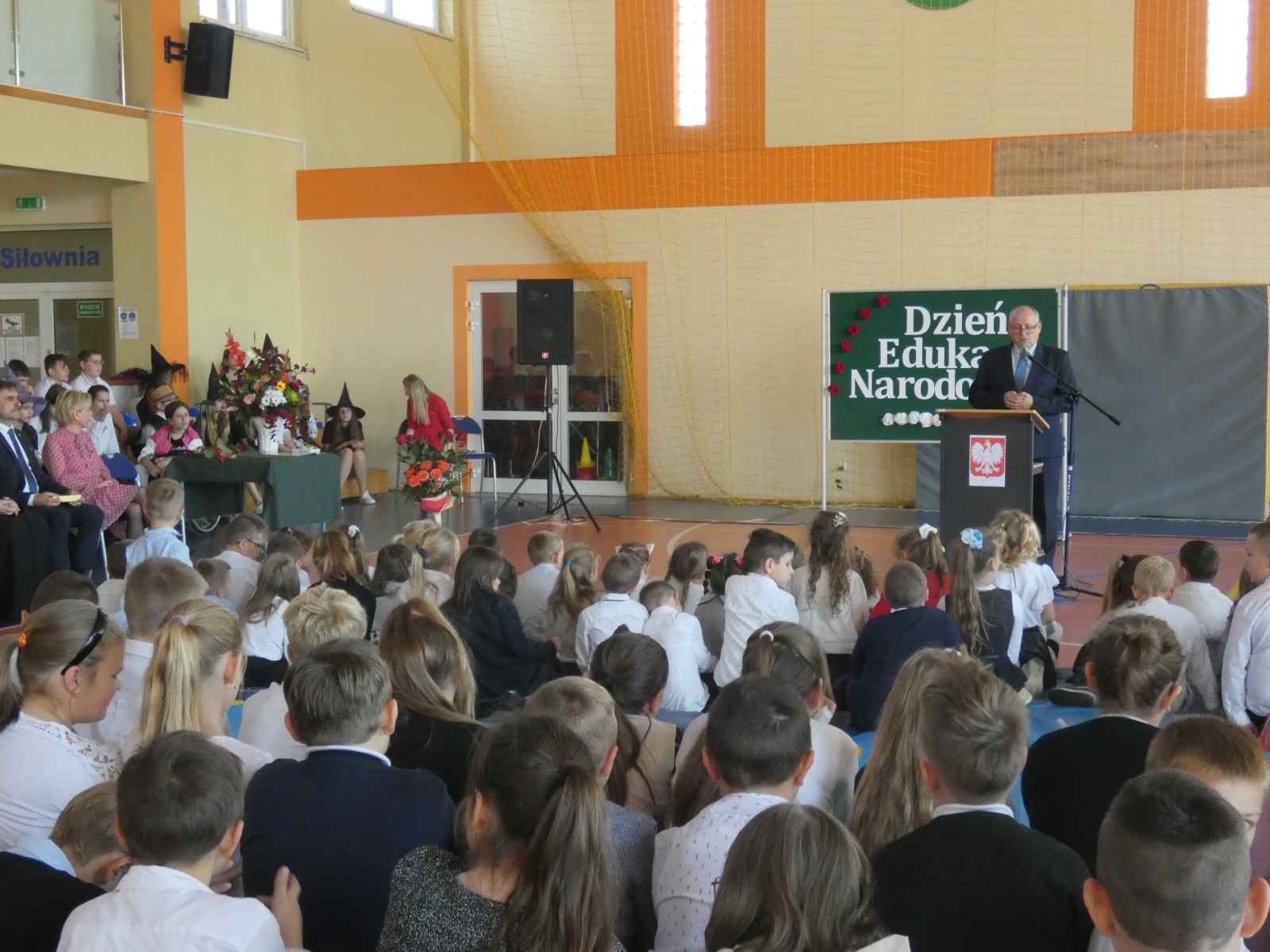 Zaraz po odśpiewaniu hymnu polskiego głos zabrał pan dyrektor Marek Nowicki, który wręczył również nagrody. Uczniowie klasy 6b odegrali scenkę, w której uświadomili nam jak ważną osobą jest nauczyciel. Następnie można było usłyszeć klasową piosenkę "Hej Sokoły" oraz podziękowania skierowane do nauczycieli. Wystąpiły również: Maja Szamburska, Maja Kubiak, Dominika Lament z piosenką "Nauczyciel o nas myśli" i Daria Pokrywiecka z piosenką "Wieczorny walczyk". Na koniec zatańczył zespół "Discomax" z układem zadedykowanym nauczycielom.