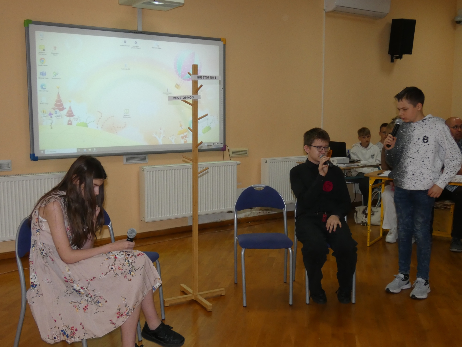 W pierwszej konkurencji uczniowie oglądali scenki po angielsku przygotowane przez uczniów klas VI B i VI A. Następnie każda drużyna losowała kartkę z pytaniami do oglądanych występów.