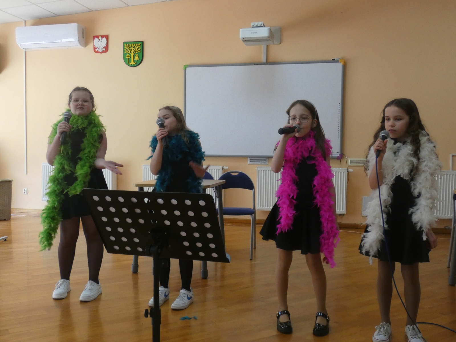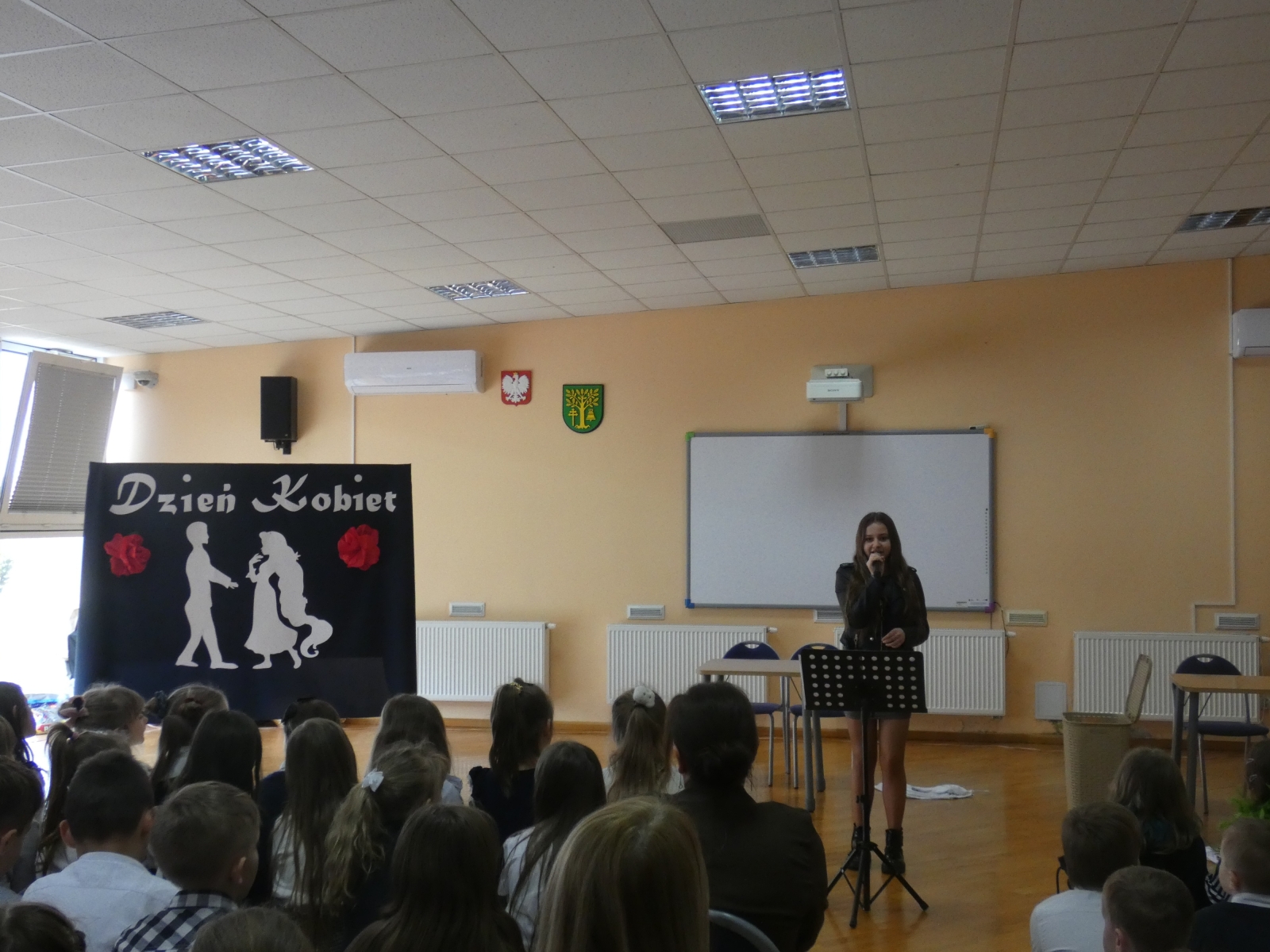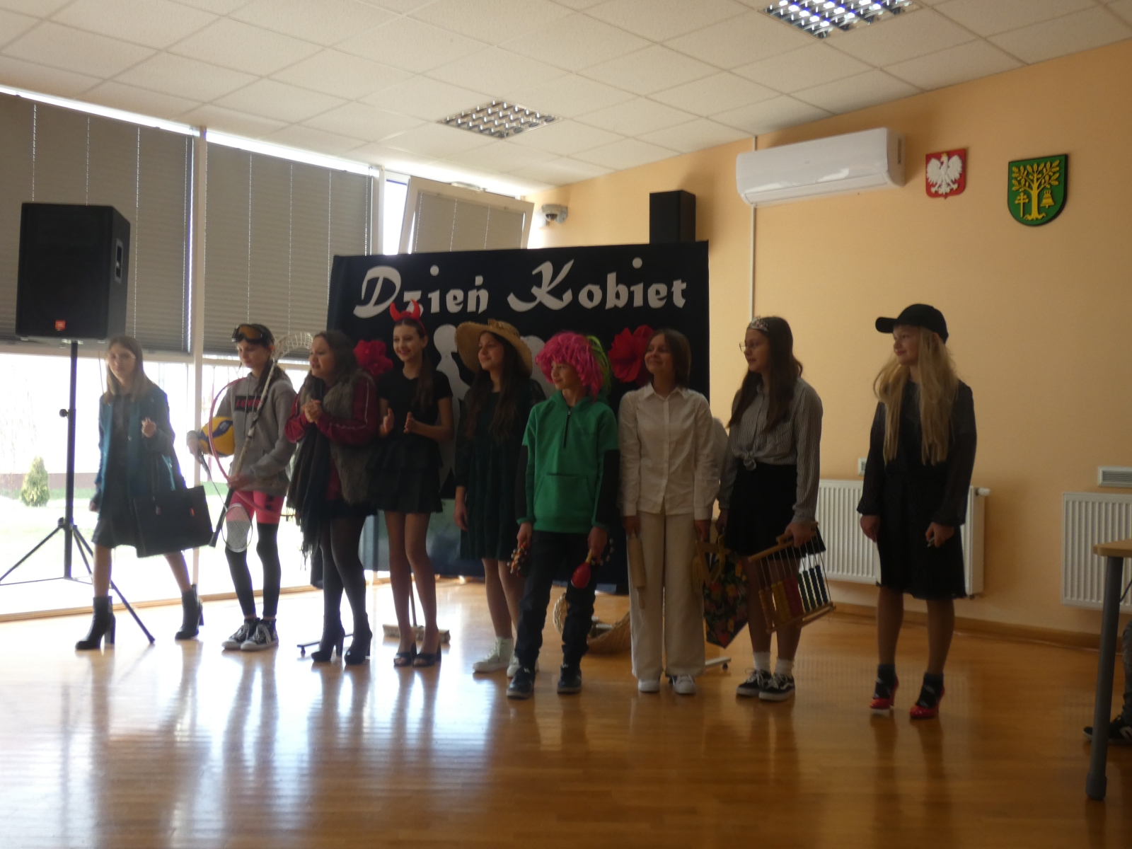 Z okazji święta naszych koleżanek, uczniowie klasy V b wraz z wychowawcą P. Krzysztofem Mrukiem przygotowali i zaprezentowali 7 marca 2024r. społeczności szkolnej, akademię „Dzień Kobiet na wesoło”, podczas której zaprezentowały się światowej sławy sportsmenki: siatkarka noszącą siatki z zakupami, koszykarka wrzucająca brudne ubrania do kosza, zapaśniczka przygotowująca przetwory na zimę oraz reprezentantka jazdy figurowej na mopie. Dużym zainteresowaniem cieszył się również przygotowany przez najsłynniejszych szkolnych projektantów- pokaz mody dla Pań nauczycielek. Całość przeplatana była piosenkami pięknie wykonanymi przez naszych uczniów przygotowanych przez Panią Katarzynę Tomczyk, której serdecznie dziękujemy.