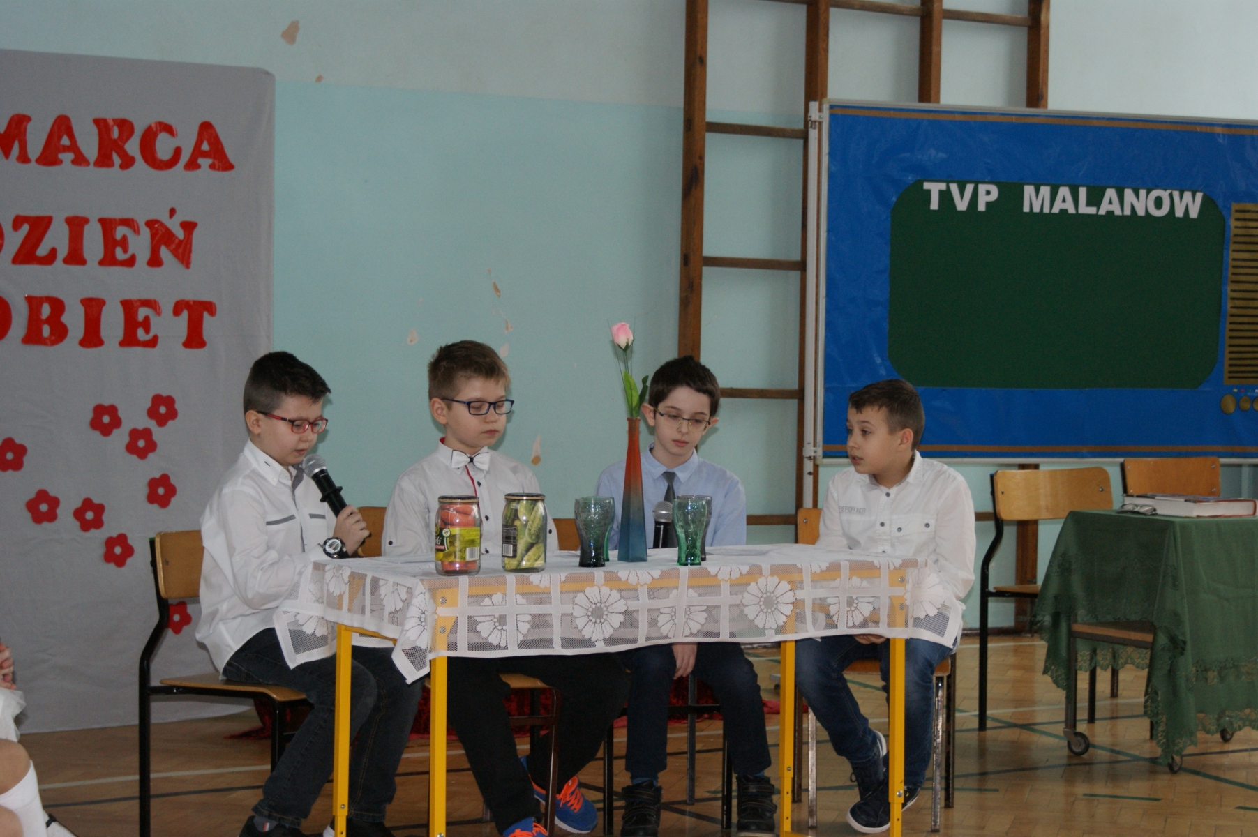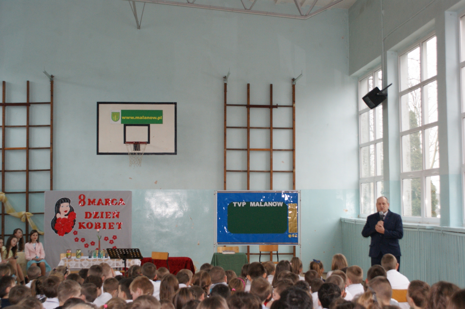 Dzień Kobiet to święto podczas którego mężczyźni obdarowują panie kwiatami, drobnymi upominkami i słodkościami. Z tej też okazji uczniowie z klasy V b pod opieką wychowawczyni p. Magdaleny Nowickiej przygotowali montaż słowno – muzyczny, który zaprezentowali na apelu w czwartek, 9 marca. Podczas swojego występu w zabawny sposób pokazali różne typy kobiet, kobiety w sporcie, był też pokaz mody oraz męskie pogaduchy przeplatane piosenką, skeczami i scenkami rodzajowymi. Na koniec p. dyrektor Marek Nowicki złożył wszystkim Paniom serdeczne życzenia.