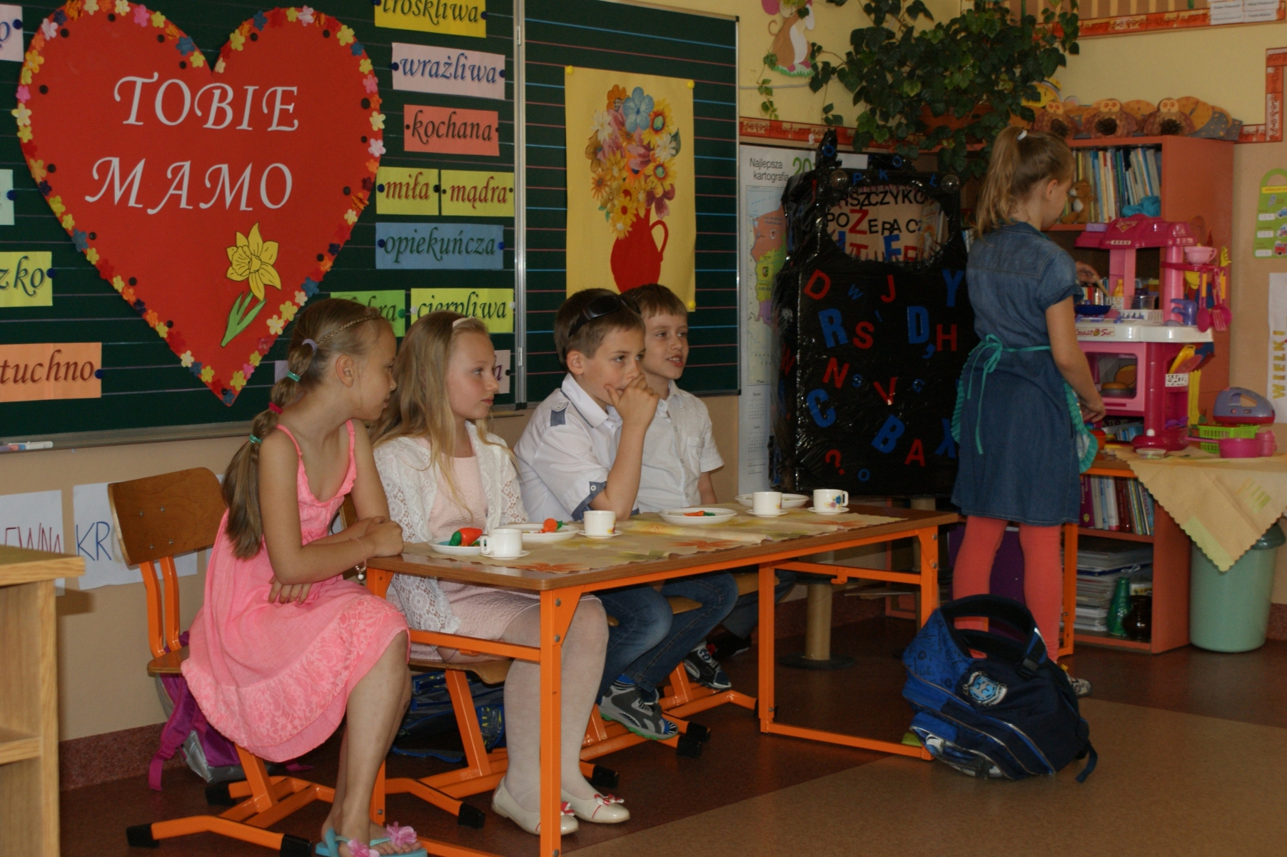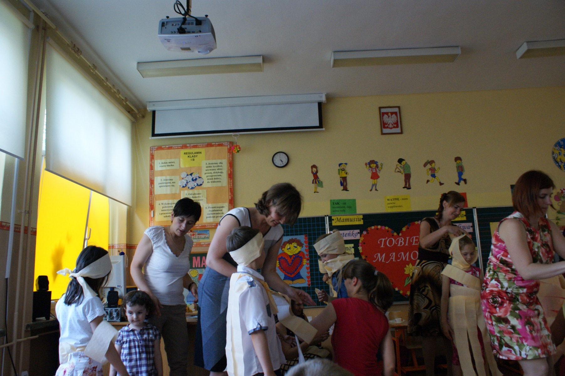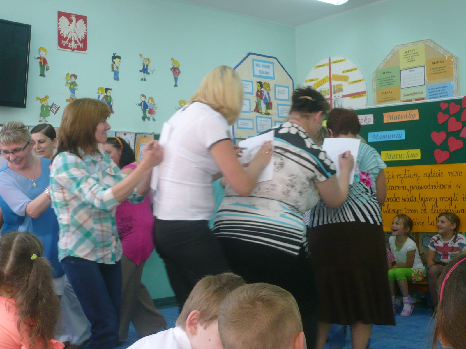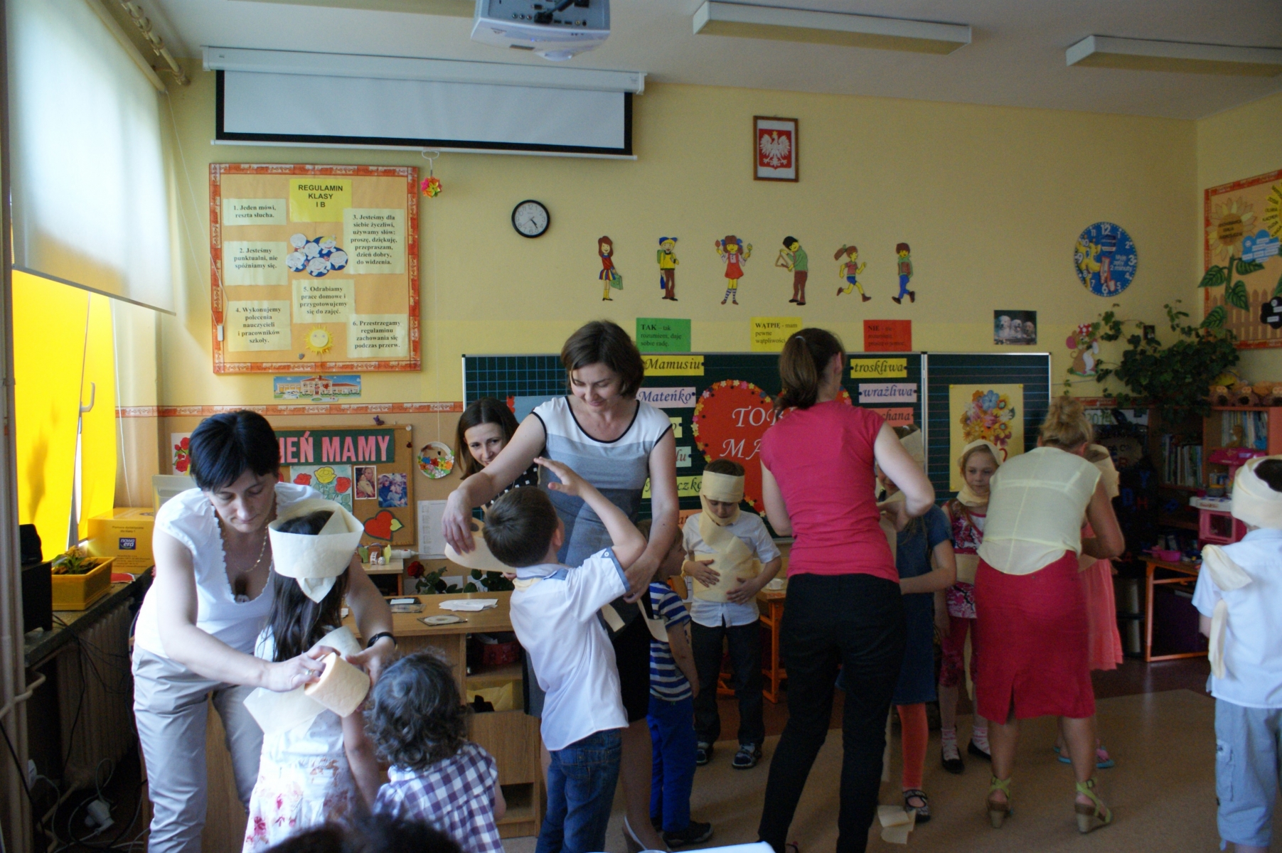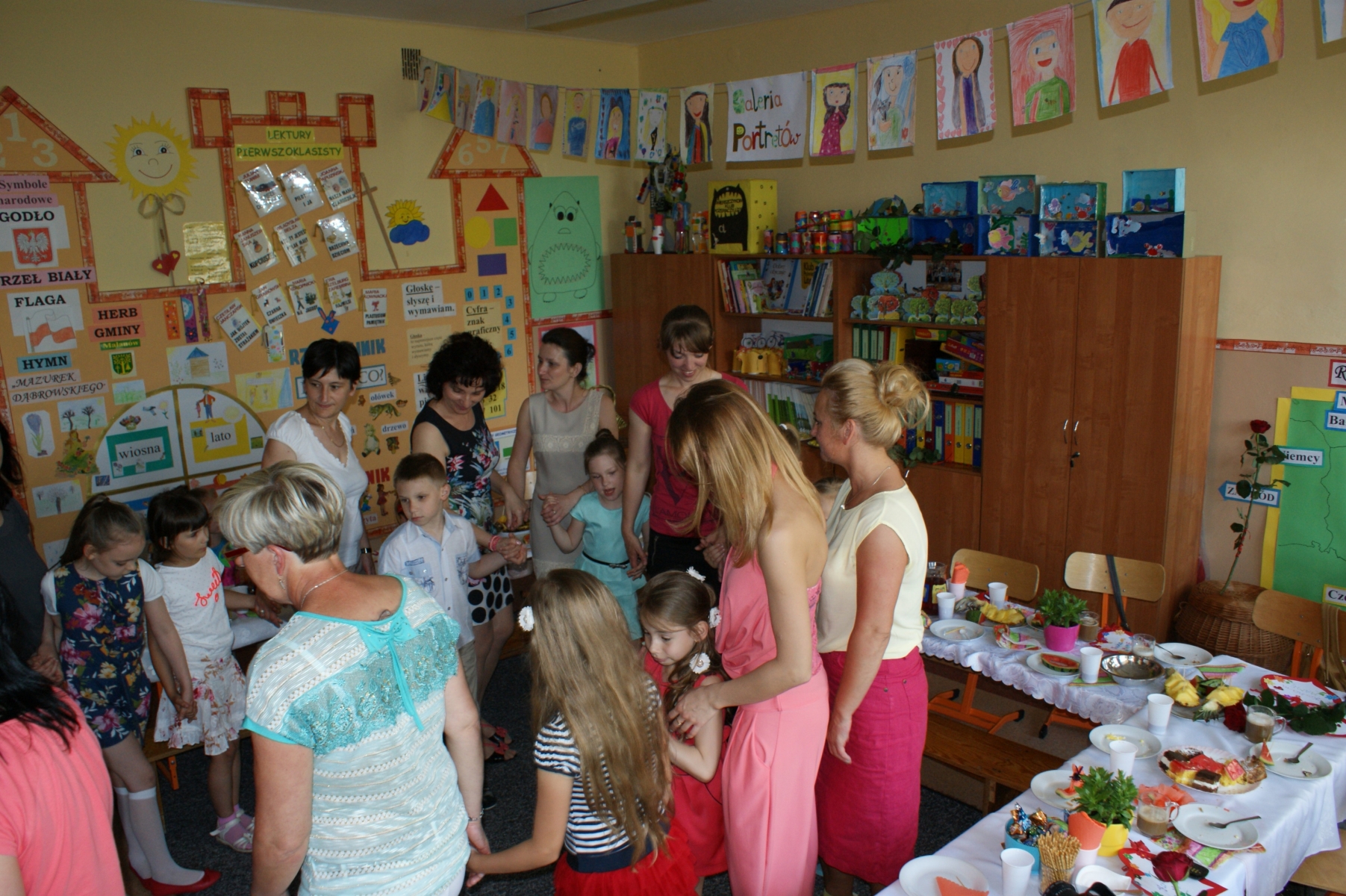 Po części artystycznej wszyscy zasiedli do wspólnego stołu, przygotowanego jak zwykle przez niezawodne mamy. Następnie odbyły się zabawy przy muzyce i konkursy z udziałem mam i dzieci. Było miło i zabawnie. Dużo radości sprawiły konkursy: „Czy znasz swoją mamę?”, „Czy znasz swoje dziecko?”, „Rysowanie portretu podczas tańca”, „Wykonanie stroju ekologicznego”. Spotkaniu towarzyszyły ciepłe rozmowy i serdeczna atmosfera.. Nad sprawnym przebiegiem uroczystości czuwały wychowawczynie klas: Aleksandra Jasnowska i Emilia Andrzejczak.