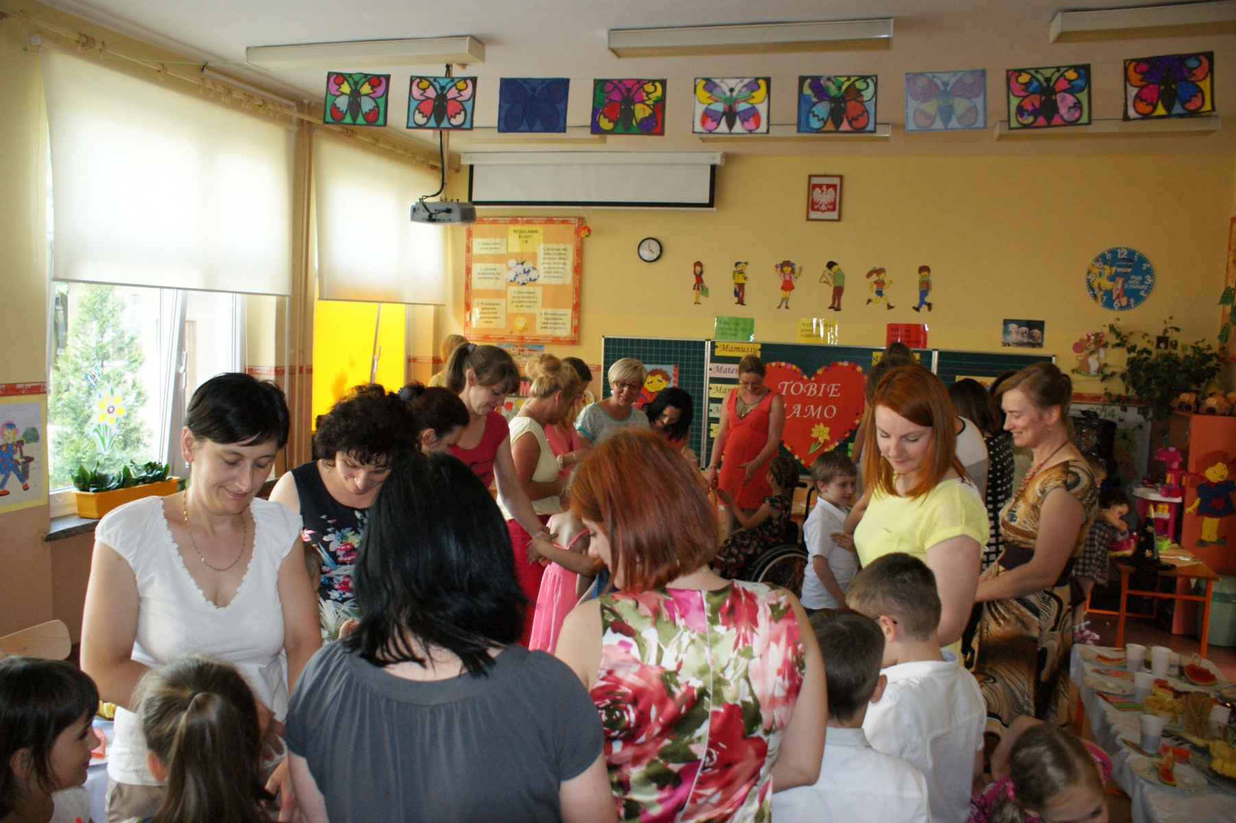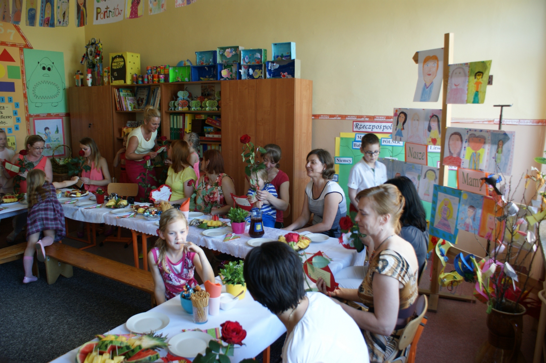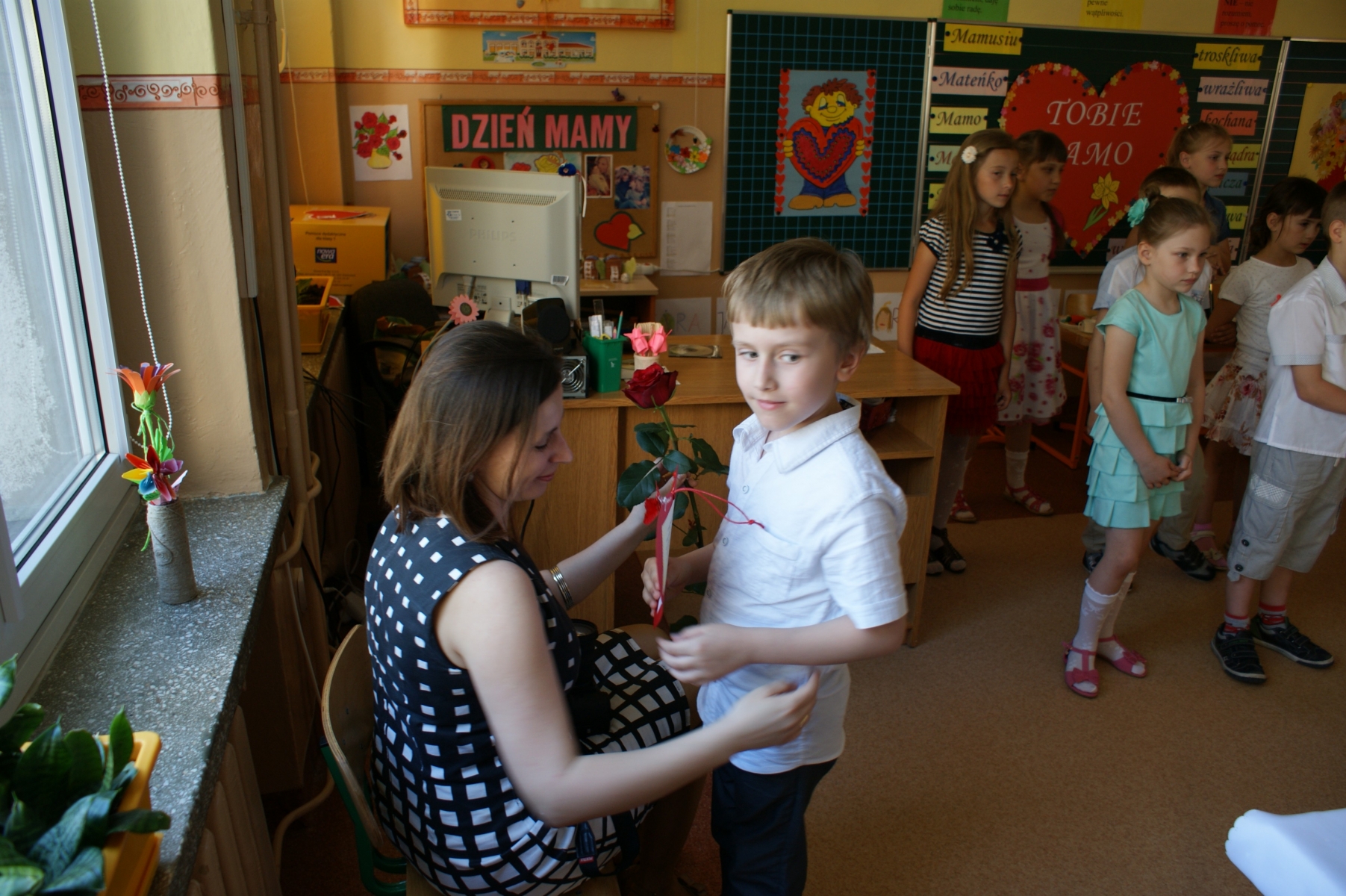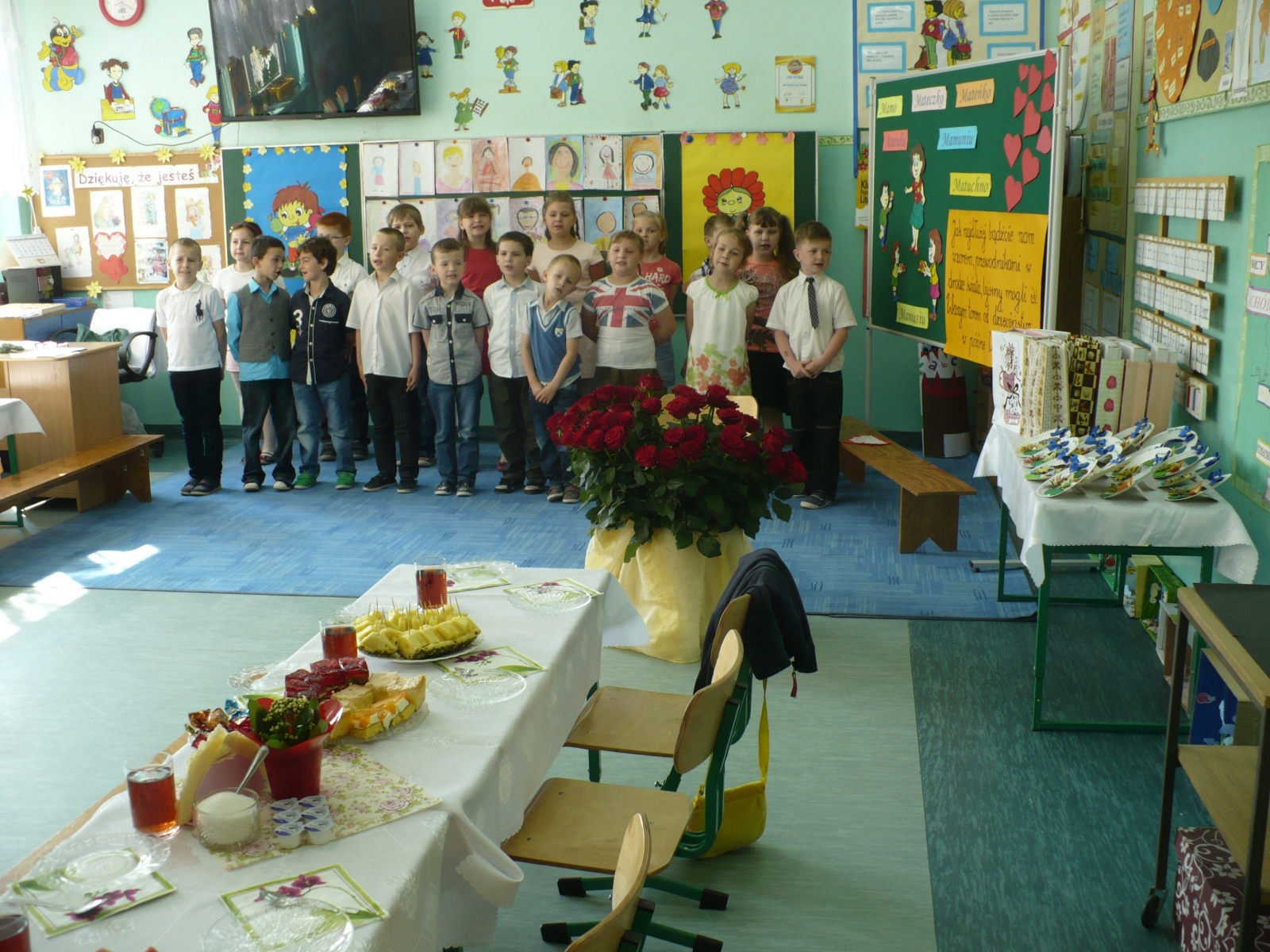 Po części artystycznej wszyscy zasiedli do wspólnego stołu, przygotowanego jak zwykle przez niezawodne mamy. Następnie odbyły się zabawy przy muzyce i konkursy z udziałem mam i dzieci. Było miło i zabawnie. Dużo radości sprawiły konkursy: „Czy znasz swoją mamę?”, „Czy znasz swoje dziecko?”, „Rysowanie portretu podczas tańca”, „Wykonanie stroju ekologicznego”. Spotkaniu towarzyszyły ciepłe rozmowy i serdeczna atmosfera.. Nad sprawnym przebiegiem uroczystości czuwały wychowawczynie klas: Aleksandra Jasnowska i Emilia Andrzejczak.