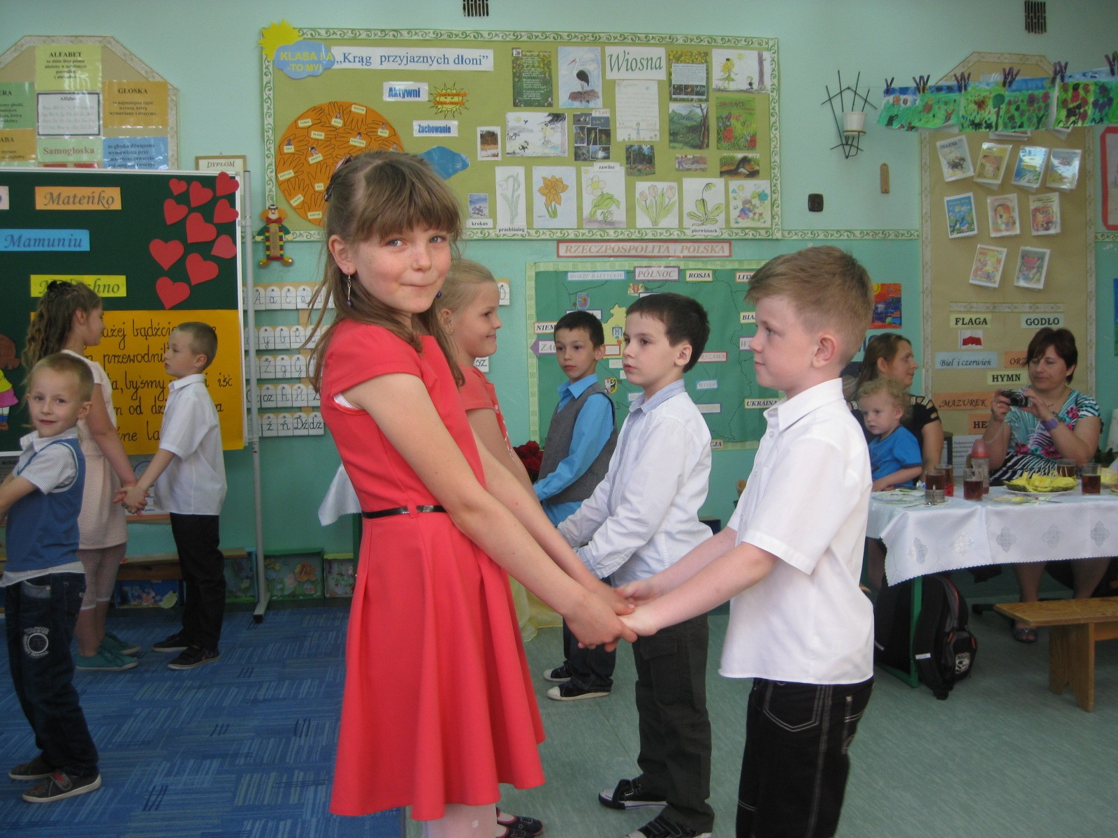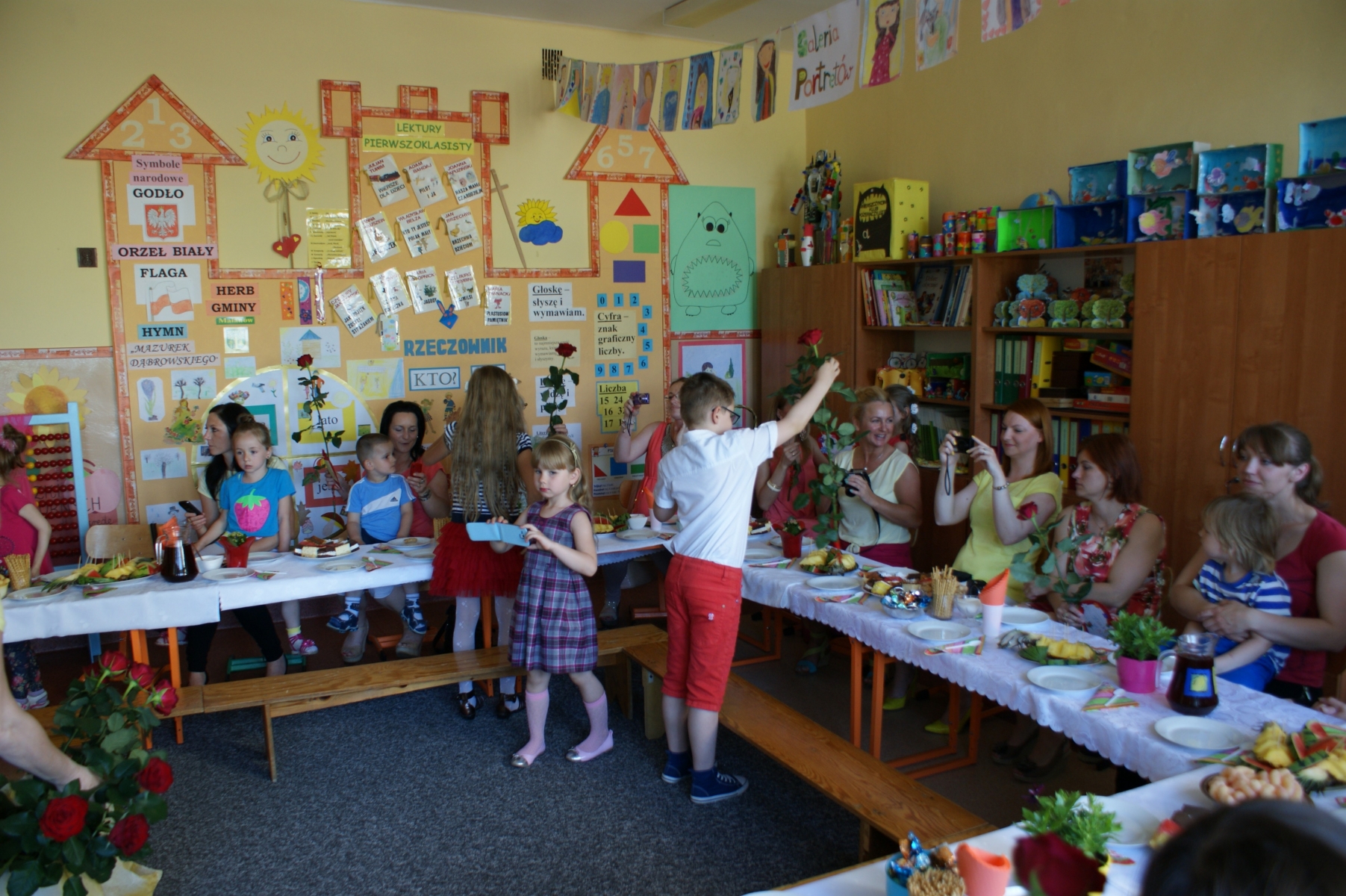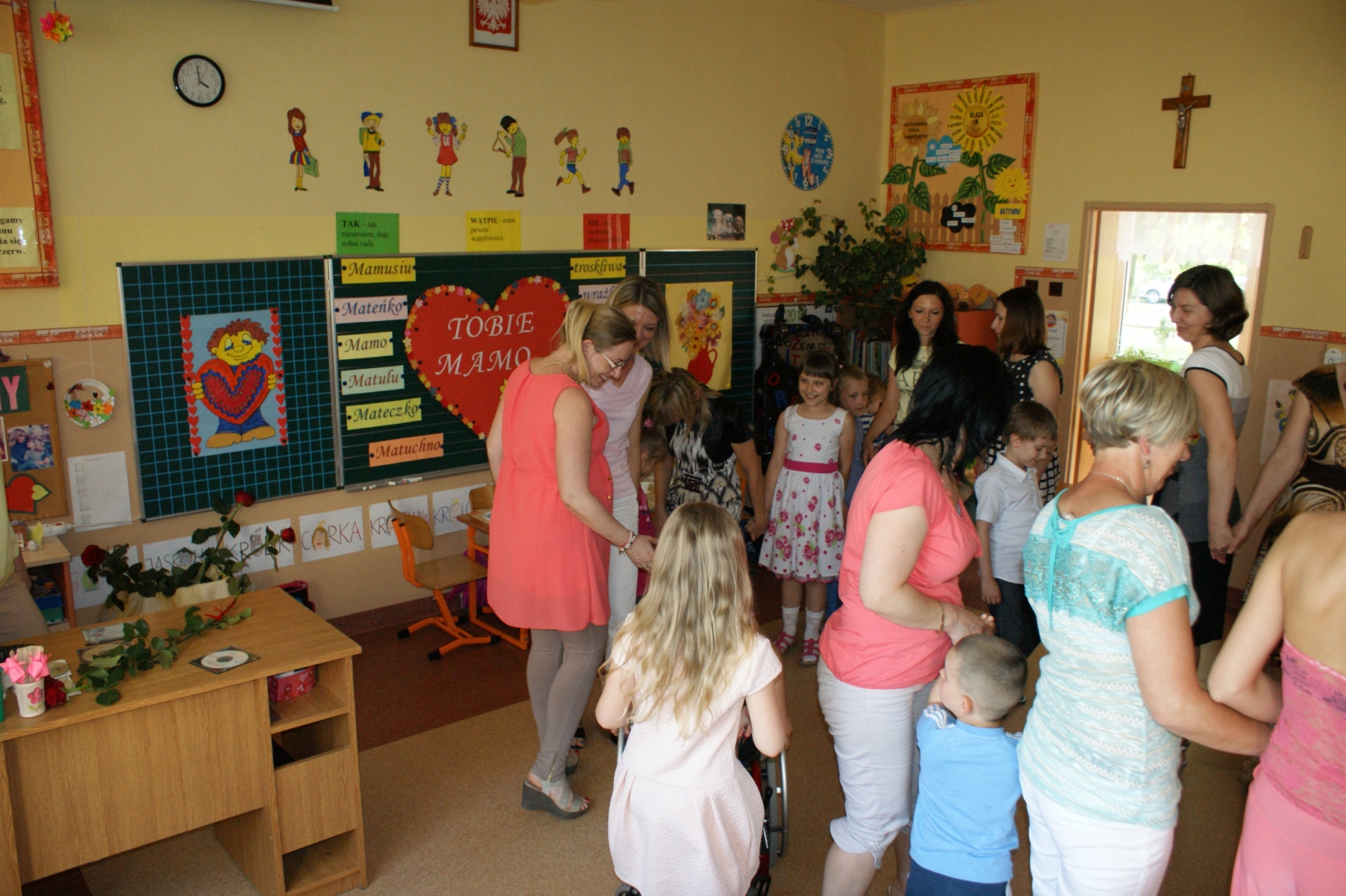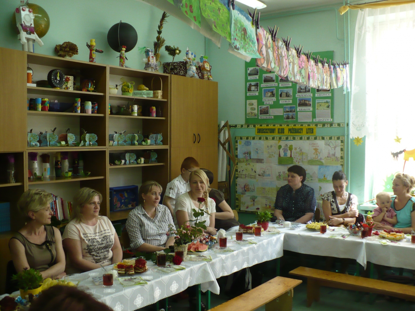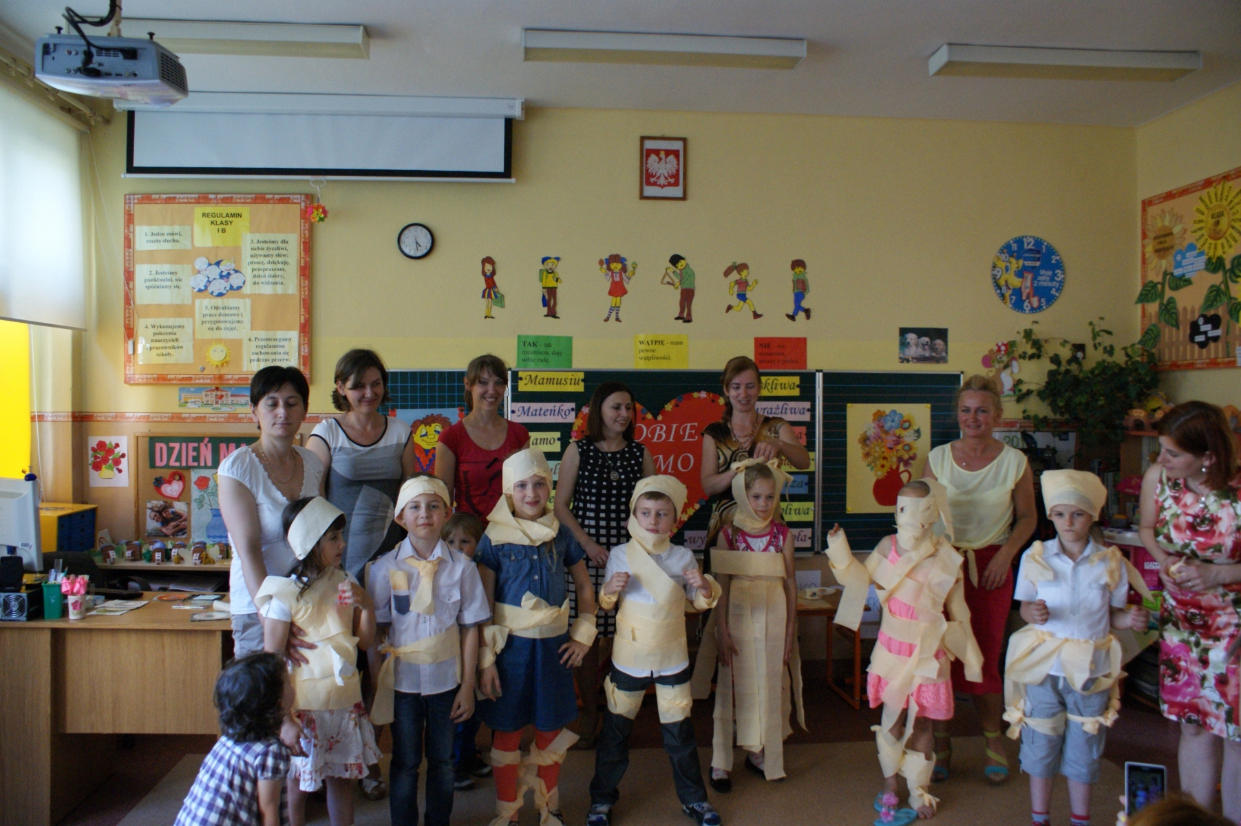 Po części artystycznej wszyscy zasiedli do wspólnego stołu, przygotowanego jak zwykle przez niezawodne mamy. Następnie odbyły się zabawy przy muzyce i konkursy z udziałem mam i dzieci. Było miło i zabawnie. Dużo radości sprawiły konkursy: „Czy znasz swoją mamę?”, „Czy znasz swoje dziecko?”, „Rysowanie portretu podczas tańca”, „Wykonanie stroju ekologicznego”. Spotkaniu towarzyszyły ciepłe rozmowy i serdeczna atmosfera.. Nad sprawnym przebiegiem uroczystości czuwały wychowawczynie klas: Aleksandra Jasnowska i Emilia Andrzejczak.