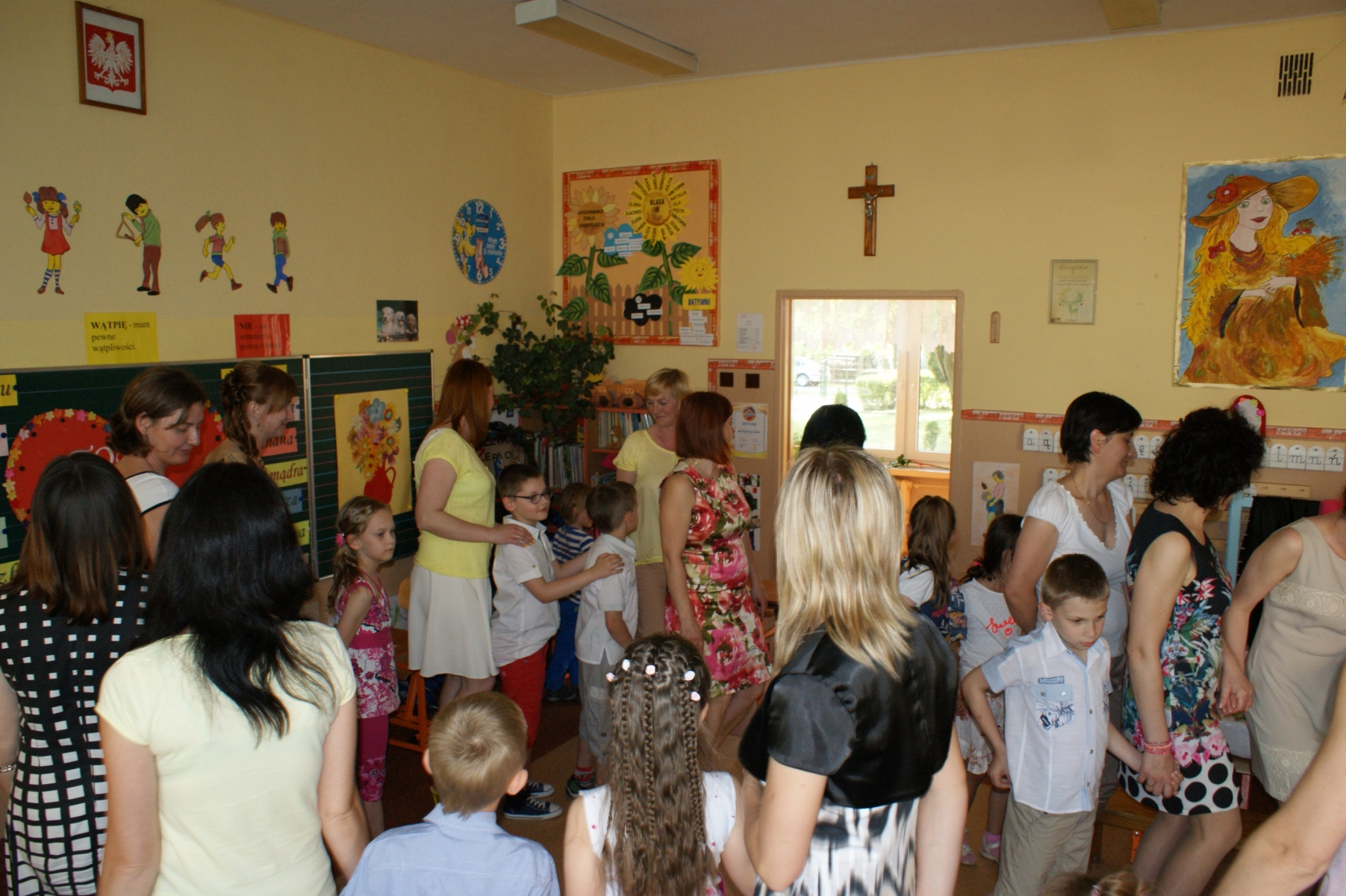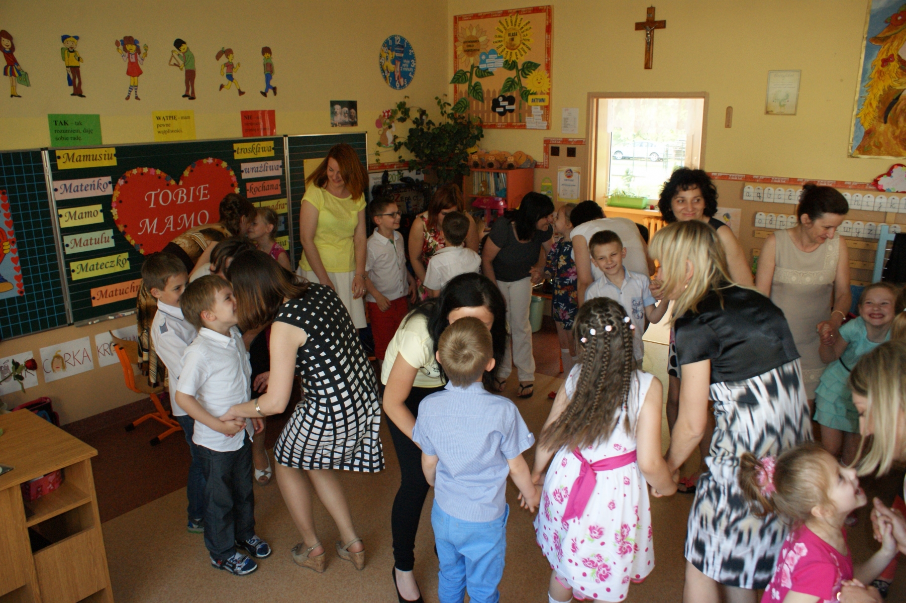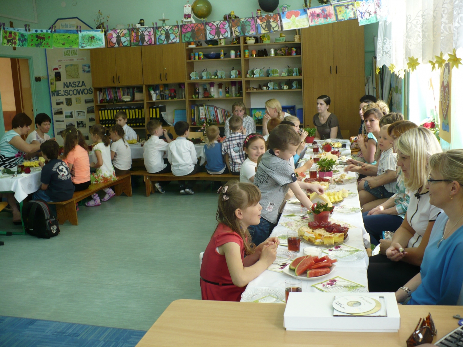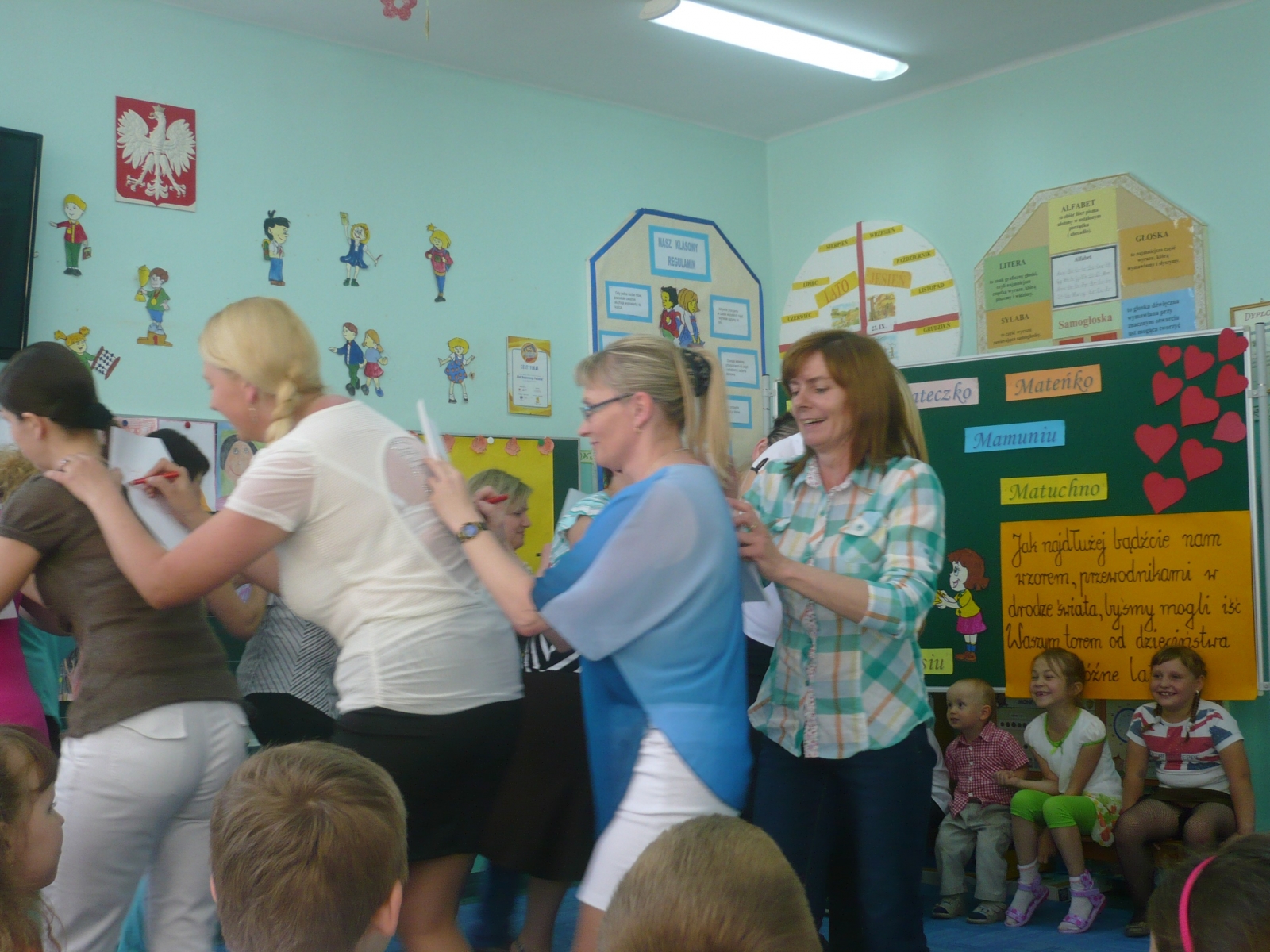 Po części artystycznej wszyscy zasiedli do wspólnego stołu, przygotowanego jak zwykle przez niezawodne mamy. Następnie odbyły się zabawy przy muzyce i konkursy z udziałem mam i dzieci. Było miło i zabawnie. Dużo radości sprawiły konkursy: „Czy znasz swoją mamę?”, „Czy znasz swoje dziecko?”, „Rysowanie portretu podczas tańca”, „Wykonanie stroju ekologicznego”. Spotkaniu towarzyszyły ciepłe rozmowy i serdeczna atmosfera.. Nad sprawnym przebiegiem uroczystości czuwały wychowawczynie klas: Aleksandra Jasnowska i Emilia Andrzejczak.