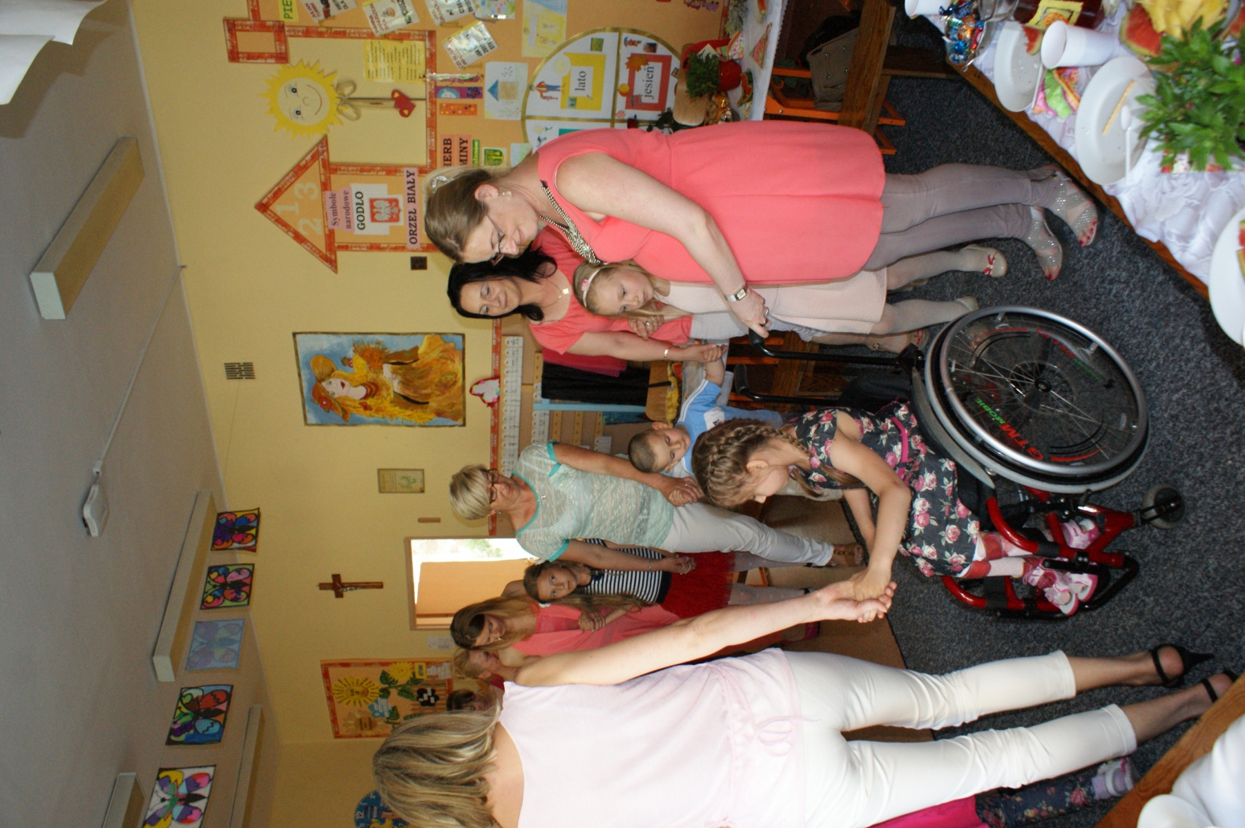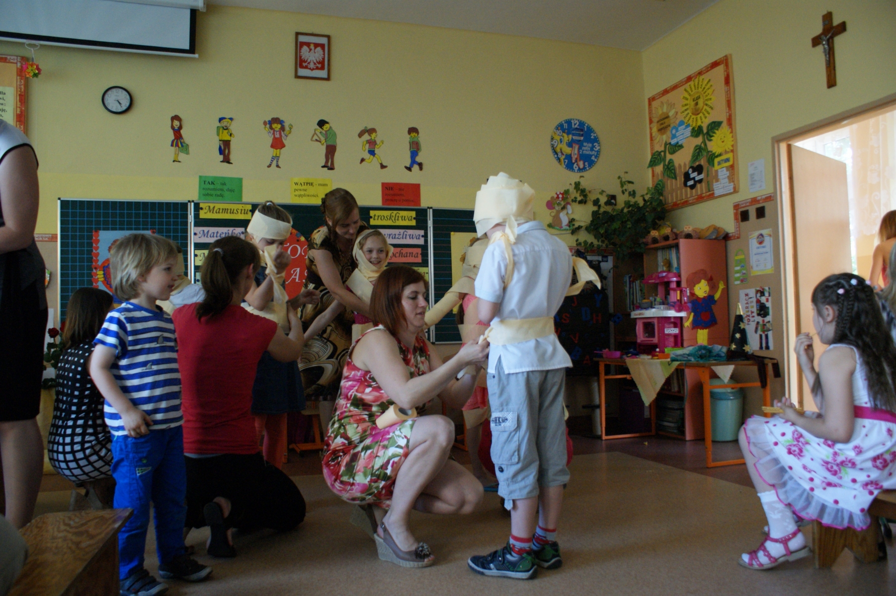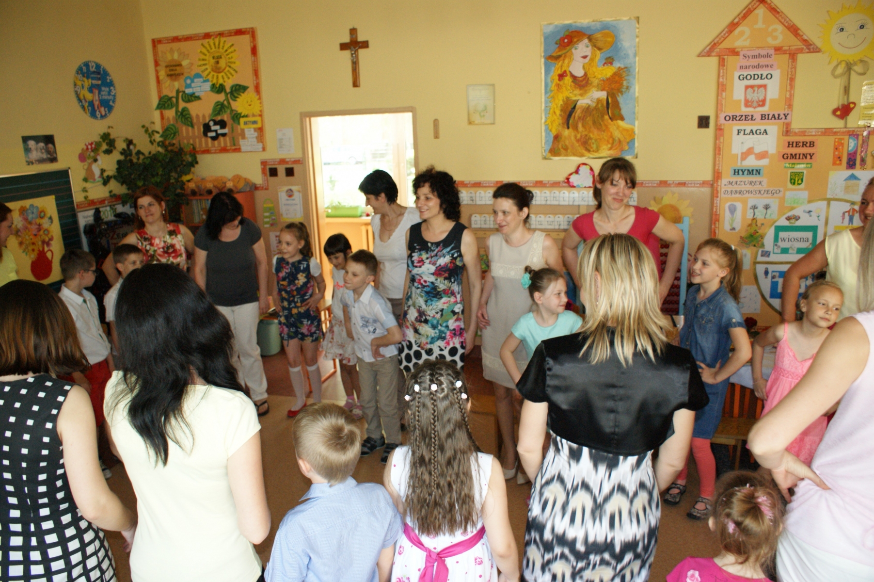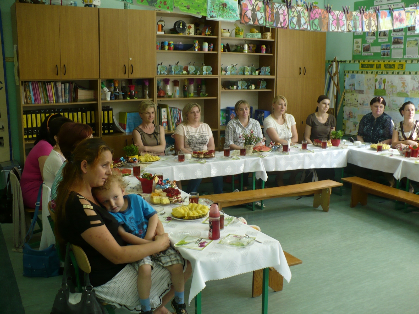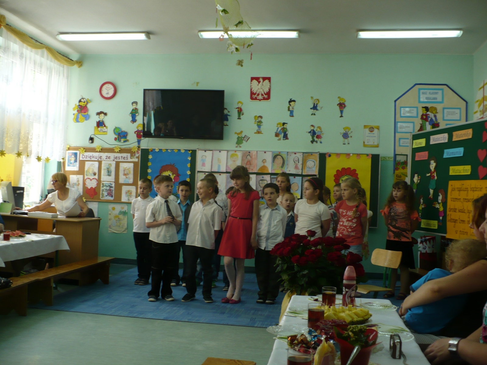 Po części artystycznej wszyscy zasiedli do wspólnego stołu, przygotowanego jak zwykle przez niezawodne mamy. Następnie odbyły się zabawy przy muzyce i konkursy z udziałem mam i dzieci. Było miło i zabawnie. Dużo radości sprawiły konkursy: „Czy znasz swoją mamę?”, „Czy znasz swoje dziecko?”, „Rysowanie portretu podczas tańca”, „Wykonanie stroju ekologicznego”. Spotkaniu towarzyszyły ciepłe rozmowy i serdeczna atmosfera.. Nad sprawnym przebiegiem uroczystości czuwały wychowawczynie klas: Aleksandra Jasnowska i Emilia Andrzejczak.