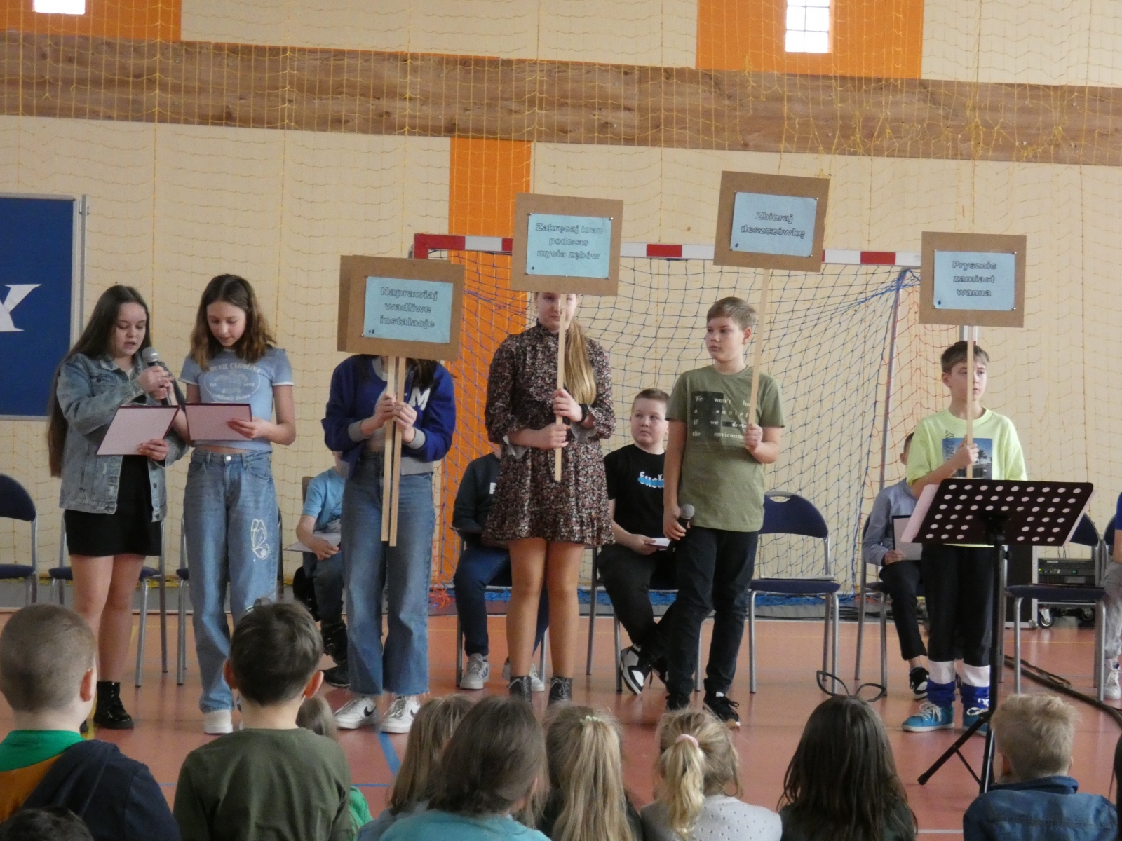 Występy uczniów klasy 5b zostały uświetnione przez popisy wokalne Darii Pokrywieckiej, Anny Andrzejczak, Alicji Ptak, Wiktorii Kasprzak oraz Wiktorii Borkowskiej.