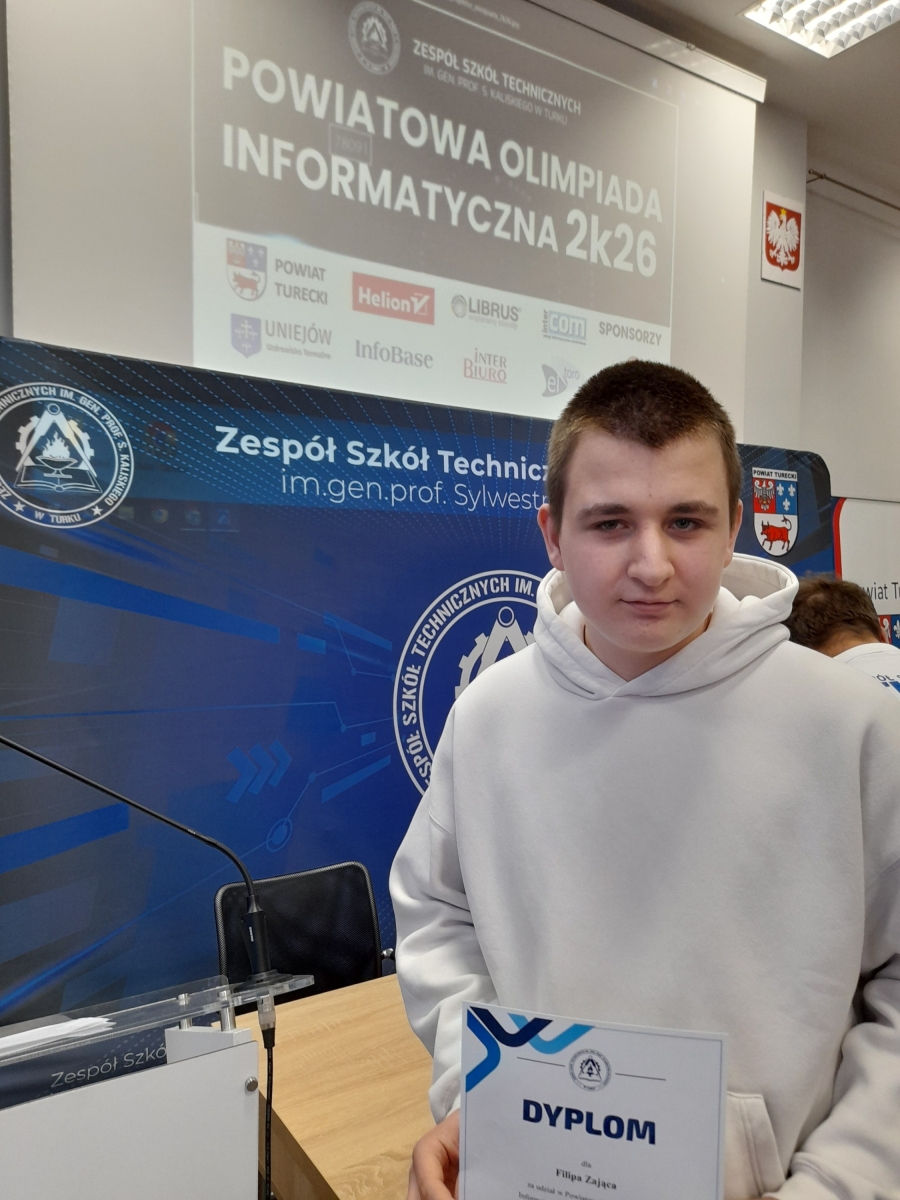 W Zespole Szkół Technicznych w Turku odbył się kolejny już finał Powiatowej Olimpiady Informatycznej. Uczestnikami wydarzenia byli uczniowie klas siódmych i ósmych szkół podstawowych z powiatu tureckiego. Olimpiadę poprzedziły eliminacje w formule online. Przystąpiło do nich ponad 100 osób. Do kolejnego etapu olimpiady zakwalifikowało się 30 uczestników. To właśnie oni w minioną środę (15 kwietnia) w pracowniach komputerowych ZST rozwiązywali test konkursowy. Składał się on z 40 pytań z zakresu wiedzy informatycznej na poziomie szkoły podstawowej. Rywalizacja między uczestnikami była zacięta, ponieważ było o co walczyć. Jak co roku, sponsorzy ufundowali cenne nagrody m.in. projektor, smartwatche, słuchawki, głośniki czy sprzęt gamingowy. Szkołę Podstawową w Malanowie reprezentował uczeń klasy 8b – Filip Zając.