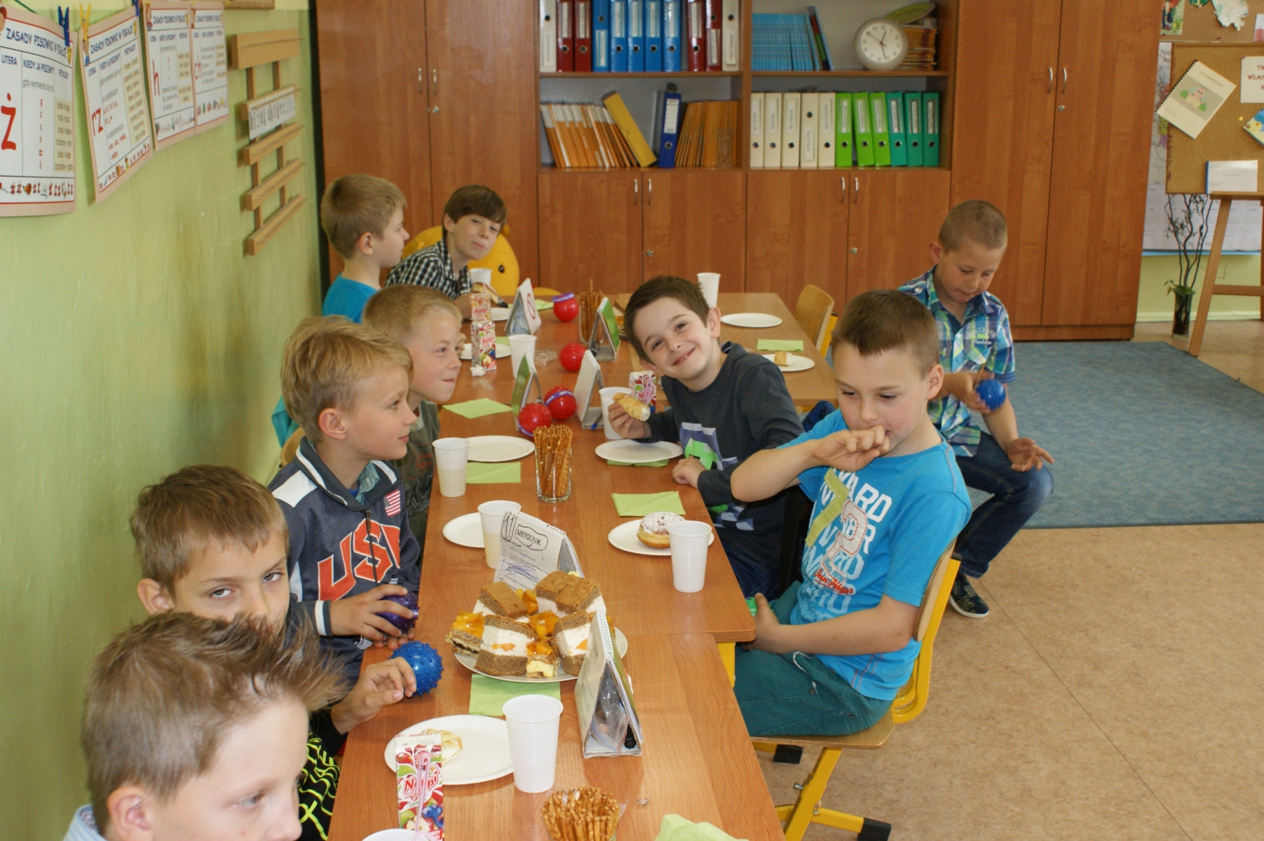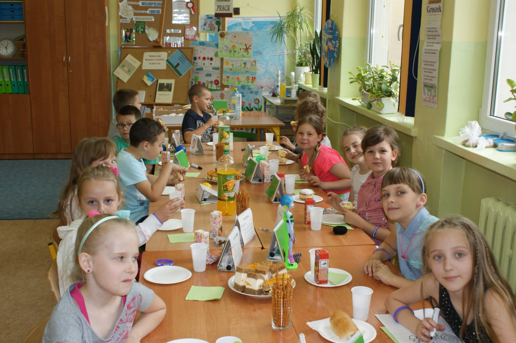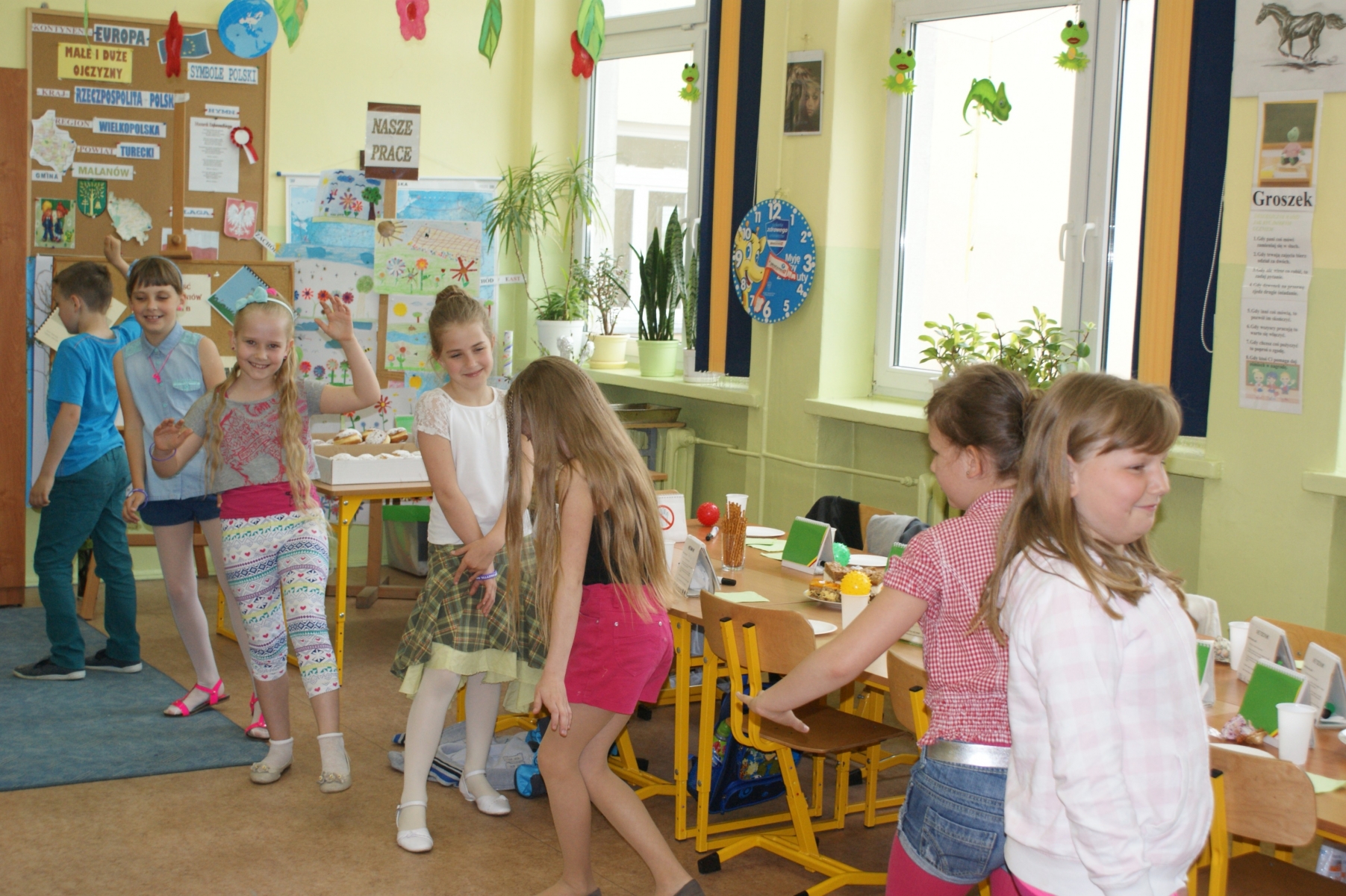 2 czerwca został zorganizowany w naszej szkole Dzień Dziecka. Z okazji tego święta uczniowie przyszli do szkoły bez teczek. Czekały na nich liczne atrakcje m.in. ciekawe gry i zabawy, bajki i filmy oraz słodkie poczęstunki. Odbył się również turniej piłki siatkowej. Uczniowie radośnie kibicowali i dopingowali swoich kolegów. Dla wszystkich został również przygotowany ciepły posiłek w postaci hot-dogów, herbaty i soczku. Na koniec można było potańczyć przy dźwiękach muzyki.