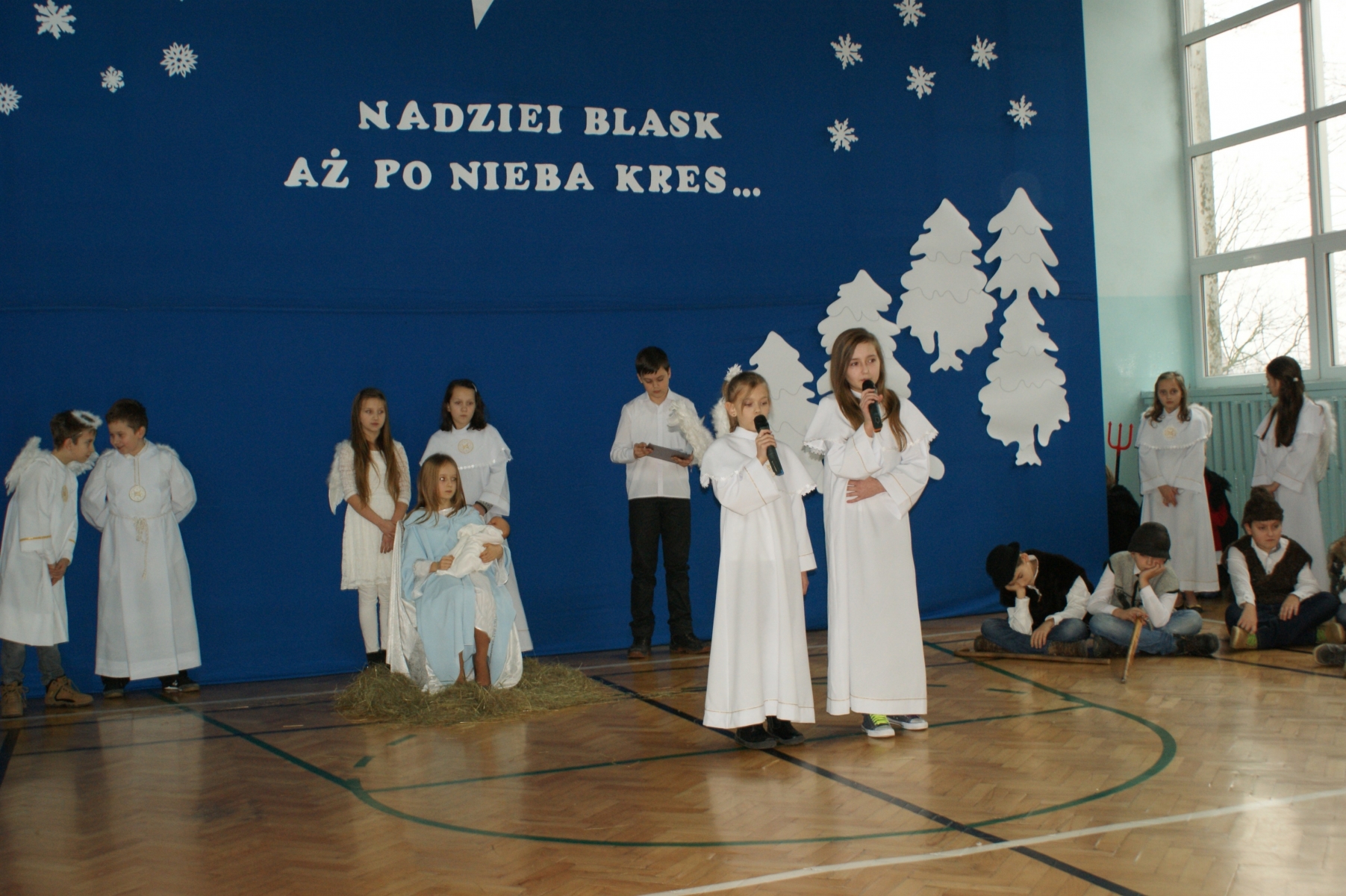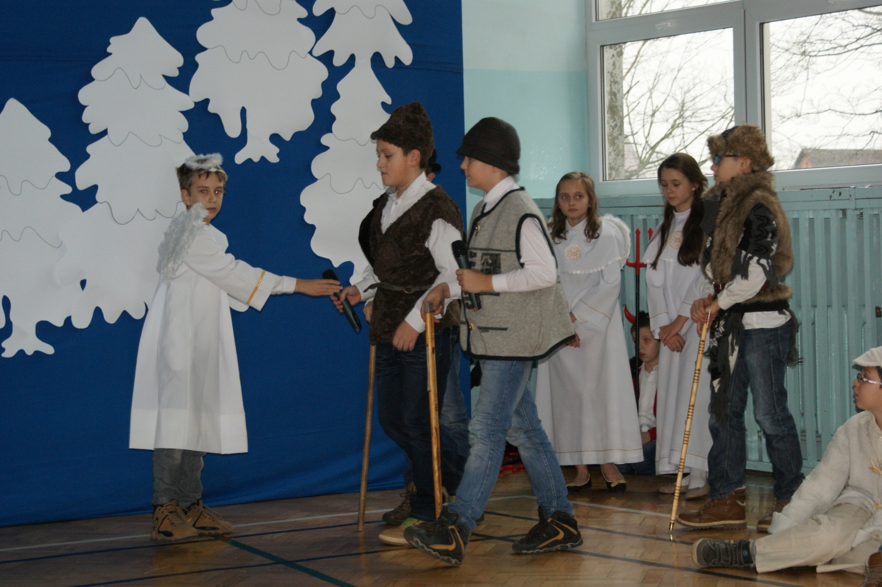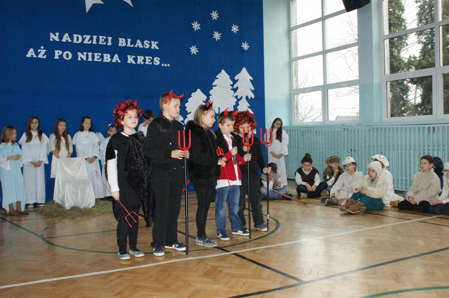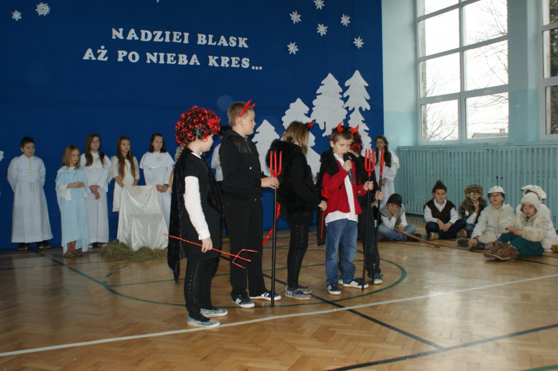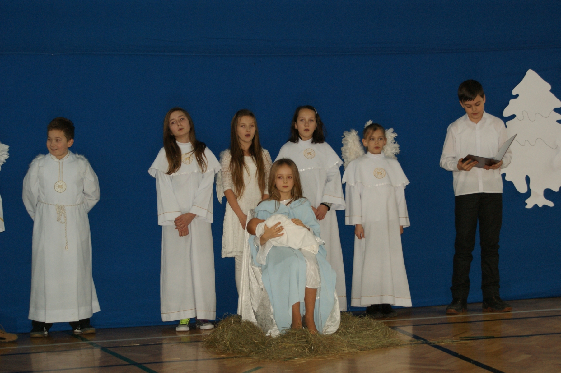 Jasełka przygotowali ks. Tomasz Smoliński i p. katechetka Małgorzata Przybylak. Przedstawienie przeplatane było pięknymi kolędami w wykonaniu uczniów klas IV – VI pod kierunkiem p. Katarzyny Tomczyk. Na świąteczny nastrój wpływ miała dekoracja wykonana przez p. Julitę Muszalską.