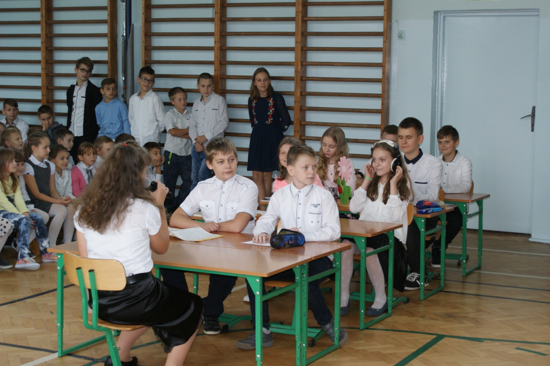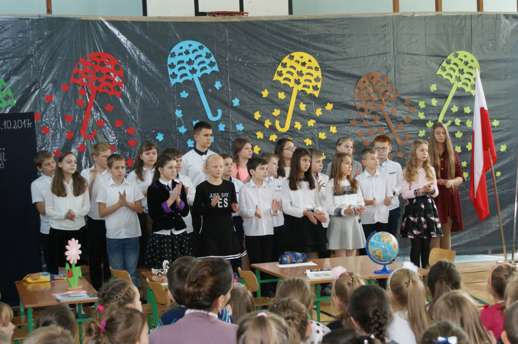Po słowach powitania na scenę wkroczyli uczniowie klasy 5b, którzy śpiewem i wierszem wyrazili swoje podziękowanie i słowa uznania dla trudnej pracy wszystkich nauczycieli.