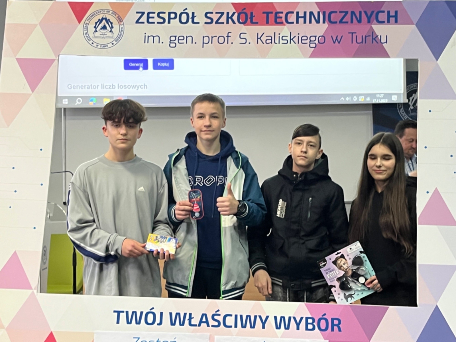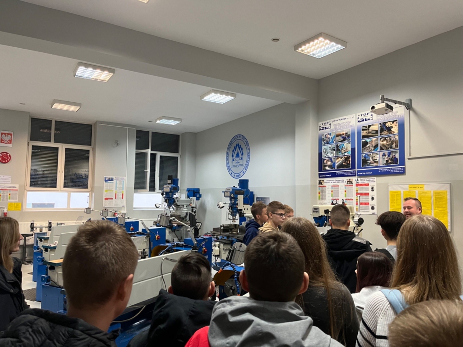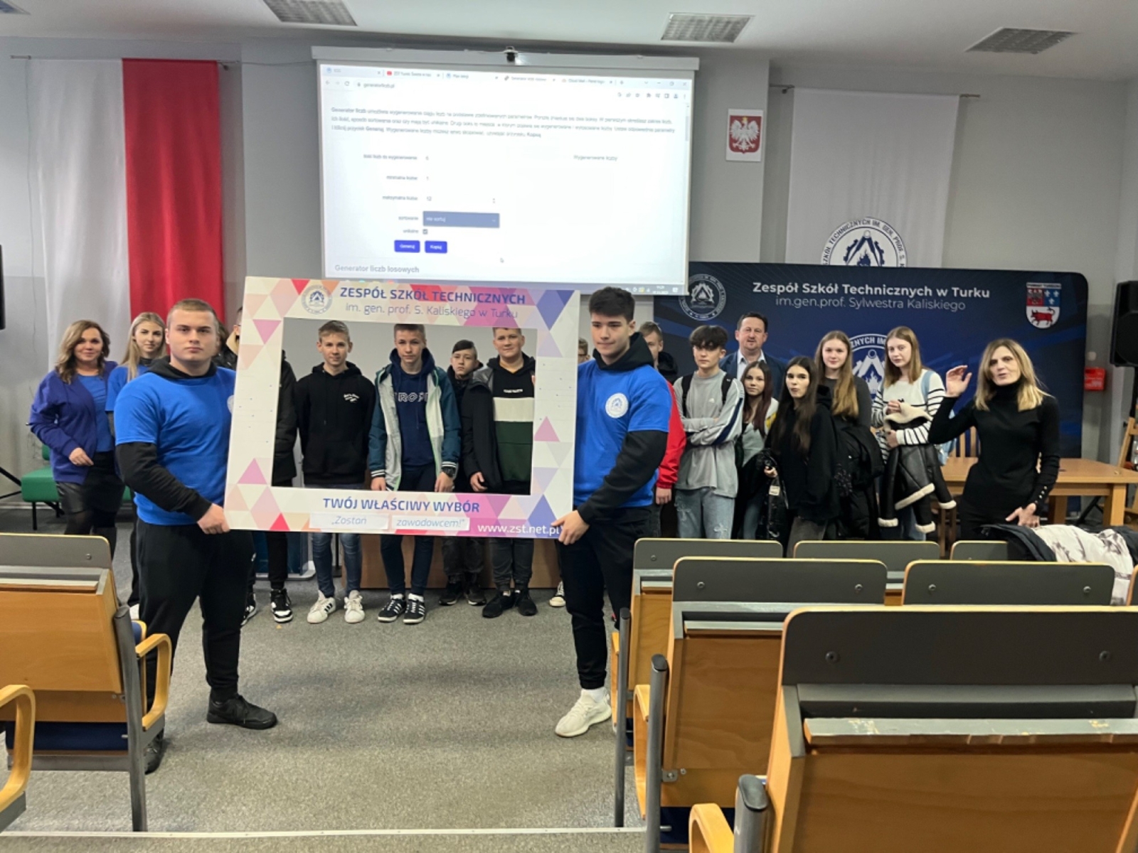 W piątek 17 listopada 2023 r. uczniowie klasy ósmej odwiedzili Zespół Szkół Technicznych im. gen. prof. S. Kaliskiego w Turku. Spotkanie przebiegało w przyjaznej atmosferze. Ósmoklasiści obejrzeli interesujące filmiki i wysłuchali krótkich informacji na temat szkoły. Poznali infrastrukturę placówki, wyposażenie izb lekcyjnych, specyfikę różnych zawodów. Duże wrażenie zrobiły nowoczesne pomieszczenia warsztatowe, możliwości uzyskania stypendium czy praktyki zagraniczne. Przekonali się, że ZST dysponuje bogatą ofertą kształcenia na kierunkach technicznych i w szkole branżowej. Sami uczniowie przyznali, że decyzja o wyborze szkoły ponadpodstawowej jest trudna. Wizyta w ZST uświadomiła im, że już najwyższy czas, aby pomyśleć o przyszłości i z rozmysłem zaplanować własną ścieżkę kształcenia. Wizyta skończyła się miłym akcentem. Gospodarze wręczyli uczestnikom drobne upominki.