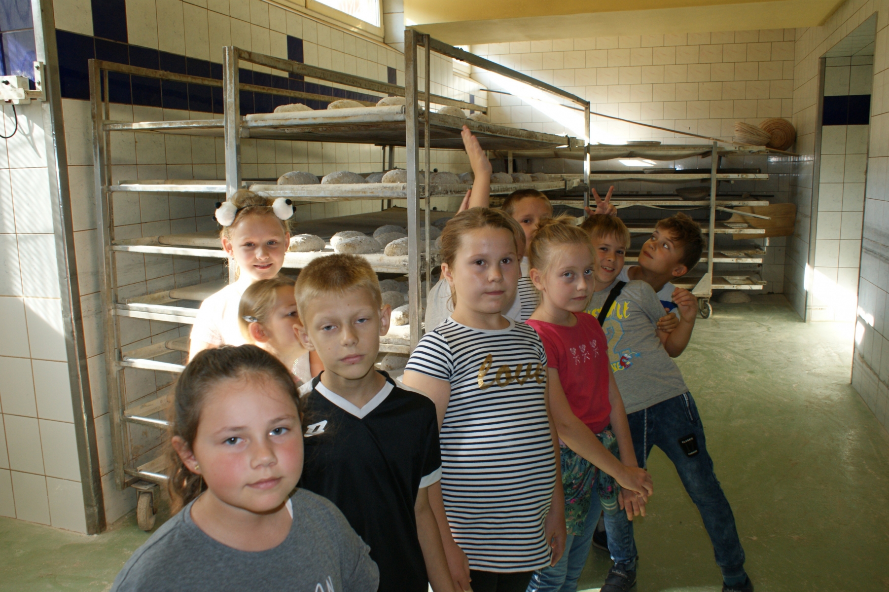 Wycieczka do piekarni pozwoliła na własne oczy zobaczyć, jak powstaje chleb. W piekarni przywitał nas pracownik piekarni, który bardzo ciekawie omówił sposób wypieku chleba i pokazał cały proces produkcji. Pan przewodnik oprowadził dzieci po najważniejszych pomieszczeniach piekarni: pomieszczeniu, w którym wyrasta ciasto – garowni, pomieszczeniu z piecem i maszyną do wyrobu bułek, magazynie na mąkę oraz miejscu z ruchomymi regałami do przechowywania upieczonego już pieczywa. Dzieci zobaczyły również cukiernię i zostały poczęstowane ciastkami. Uczniowie poznali produkty, które są potrzebne do wypieku chleba, różne rodzaje pieczywa oraz maszyny, które pomagają w pracy piekarzowi. Ciekawość dzieci wzbudziła ogromna maszyna do wyrobu bułek oraz piec do wypiekania chleba. Dzieci miały okazję zobaczyć jak z ciasta powstaje chleb. Uczniowie z wielkim zainteresowaniem przyglądali się pracy piekarzy i uważnie śledzili etapy powstania pieczywa.