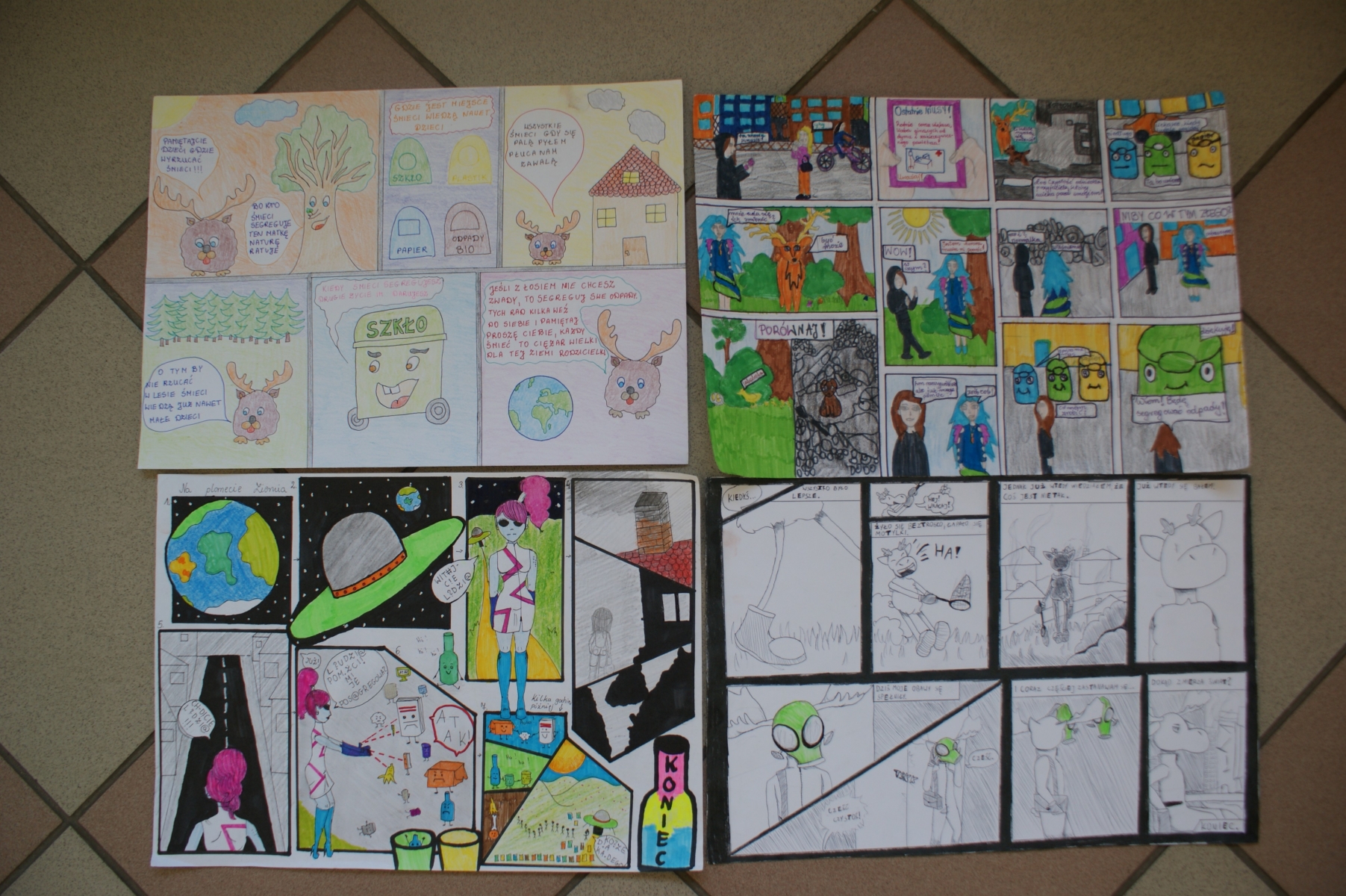 Zadaniem uczestników było samodzielne wykonanie pracy plastycznej – komiksu zgodnego z celem konkursu. Bardzo liczna grupa uczniów z naszej szkoły przystąpiła do tego konkursu, lecz tylko po dwie prace z każdej grupy wiekowej mogły dostać się do dalszego etapu konkursu. Zatem zadanie jurorów na etapie szkolny było nie lada wyzwaniem. Po długich obradach do dalszego etapu konkursu przeszły prace: z grupy wiekowej III (klas IV-VI): praca Laury Witkowskiej z kl. IV a i Mariki Stefaniak z kl. VI a, natomiast z grupy wiekowej IV (kl. VII i gimn.) prace: Julii Jafry z kl. VII b oraz Agaty Majewskiej z kl. VII b.