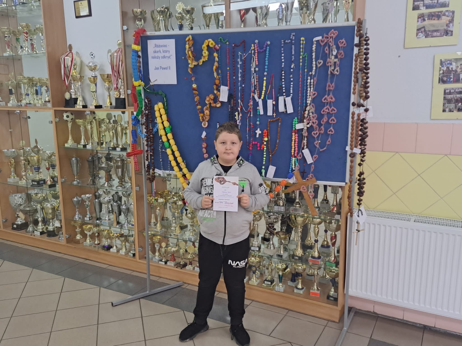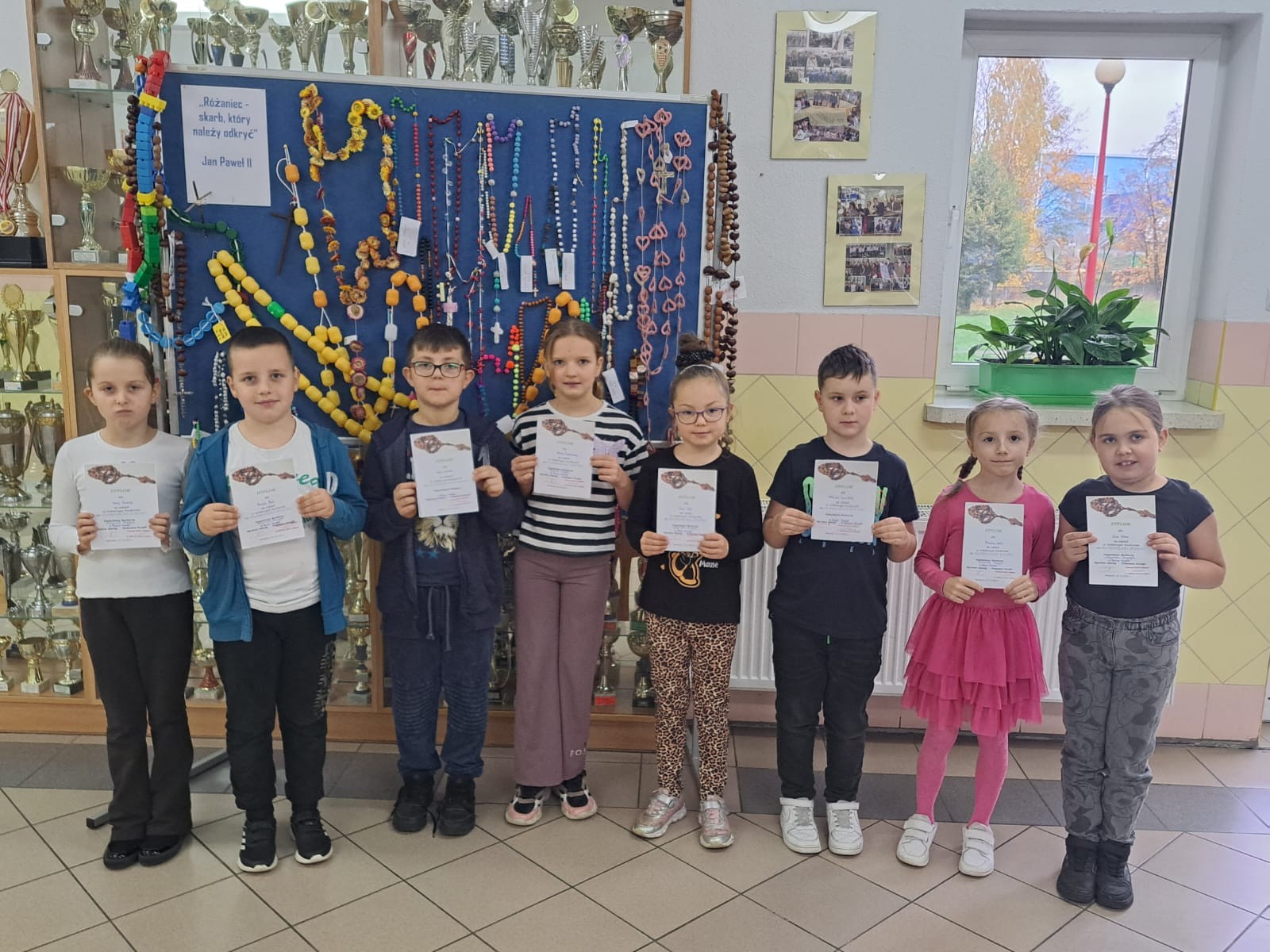 W październiku uczniowie klas pierwszych i drugich z pomocą rodziców robili różańce z różnorodnych materiałów. Uczniowie zostali nagrodzeni dyplomami. Przepiękne różańce stanowiły wystawę na korytarzu szkolnym przez cały październik. Celem konkursu było zapoznanie z modlitwą różańcową. Gratulujemy wszystkim uczestnikom konkursu.