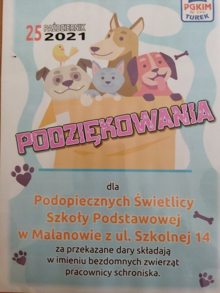 W dniach 18 -22 października 2021r. podopieczni świetlicy Szkoły Podstawowej im. Powstańców Wielkopolskich w Malanowie z ul. Szkolnej uczestniczyli w zajęciach poświęconych zwierzętom domowym. Przy tej okazji opiekunka świetlicy zorganizowała zbiórkę darów na rzecz schroniska dla bezdomnych zwierząt w Turku.