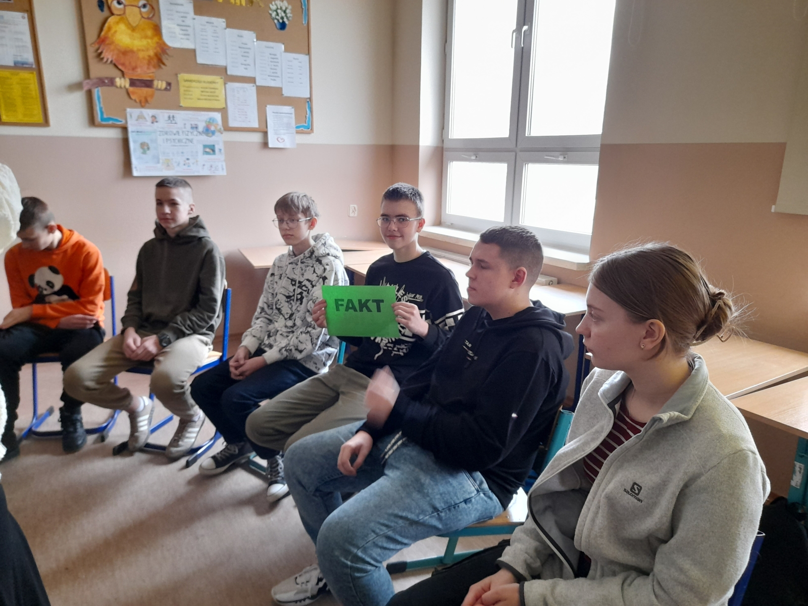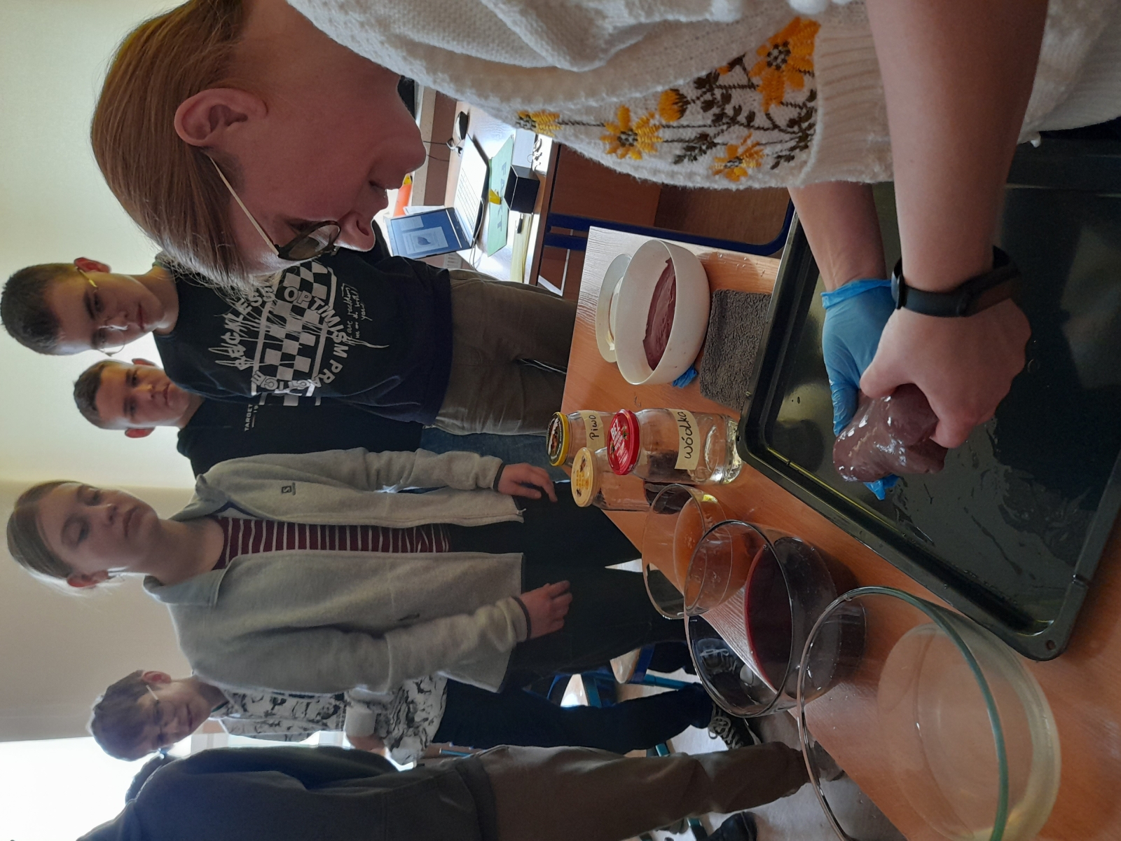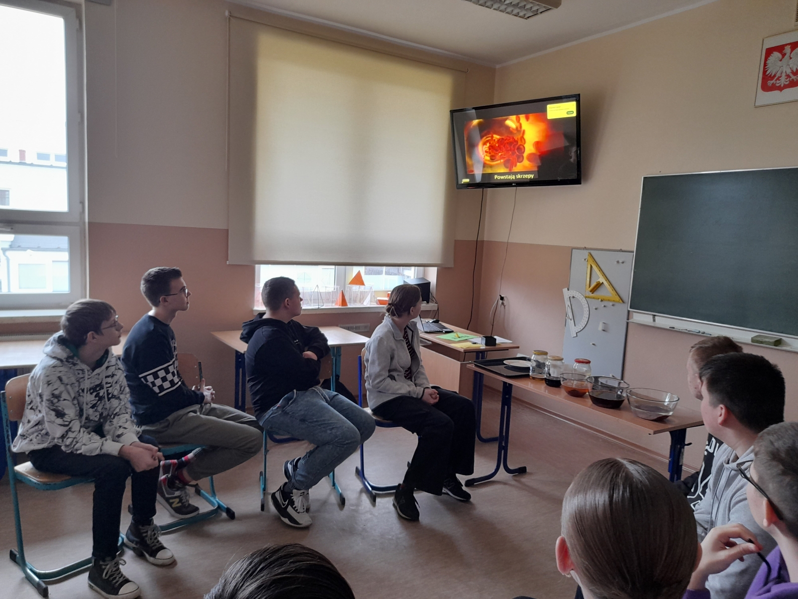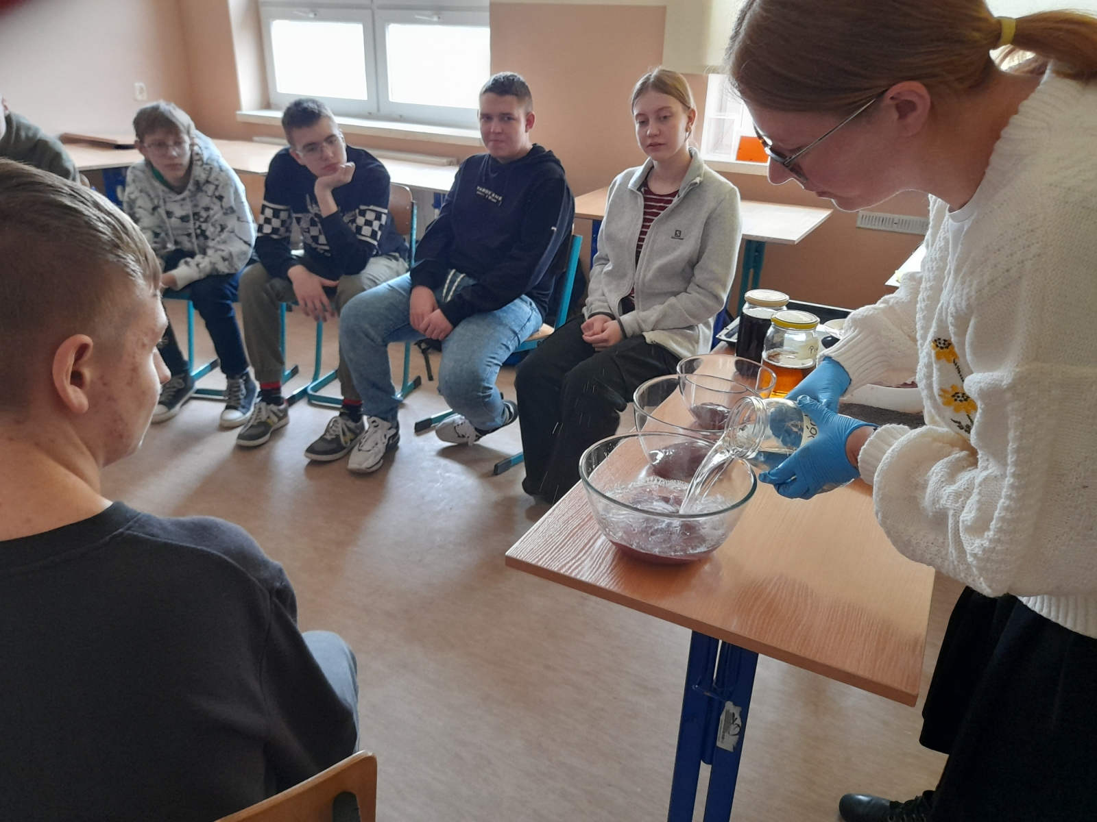 Dnia 29 lutego uczniowie klasy 8 uczestniczyli w lekcji otwartej z zakresu profilaktyki uzależnień, którą poprowadziła psycholog Karolina Niespodziańska. Celem lekcji było kształtowanie wśród uczniów nawyków prozdrowotnych, wolnych od używek, zwiększenie świadomości młodzieży na temat konsekwencji sięgania po alkohol- nie tylko zdrowotnych, ale także prawnych. Lekcja rozpoczęła się przywitaniem uczniów oraz gości. Swoją obecnością zaszczyciła nas Pani dyrektor, p. pedagog oraz nauczyciel wspomagający p. Natalia Stępińska. Po krótkim wprowadzeniu rozpoczęto zajęcia. W zadaniu pierwszym poprzez grę dydaktyczną uczniowie mieli możliwość zweryfikowania swojej wiedzy na temat faktów i mitów dotyczących alkoholu. Informacje dostarczyły uczniom wielu cennych wskazówek, a przede wszystkim pozwoliły zweryfikować ich wiedzę/ przekonania na temat alkoholu. W kolejnym zadaniu badaliśmy wpływ alkoholu na narządy człowieka przeprowadzając doświadczenie na wątrobie świńskiej. Wątroba zalewana była alkoholami o różnym stężeniu etanolu. Już po 5 minutach można było zaobserwować zmiany w wyglądzie wątroby, a przede wszystkim zmianę koloru. Doświadczenie uświadomiło uczniom, że nie ma alkoholi bezpiecznych. Zarówno wysokoprocentowe jak i niskoprocentowe alkohole mają wpływ na naszą wątrobę. W celu przyjrzenia się jak alkohol wpływa na inne narządy np. mózg, serce, żołądek uczniowie mieli także możliwość obejrzenia filmu: Szkodliwość alkoholu- co się dzieje w organizmie. Na koniec lekcji odbyło się podsumowanie oraz ewaluacja zajęć. Uczniowie wymieniali konsekwencje zachowania się osoby nietrzeźwej oraz podsumowali jaki wpływ ma spożywanie alkoholu na organizm człowieka.