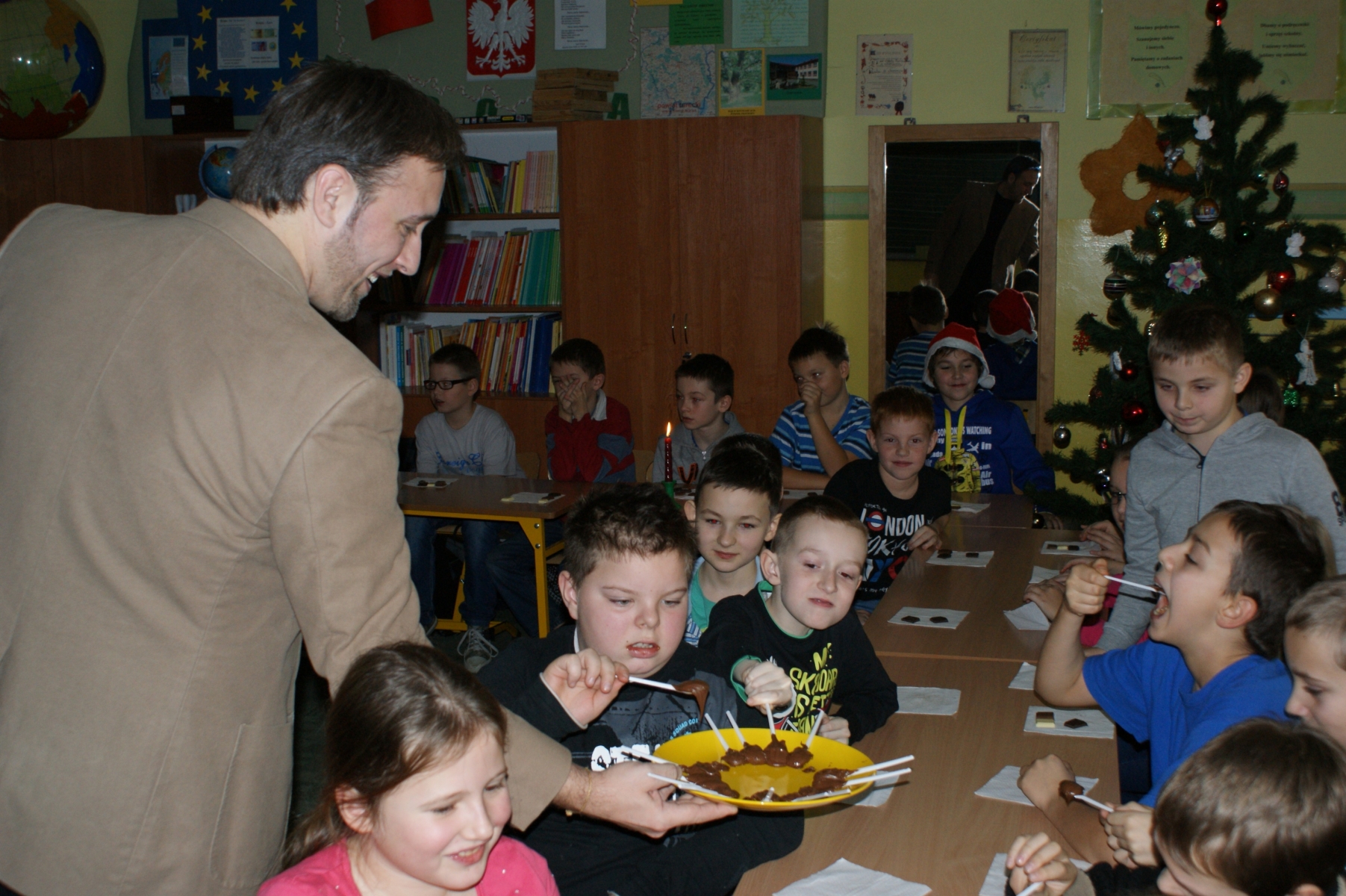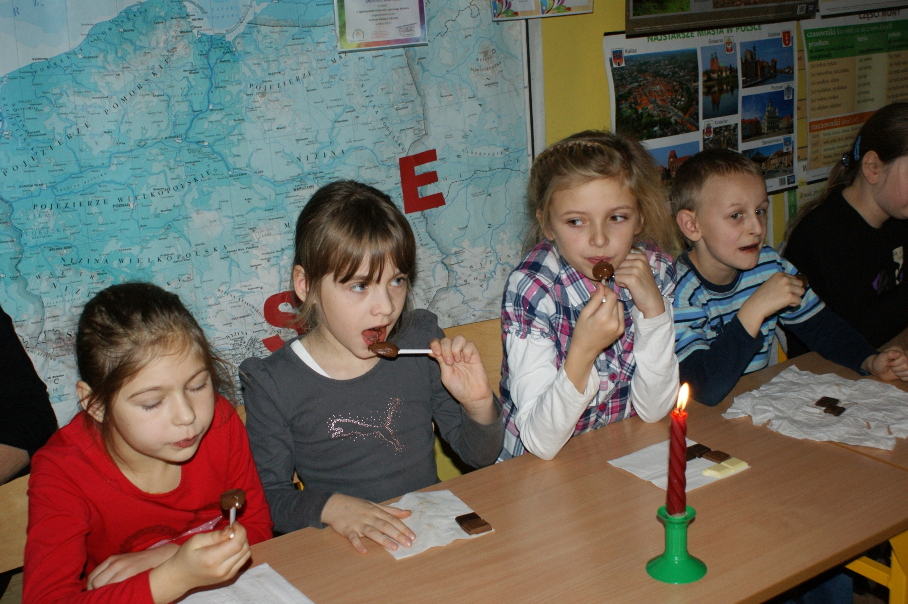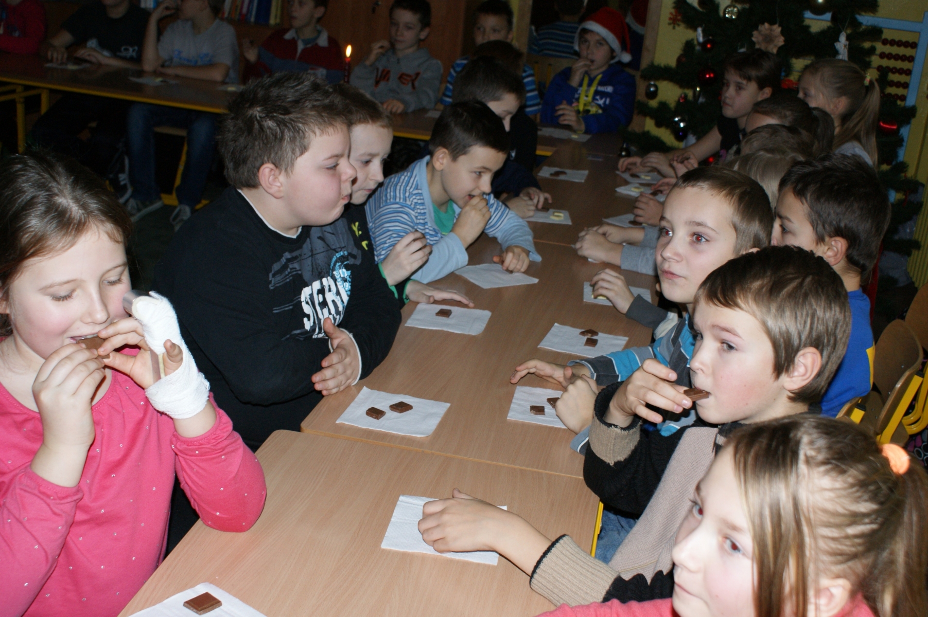 Mikołajkową przygodę trzeciaki kontynuowały w piątkowy poranek 06 grudnia 2013 roku, uczestniczyły w zajęciach warsztatowych połączonych z ciekawą prezentacją dotyczącą czekolady i z jej degustacją. Spotkanie poprowadzili państwo Mitchell. Dzięki bogatej prezentacji multimedialnej, dzieci dowiedziały się jak wygląda drzewo kakaowe i jego owoc, gdzie rosną kakaowce oraz jaką drogę musi przebyć ziarno kakao aby stać się upragnioną przez wszystkich łasuchów tabliczką czekolady. Pan Mitchell zapoznał uczniów z historią znanej na całym świecie Nutelli. Atrakcyjnym punktem prezentacji była oczywiście profesjonalna degustacja czekolady, podczas której uczniowie używając pięciu zmysłów i uważnie słuchając wskazówek pana Paula, uczyli się zgłębiać tajniki poprawnego degustowania oraz rozpoznawania cech charakterystycznych dla danego typu czekolady. Na zakończenie, przeprowadzono quiz sprawdzający zdobytą wiedzę podczas przeprowadzonego na temat czekolady.