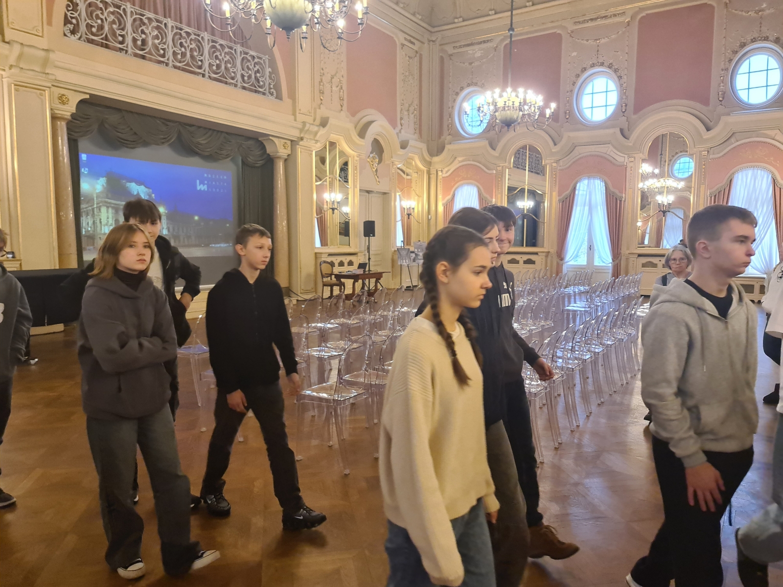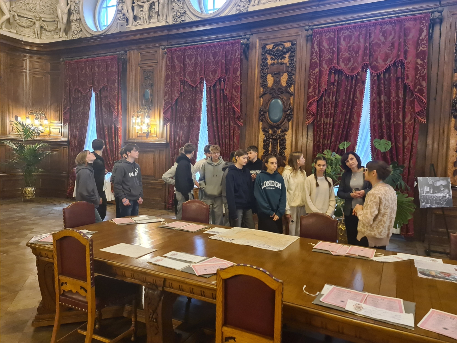 Krótkie zwiedzanie okolic Manufaktury uczniowie rozpoczęli od wizyty w Pałacu Poznańskich, który jest piękną wizytówką miasta i jednocześnie pamiątką po wielkiej świetności rodu jego właścicieli. Podczas spaceru tematycznego po muzeum, obejmującego zwiedzanie pomieszczeń reprezentacyjnych i prywatnych apartamentów dawnej rezydencji fabrykanckiej, uczniowie poznali obyczajowość XIX-wiecznych łódzkich przemysłowców oraz życie codzienne rodziny Poznańskich. W mijanych podczas przechadzki salach zachwycały architektoniczne style wraz z ich charakterystycznymi cechami i formami oraz zgromadzone pamiątki z ówczesnych czasów. Pani przewodnik opowiedziała także o dynamicznym rozwoju miasta, które w ciągu zaledwie kilkudziesięciu lat przekształciło się z małej osady w centrum przemysłu włókienniczego Królestwa Polskiego.