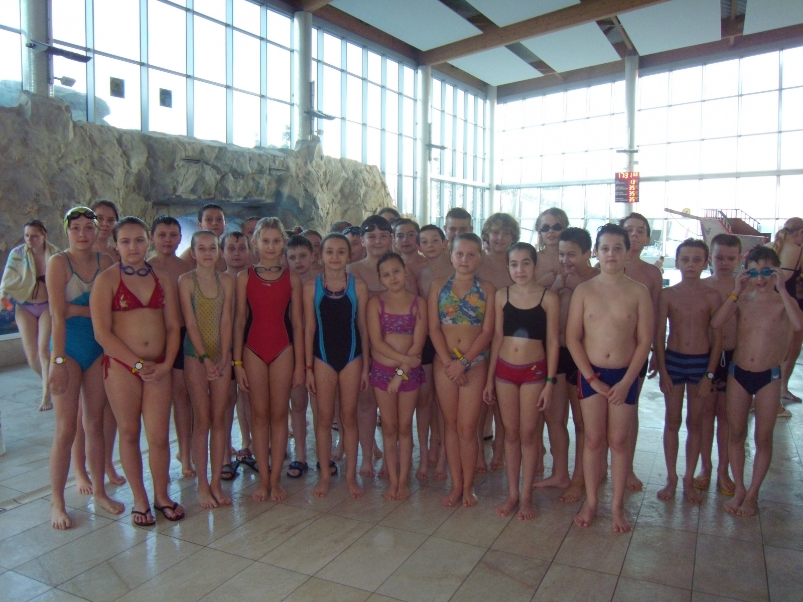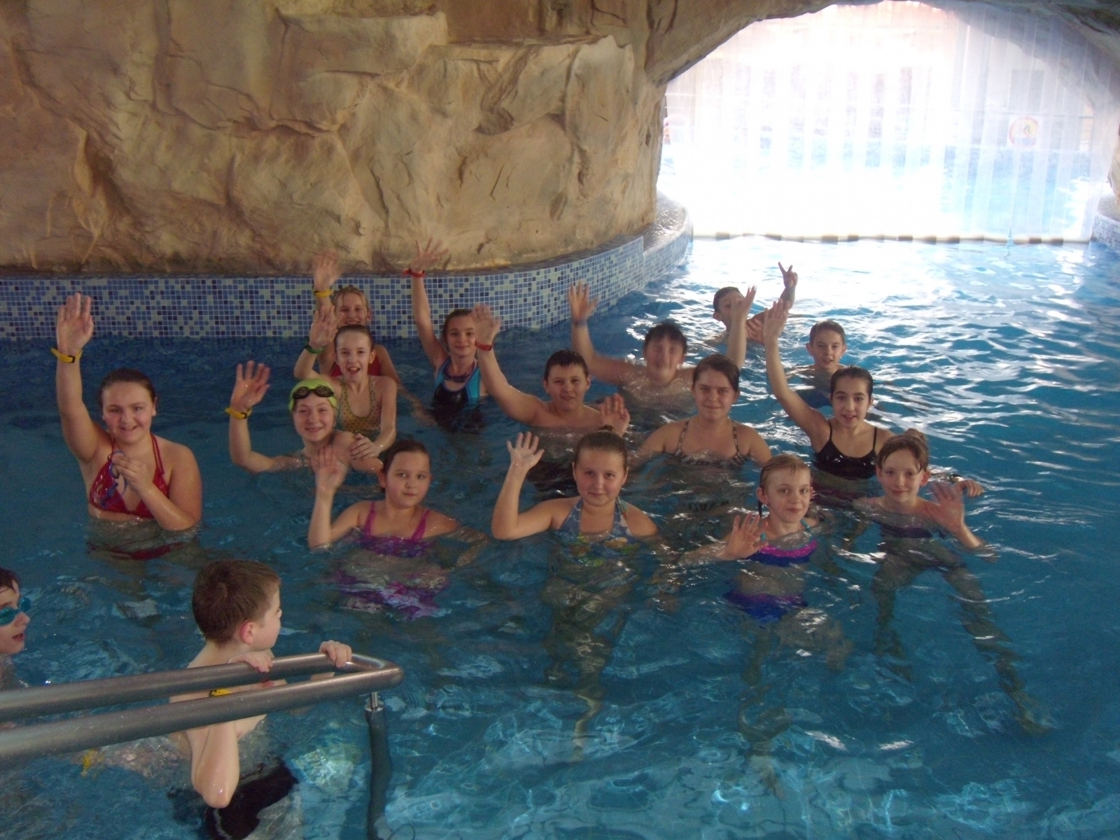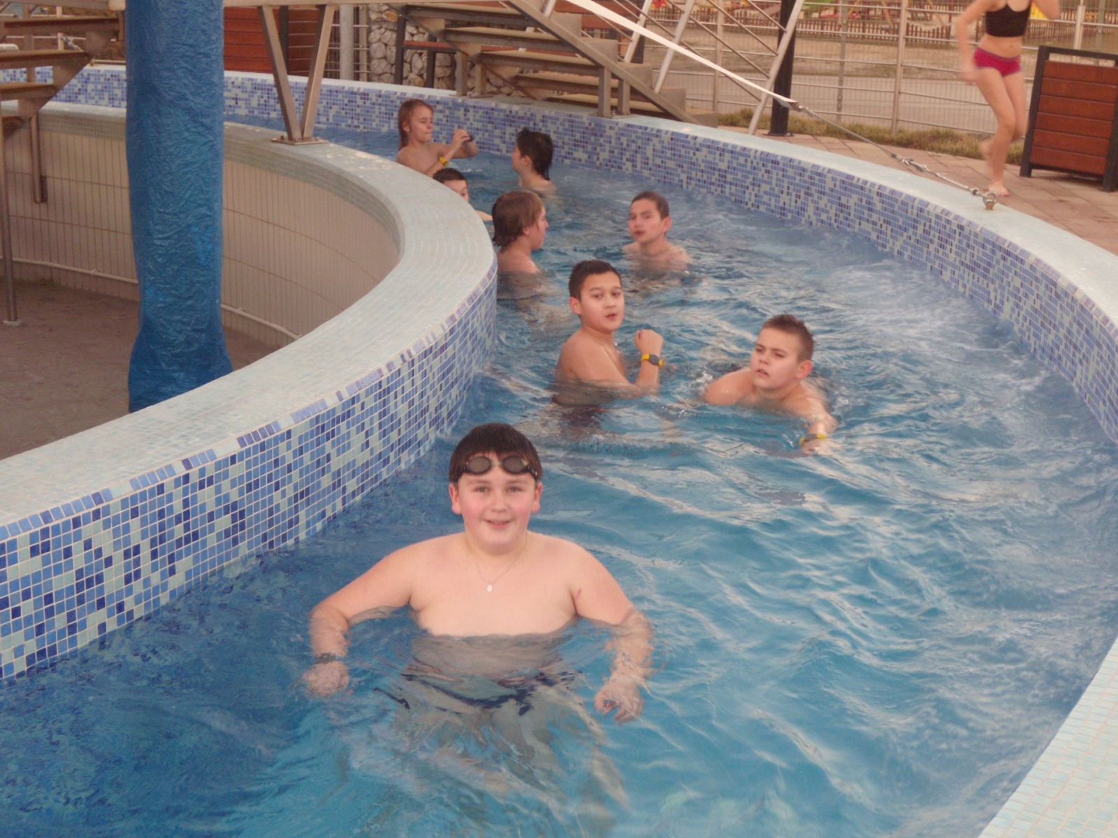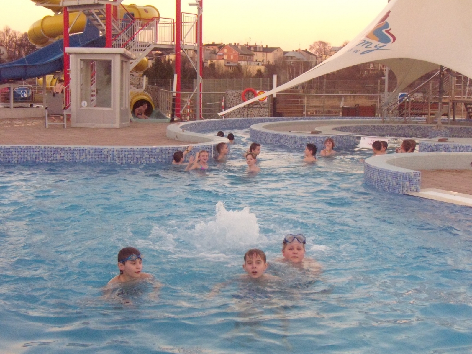 Pod opieką ratowników, którzy spotkanie rozpoczęli od przypomnienia regulaminu korzystania z basenów, uczniowie mogli przez 2 godziny szlifować umiejętności pływackie. W kompleksie termalno-basenowym mieliśmy do dyspozycji solankowe baseny kryte i otwarte, zjeżdżalnie, "rwącą rzekę", leżanki z hydromasażami i jacuzzi.