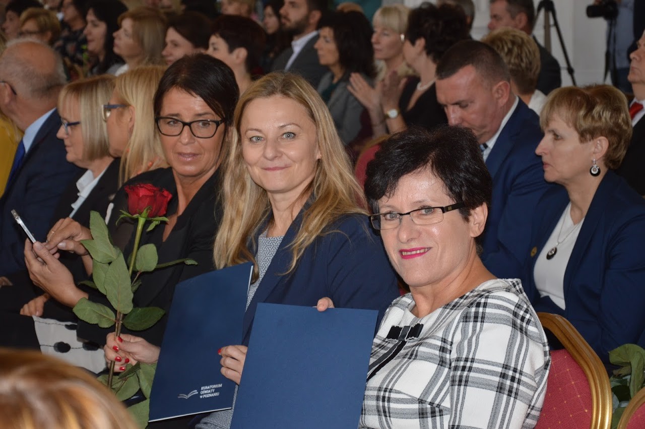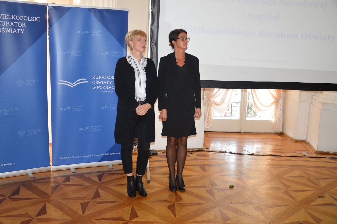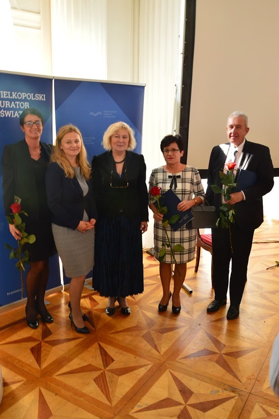 W tym roku z okazji Święta Edukacji Narodowej w uznaniu zasług w pracy dydaktycznej, wychowawczej i opiekuńczej nagrodę Wielkopolskiego Kuratora Oświaty otrzymały panie: Katarzyna Tomczyk i Elżbieta Wietrzyk. Pani Elżbieta Wietrzyk jest nauczycielką geografii, ponadto pracuje jako bibliotekarz szkolny. Od wielu lat przygotowuje uczniów do Wojewódzkiego Konkursu Geograficznego, na którym zdobywają oni najwyższe miejsca. Organizuje rajdy i wycieczki krajoznawcze, dba o krzewienie świadomości ekologicznej wśród uczniów naszej szkoły. Pani Katarzyna Tomczyk to nauczycielka wychowania fizycznego i muzyki. Jej uczniowie wielokrotnie zajmowali wysokie miejsca podczas różnych zawodów sportowych. Od wielu lat prowadzi chór szkolny i przygotowuje oprawę muzyczną wielu uroczystości szkolnych i środowiskowych. Uroczystość wręczenia nagród odbyła się w największym zamku w Wielkopolsce - w Rydzynie. W trakcie uroczystości zaproszeni nauczyciele wysłuchali wykładu dr hab. Rafała Reczeka – dyrektora Oddziału Instytutu Pamięci Narodowej w Poznaniu na temat: „Ojcowie Niepodległości” oraz zostali zapoznani z interesującą historią zamku zaprezentowaną przez dyrektora zamku Zbigniewa Szukalskiego. Następnie wysłuchali koncertu pieśni patriotycznych zaprezentowanych przez Kapelę Zamku Rydzyńskiego. Dodatkową atrakcją było otwarcie wystawy „Polskie Eton – szkoła charakterów” oraz zwiedzanie wybranych zamkowych komnat. Nagrodzonym Paniom gratulujemy wyróżnienia i dziękujemy za pełną zaangażowania pracę na rzecz naszych uczniów.