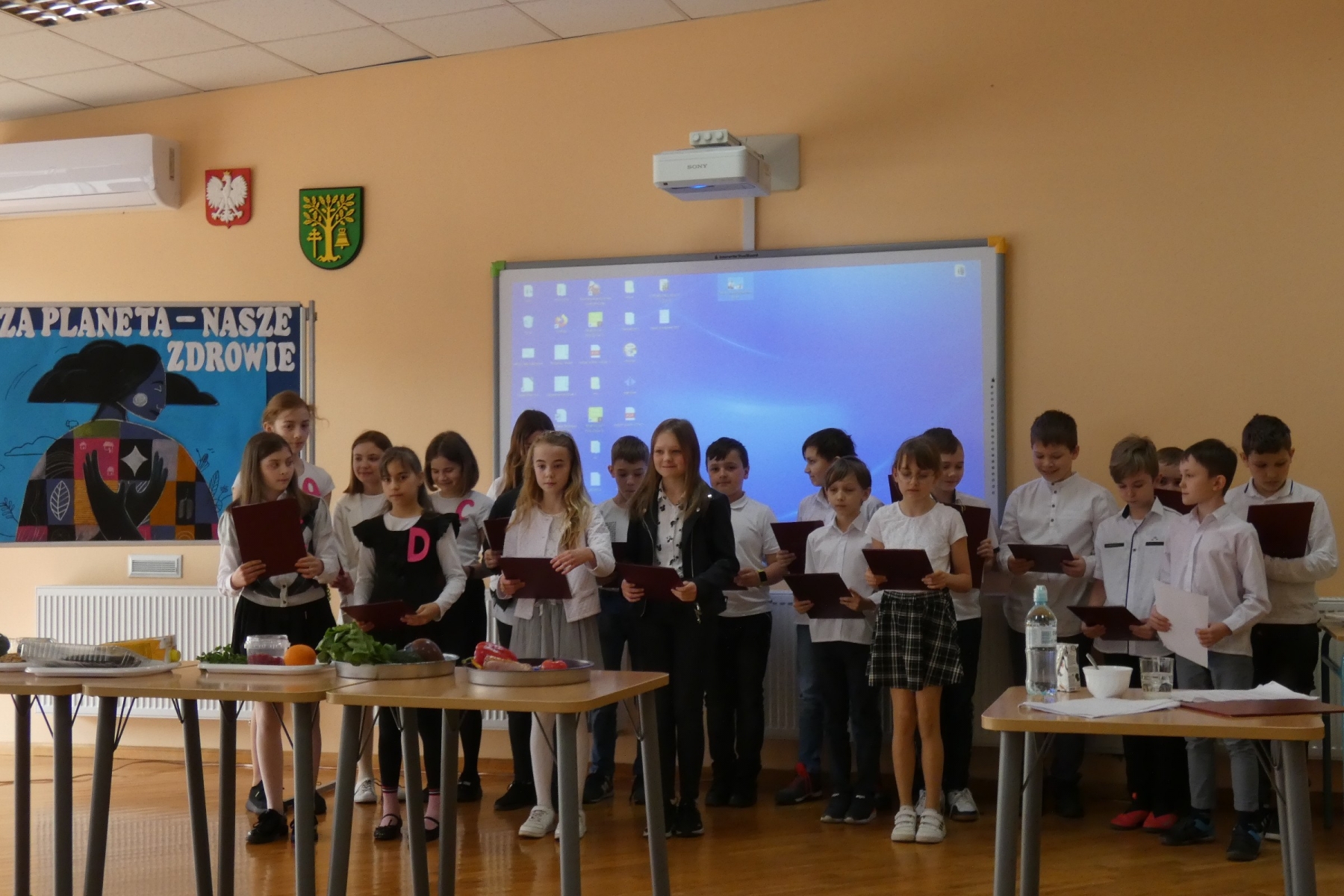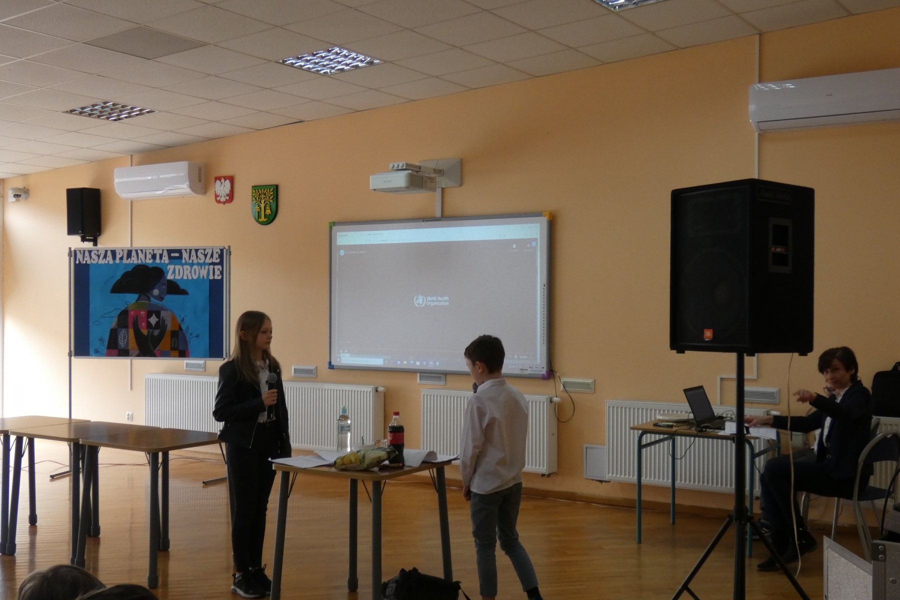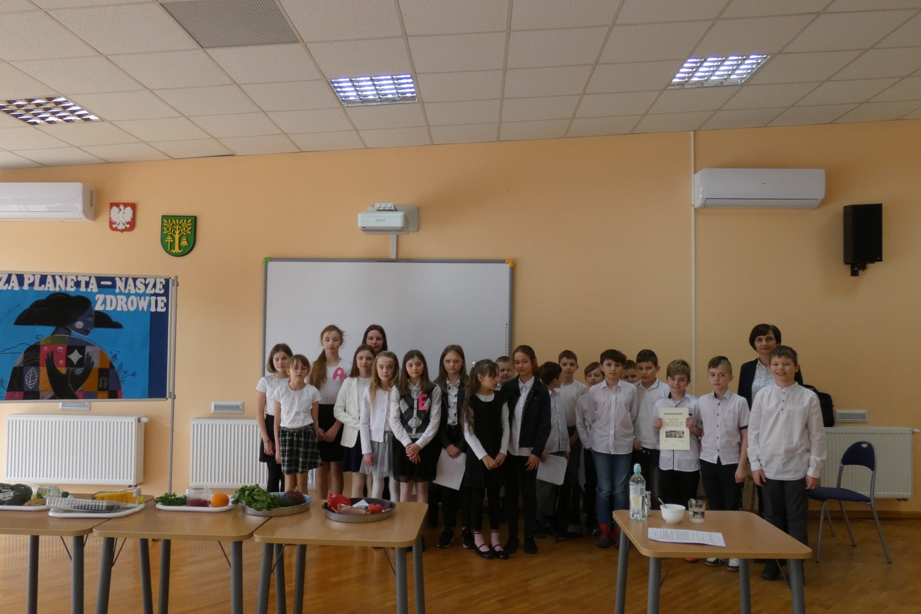 Zdrowe odżywianie to w wielu krajach priorytet współczesnego społeczeństwa. Ale nie wszędzie tak jest. Problemom zdrowotnym świata przyjrzeli się uczniowie klas VII. Z jednej strony mamy głód i niedożywienie, z drugiej nadwagę i otyłość. Wielu ludzi boryka się z zaburzeniami odżywiania i chorobami cywilizacyjnymi, których przyczyną są nieprawidłowe nawyki żywieniowe. Efektem pracy zespołów uczniowskich są przygotowane prezentacje, z których jedną mieliśmy okazję obejrzeć podczas apelu. Uczeń klasy VII B Eryk Kapusta poruszył w niej problem głodu i niedożywienia. Miało to szczególny oddźwięk, ponieważ jednocześnie zdajemy sobie sprawę ile żywności marnują społeczeństwa krajów rozwiniętych. Na ten problem zwrócił uwagę uczeń klasy V B Jakub Marecki wykonując pracę plastyczną pod hasłem: „No waste food – nie marnuj żywności”.