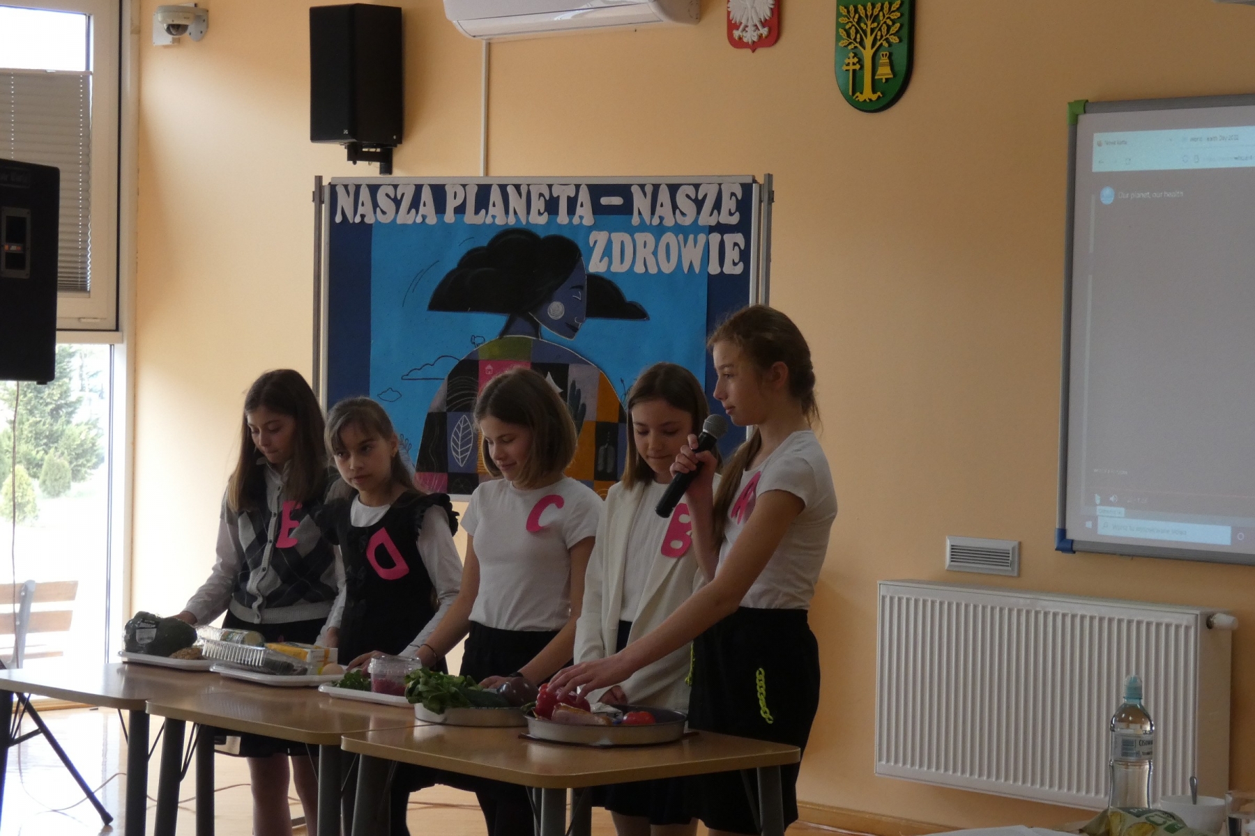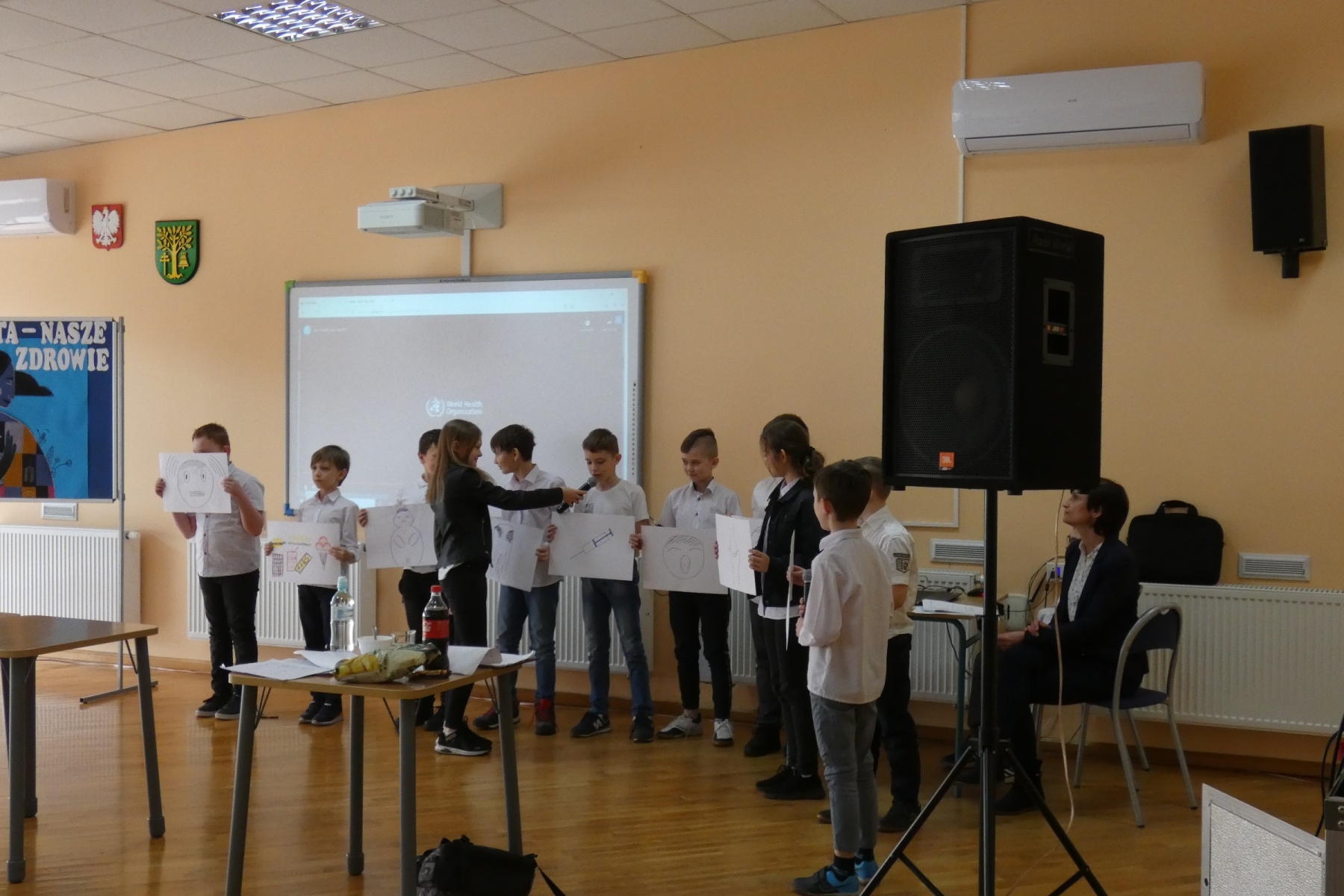 O takich zagrożeniach przypomnieli nam uczniowie klasy IV A podczas apelu z okazji Światowego Dnia Zdrowia. W przygotowanej scence zwrócili także uwagę na szkodliwość żywności zawierającej duże ilości cukru. Tak popularne wśród uczniów napoje gazowane i batony, które są preferowane jako szkolne drugie śniadanie, to zagrożenie otyłością, próchnicą, cukrzycą typu drugiego, rozdrażnieniem, brakiem koncentracji i problemami ze snem. Oczywiście zaproponowali kolegom i koleżankom zdrowe i pełne witamin przekąski i napoje. Tace pełne owoców i warzyw, pełne były także witamin potrzebnych młodym ludziom do prawidłowego rozwoju.