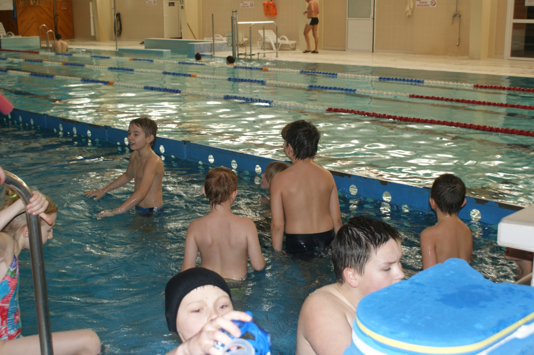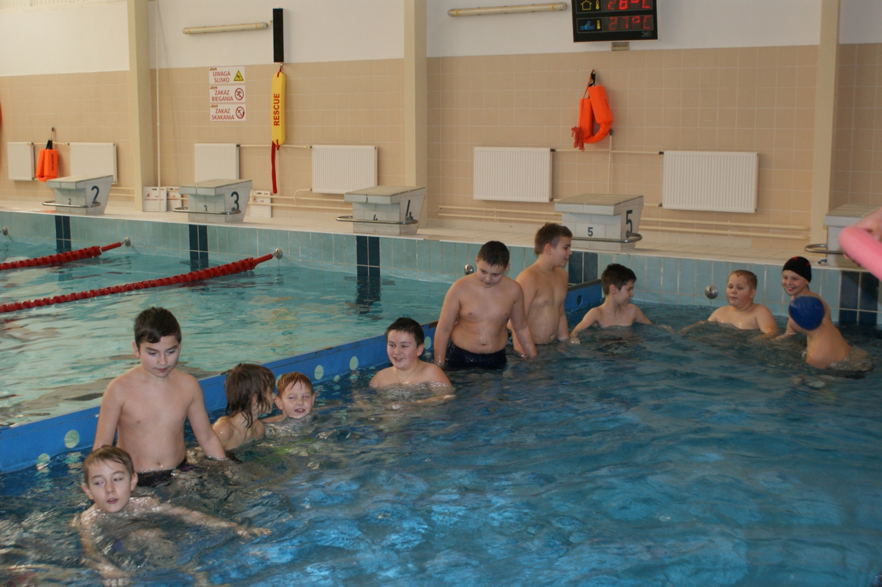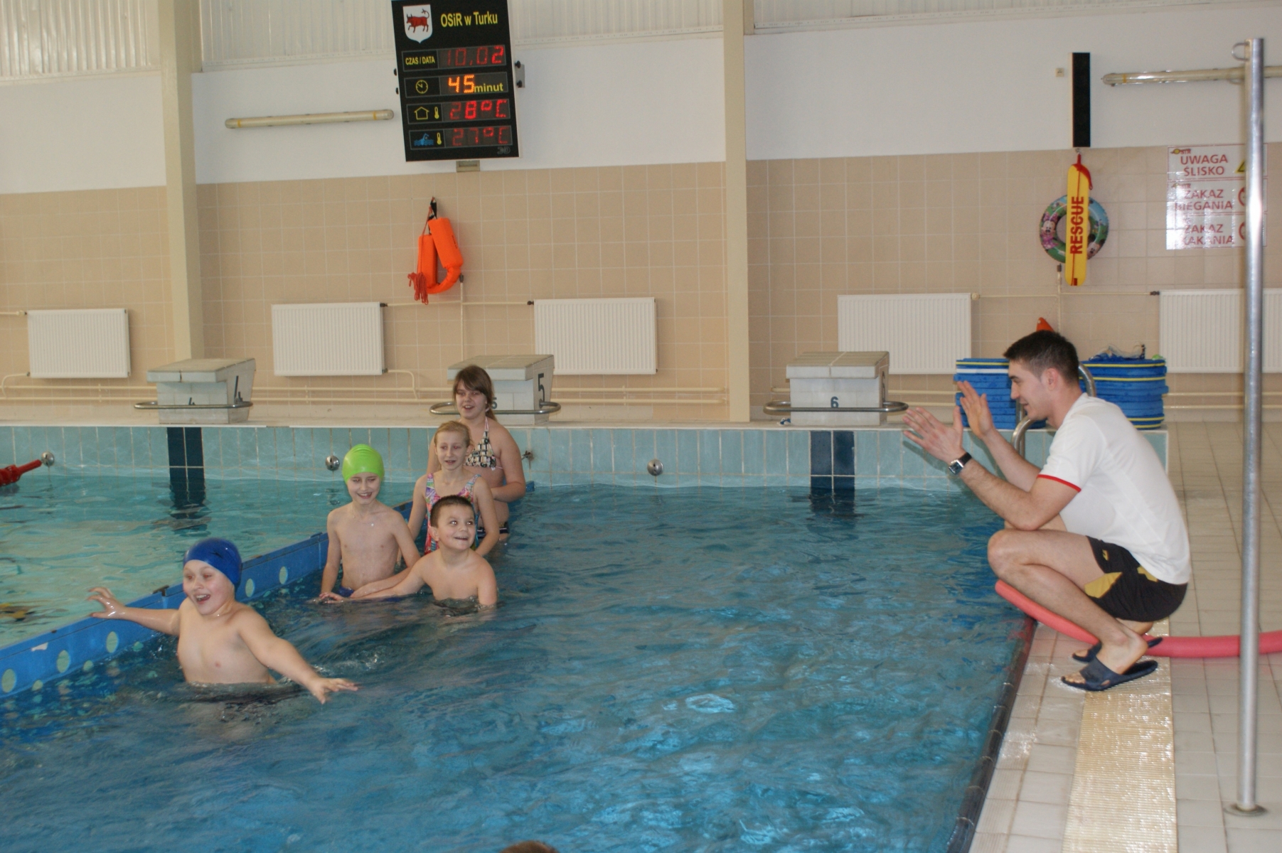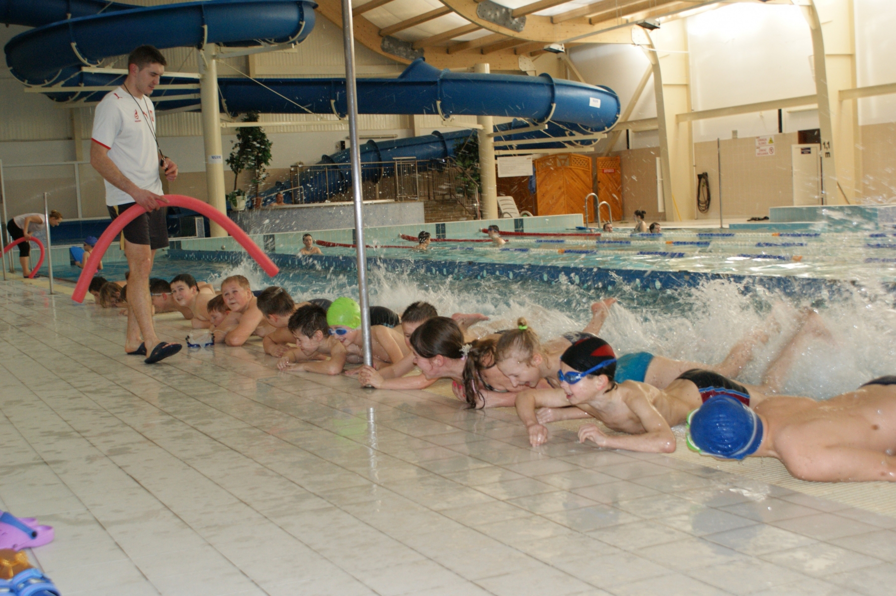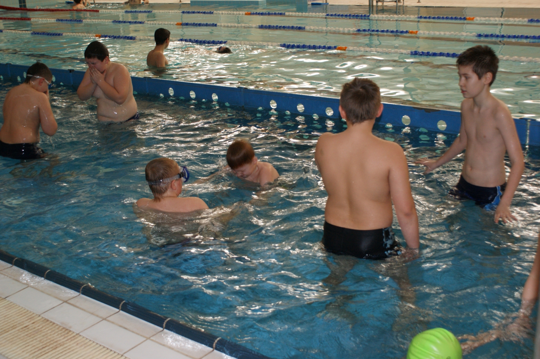Podczas pierwszych zajęć, grupa dwudziestu pięciu uczniów poprzez gry i zabawy w wodzie zapoznała się ze środowiskiem wodnym. Nurkując, wykonując poślizgi oraz wydechy do wody, młodzi pływacy zapoznali się z przysłowiowym „abecadłem” pływania. Kolejne zajęcia opierały się na doskonaleniu pracy nóg w pływaniu stylem grzbietowym i kraulem na piersiach. Wspólna nietypowa nauka, zabawa i ruch sprawiły, że dzieci spędziły wolny czas w aktywny sposób. Cztery godziny zajęć to zaledwie „kropla w morzu” w całym cyklu nauki pływania, jednakże zauważalne postępy i zaangażowanie wśród dzieci były motorem napędowym zajęć.