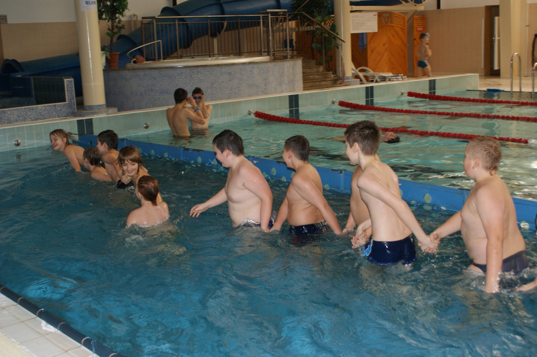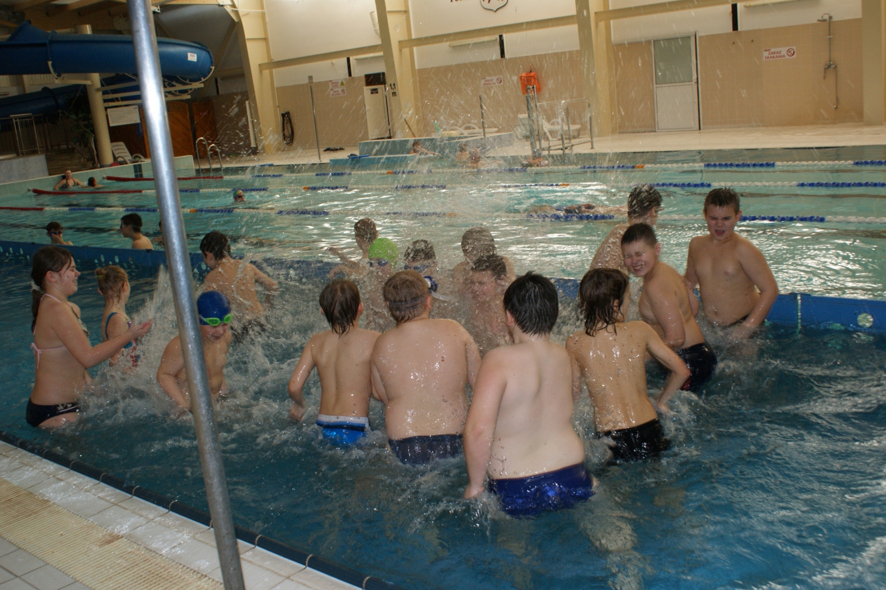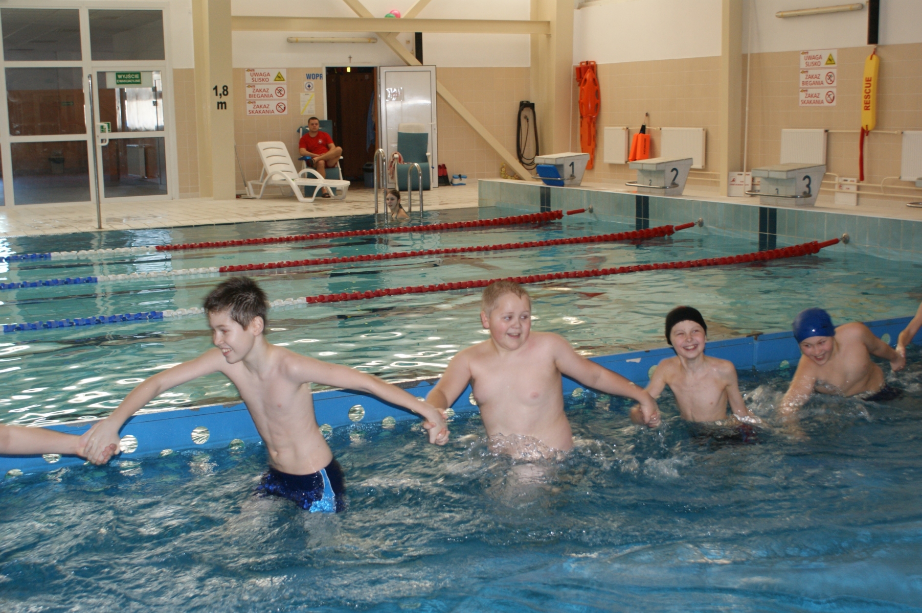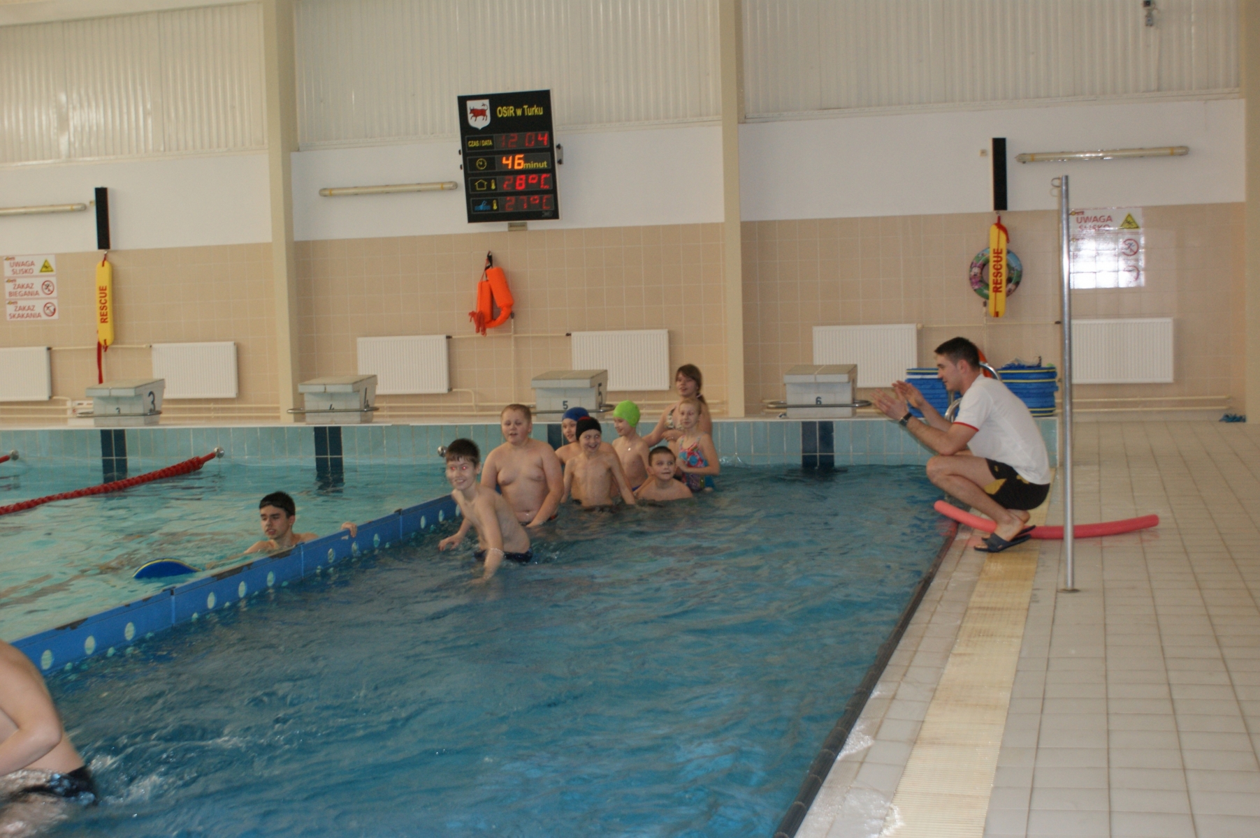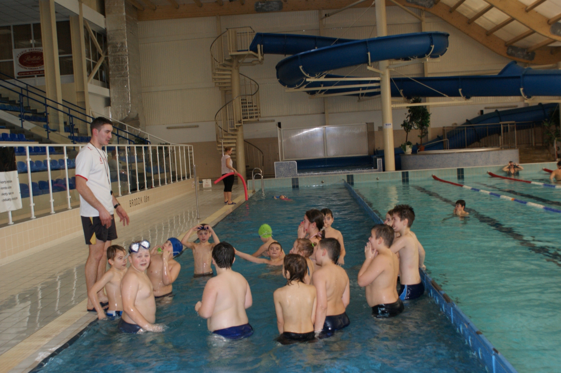 Podczas pierwszych zajęć, grupa dwudziestu pięciu uczniów poprzez gry i zabawy w wodzie zapoznała się ze środowiskiem wodnym. Nurkując, wykonując poślizgi oraz wydechy do wody, młodzi pływacy zapoznali się z przysłowiowym „abecadłem” pływania. Kolejne zajęcia opierały się na doskonaleniu pracy nóg w pływaniu stylem grzbietowym i kraulem na piersiach. Wspólna nietypowa nauka, zabawa i ruch sprawiły, że dzieci spędziły wolny czas w aktywny sposób. Cztery godziny zajęć to zaledwie „kropla w morzu” w całym cyklu nauki pływania, jednakże zauważalne postępy i zaangażowanie wśród dzieci były motorem napędowym zajęć.