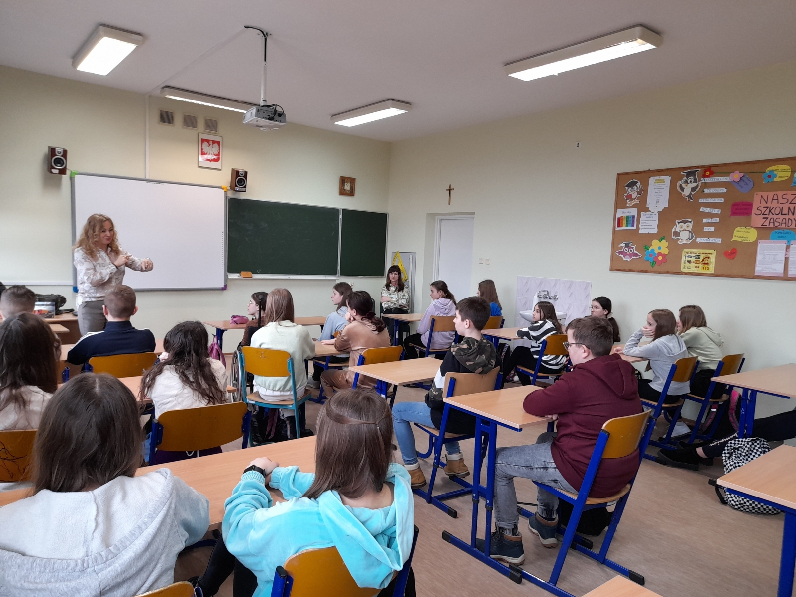 Pani kurator zwróciła także uwagę na aspekt prawny związany z cyberprzemocą, wzajemnym obrażaniem, dokuczaniem. Przypomniała także uczniom o nowych uprawnieniach dyrektora szkoły w związku ze zmianami w „Ustawie o resocjalizacji i wspieraniu nieletnich”.