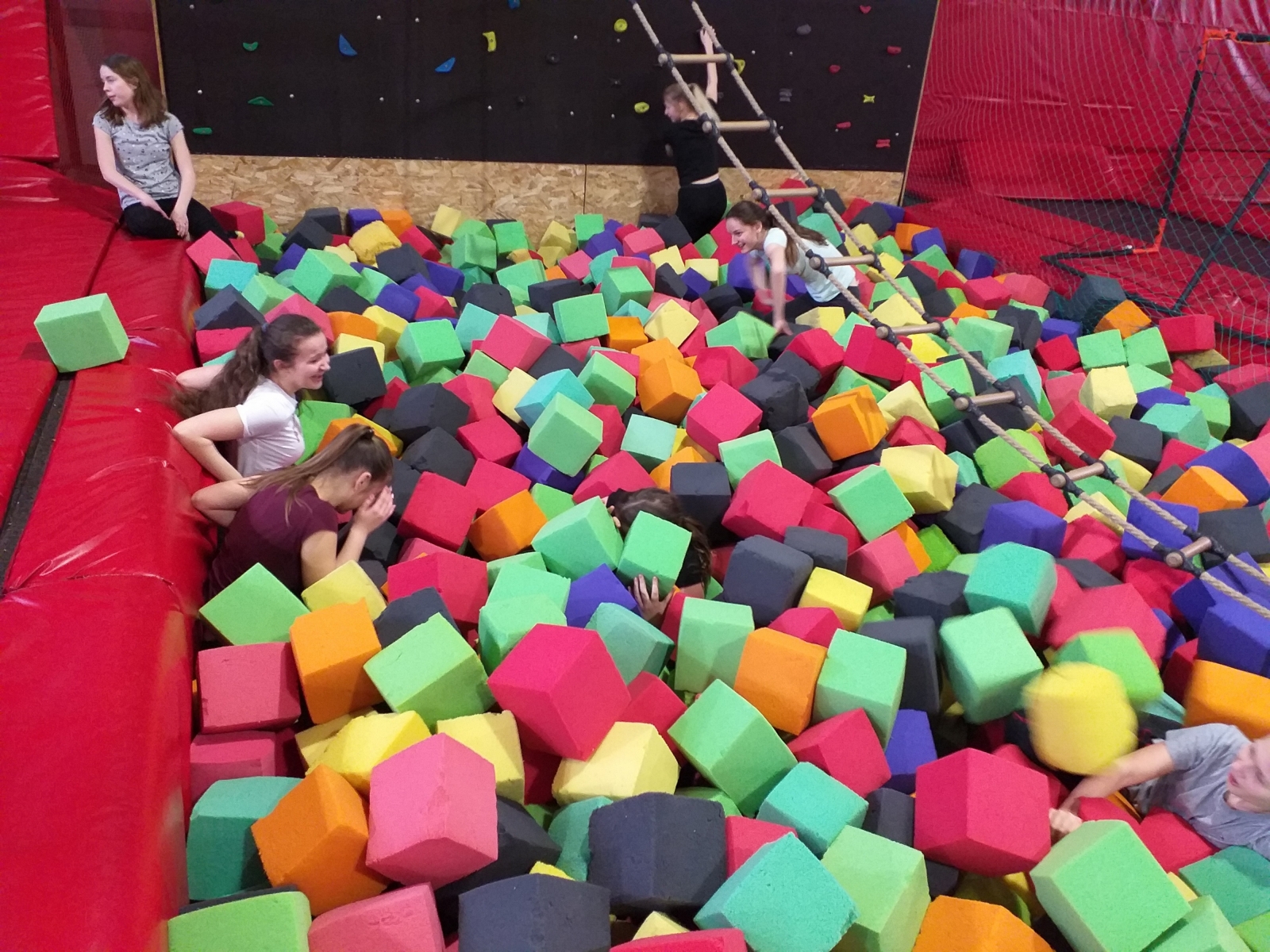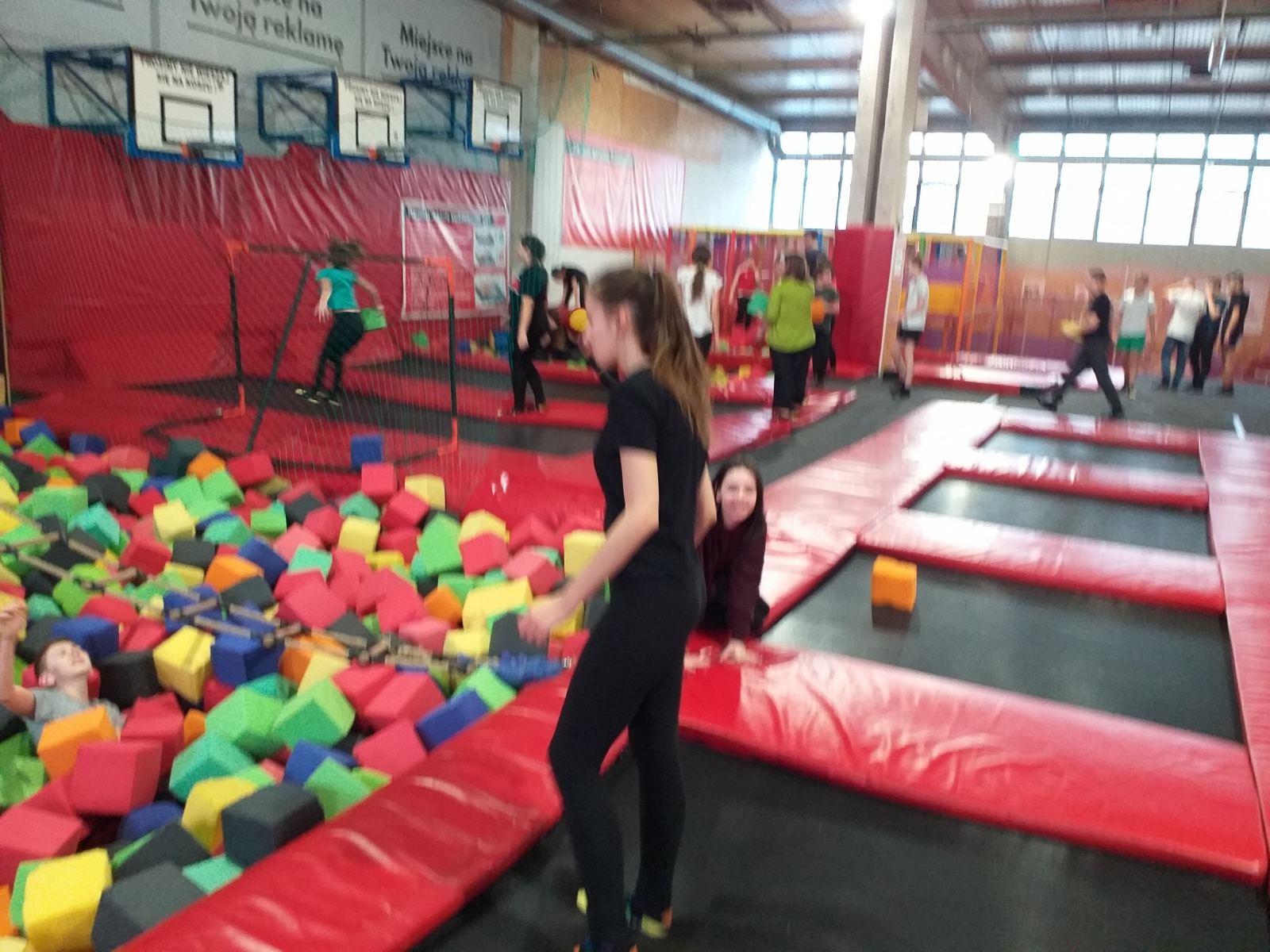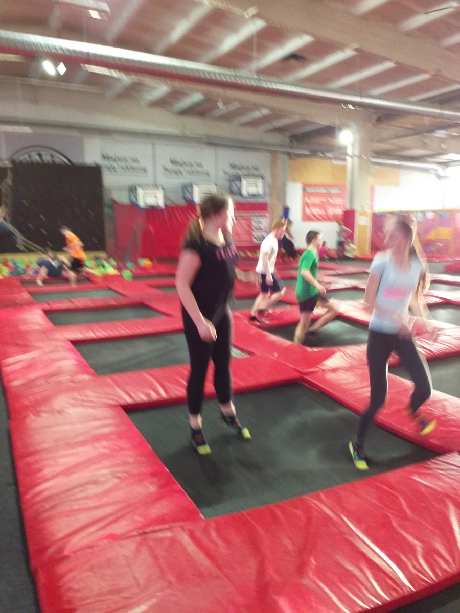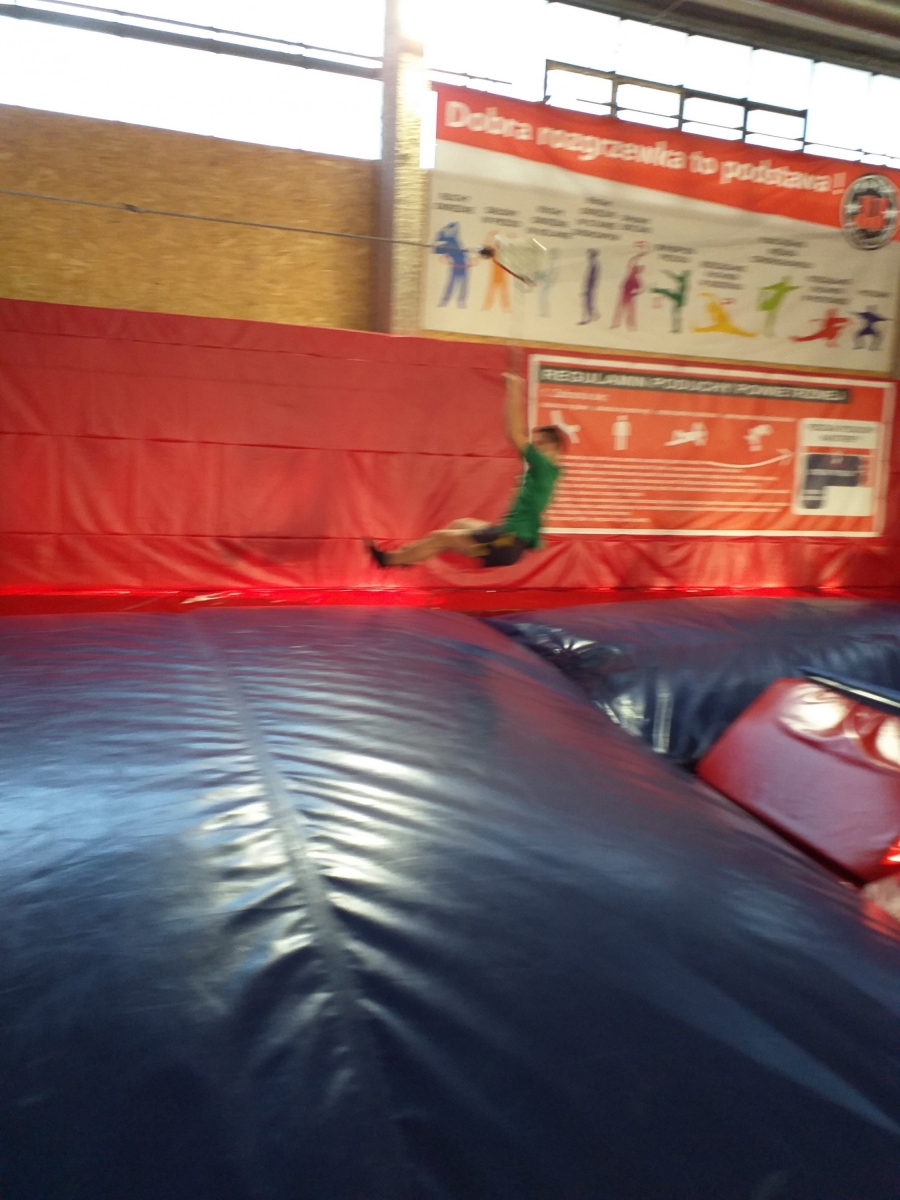 Spędziliśmy tam dwie godziny na super zabawie. Po uprzedniej rozgrzewce przeprowadzonej w profesjonalny sposób uczniowie skakali, zjeżdżali, wspinali się i podciągali spędzając aktywnie czas ćwicząc przeróżne akrobacje, skoki i triki. Podczas skakania wytwarzają się endorfiny – „hormony szczęścia”, które dają poczucie radości, a tej, jak się dało zauważyć, nie brakowało naszym uczestnikom!