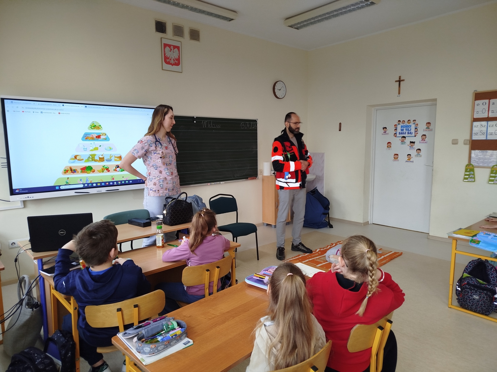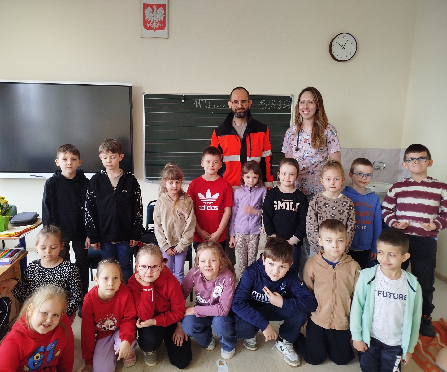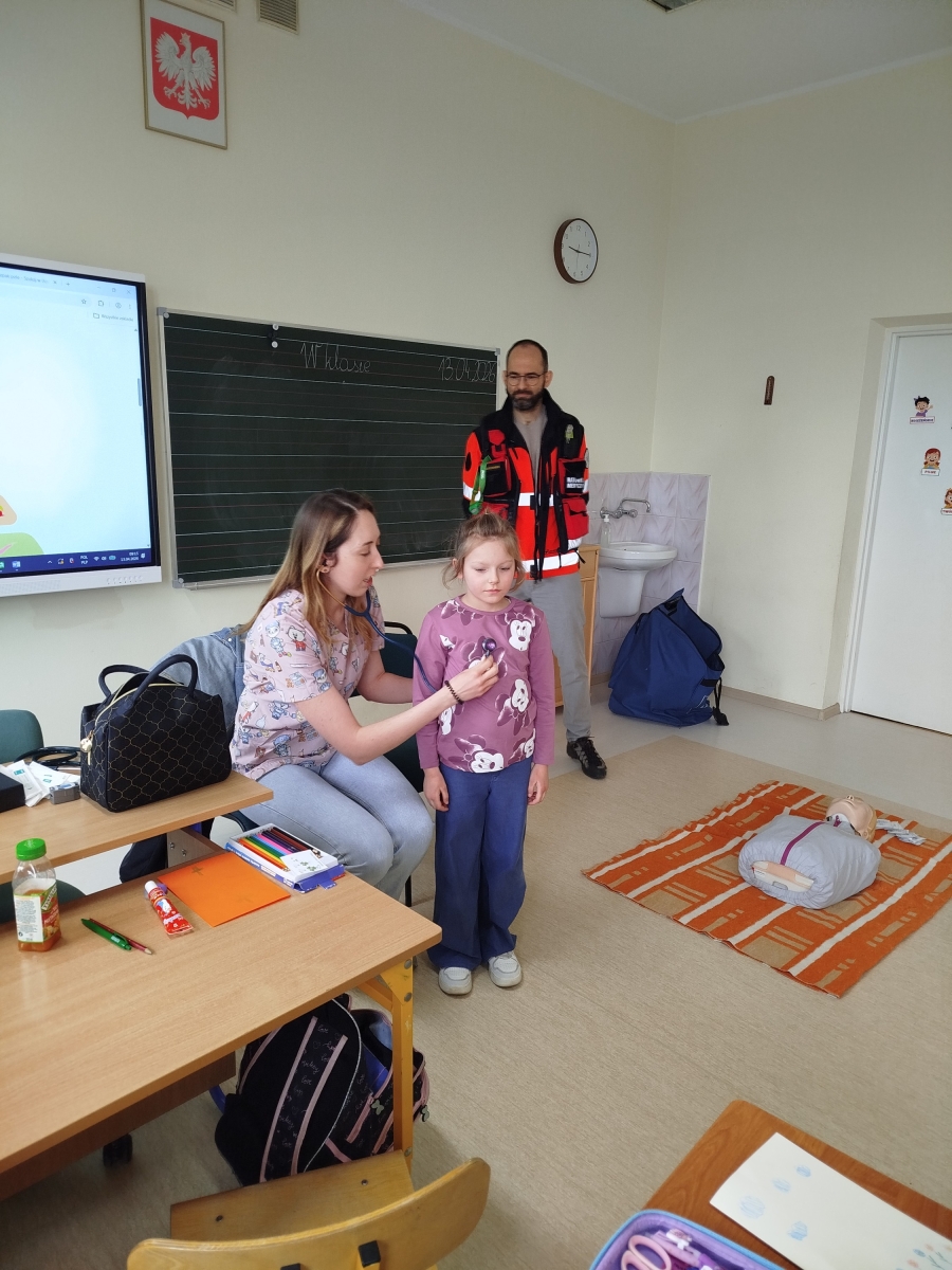 W poniedziałek, 13 kwietnia, sala klasy 1c zamieniła się w małe centrum medyczne. Nasi uczniowie gościli wyjątkowych profesjonalistów z Centrum Diagnostyki Obrazowej Rodamed z Turku: panią pediatrę Kingę Ratajczyk oraz ratownika medycznego pana Bartosza Wojciechowskiego. Celem wizyty było nie tylko oswojenie dzieci z gabinetem lekarskim, ale poznanie specyfiki zawodu lekarza i przede wszystkim nauka ratowania życia.