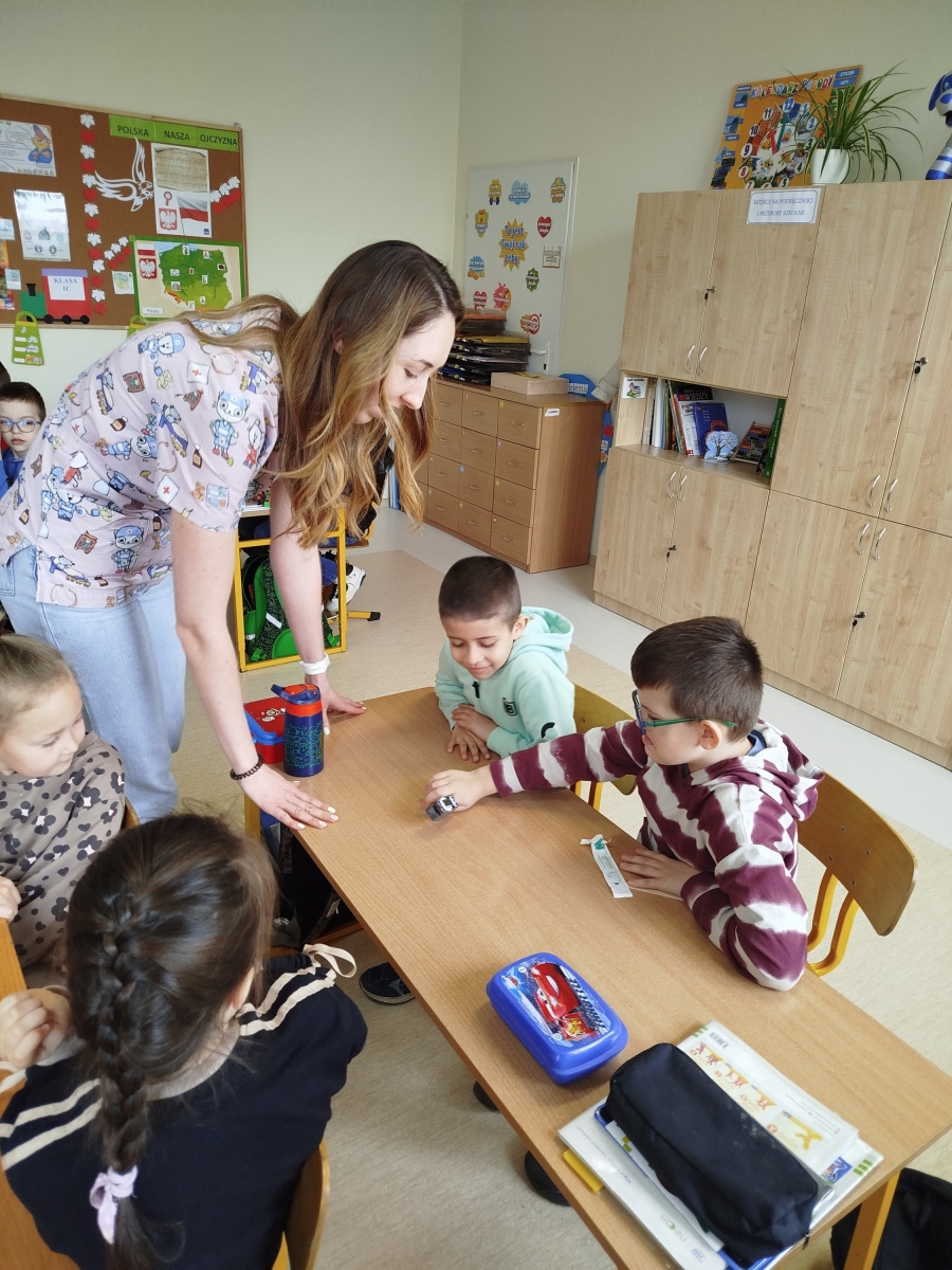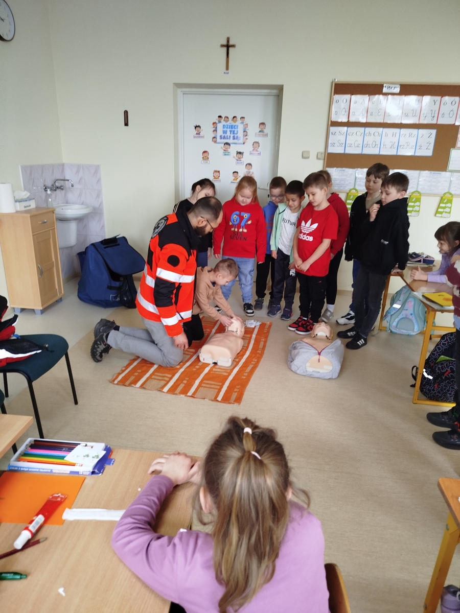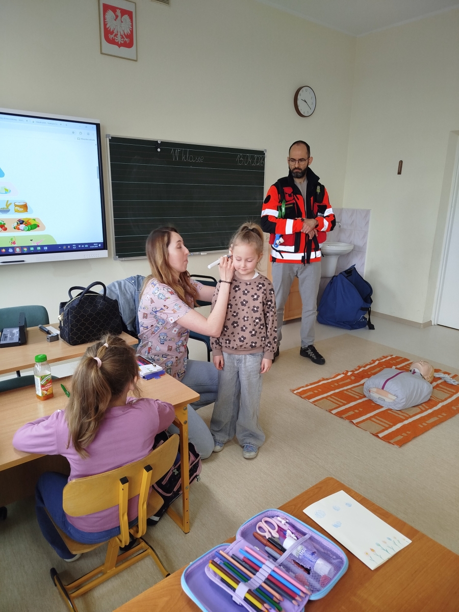 W poniedziałek, 13 kwietnia, sala klasy 1c zamieniła się w małe centrum medyczne. Nasi uczniowie gościli wyjątkowych profesjonalistów z Centrum Diagnostyki Obrazowej Rodamed z Turku: panią pediatrę Kingę Ratajczyk oraz ratownika medycznego pana Bartosza Wojciechowskiego. Celem wizyty było nie tylko oswojenie dzieci z gabinetem lekarskim, ale poznanie specyfiki zawodu lekarza i przede wszystkim nauka ratowania życia.