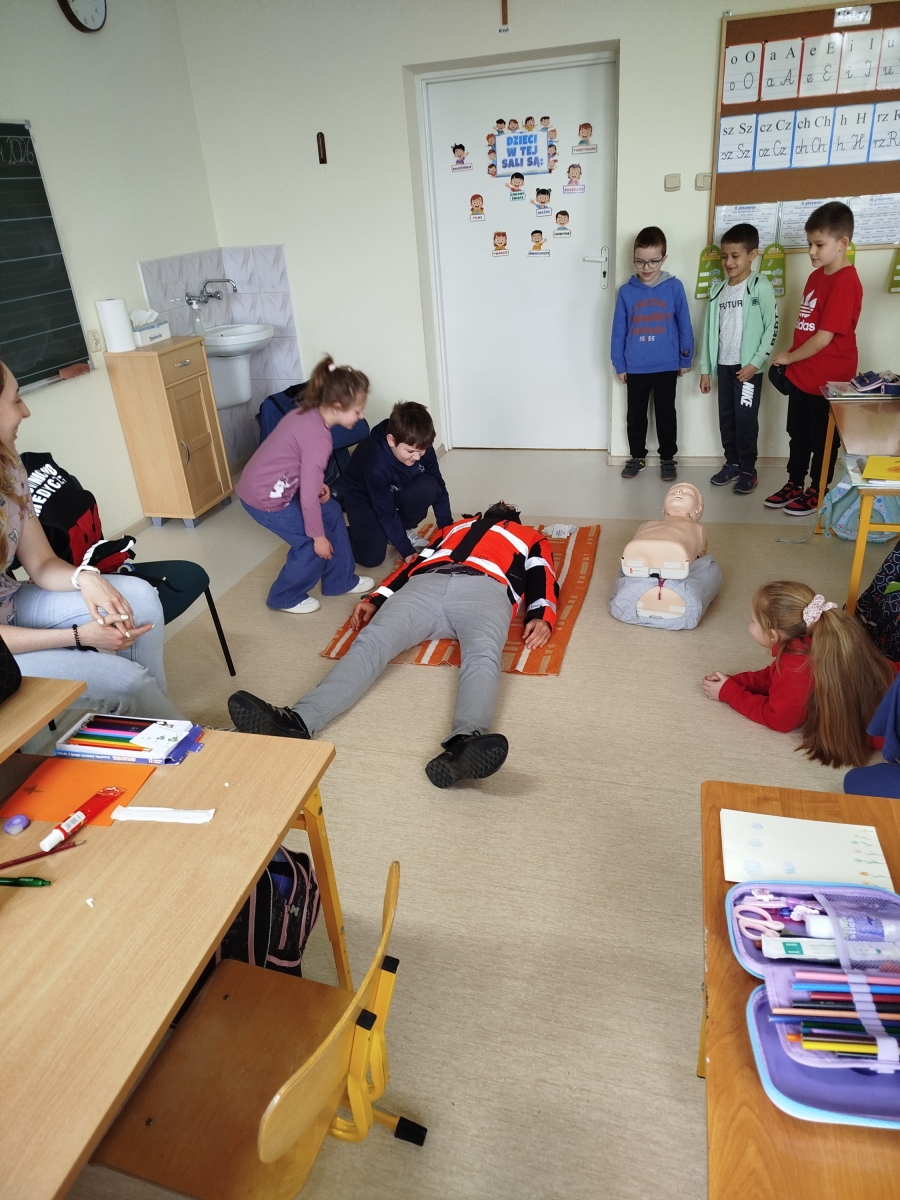 Dzięki panu Bartoszowi sala lekcyjna stała się polem treningowym. Każdy uczeń mógł spróbować swoich sił w udzielaniu pierwszej pomocy przedmedycznej. To bezcenna wiedza, która uczy odpowiedzialności i opanowania w trudnych sytuacjach. Na zakończenie uczniowie wręczyli naszym gościom podziękowanie, własnoręcznie wykonane kartki oraz drobny upominek. Z całego serca dziękujemy pani Kindze i panu Bartoszowi za interesujące spotkanie oraz za poświęcony nam czas.