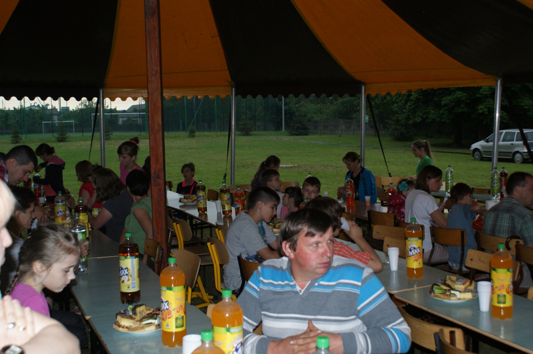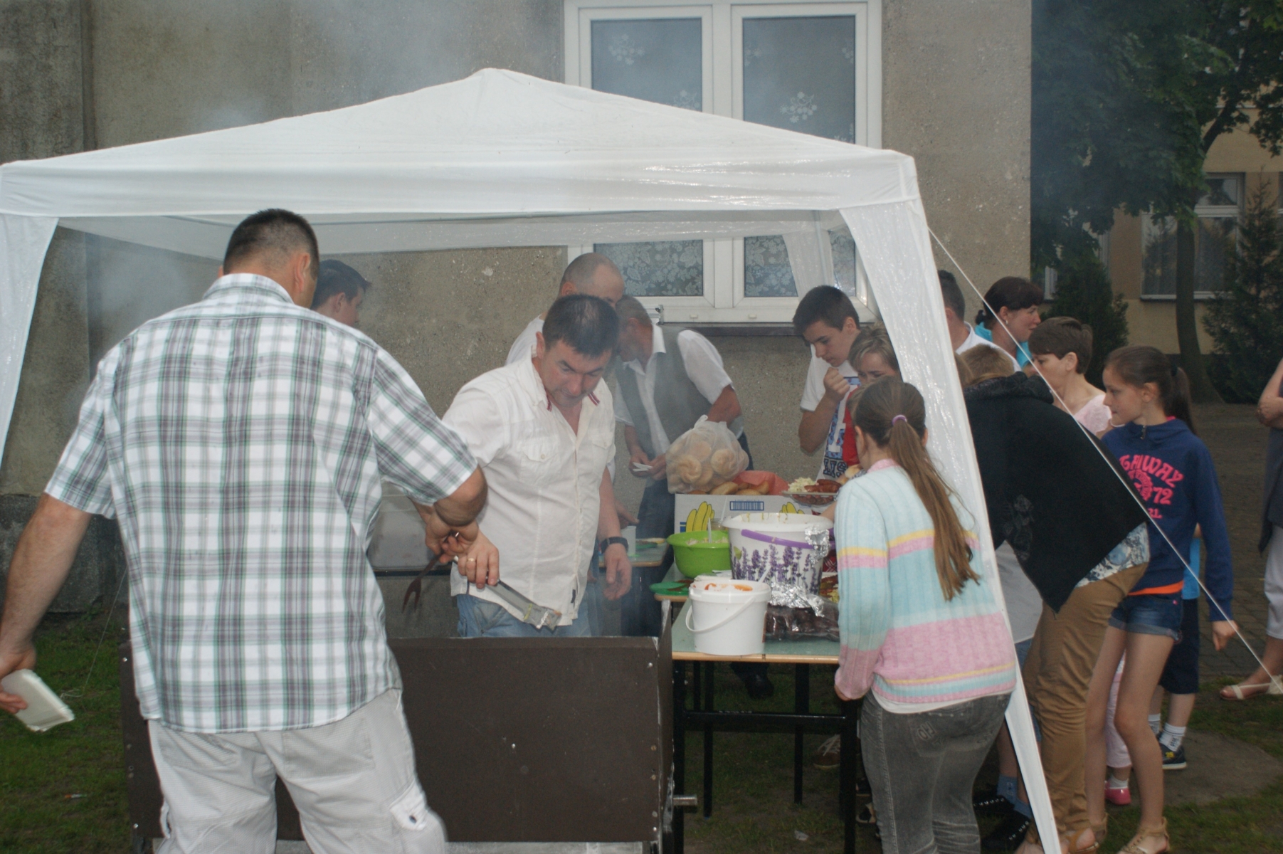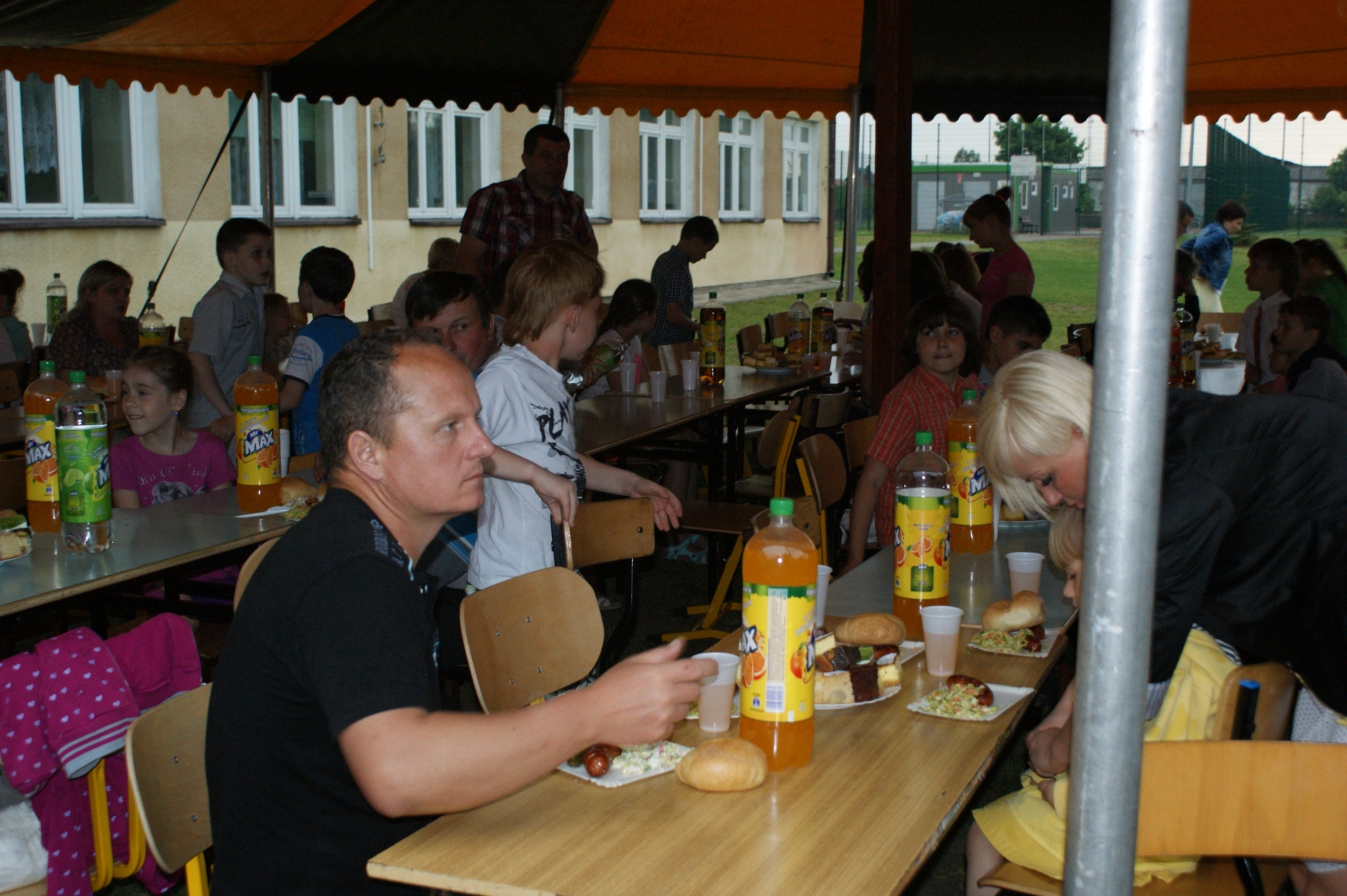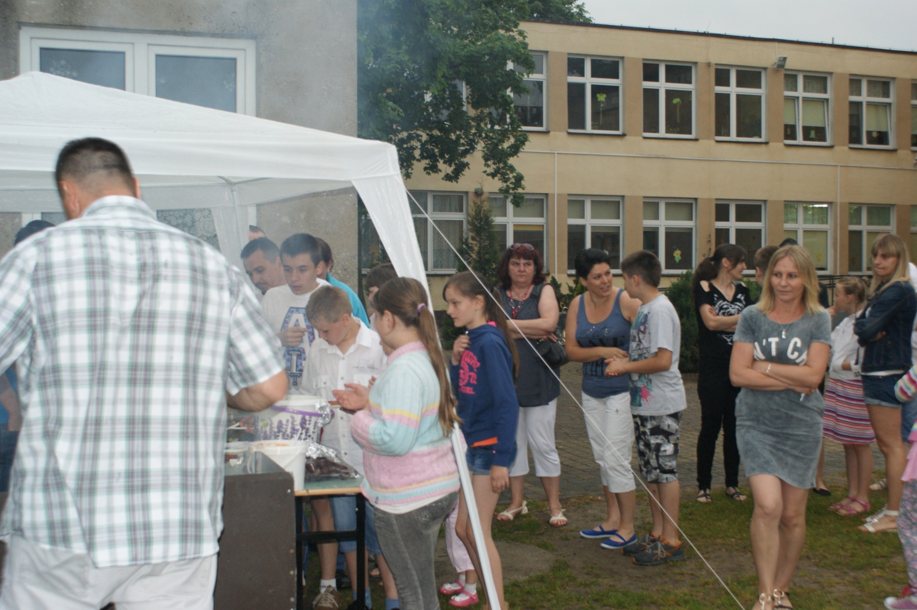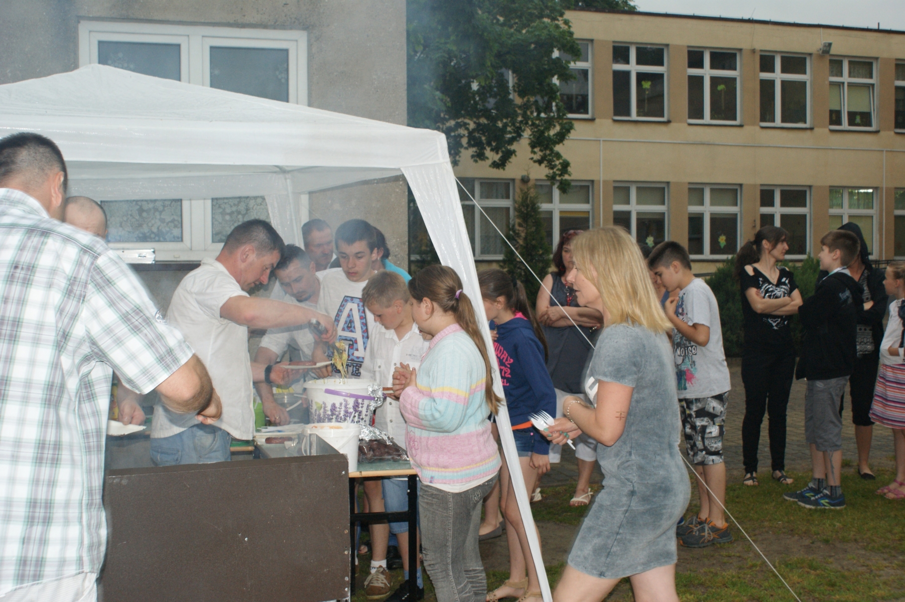 Smaczny poczęstunek, który przygotowali Rodzice udało się zjeść na dziedzińcu szkolnym, ale deszcz sprawił, że szybko trzeba było przenosić się do szkoły. Niesprzyjająca aura nie zepsuła jednak dalszej części uroczystości. Wspólne zabawy, konkurencje i tańce sprawiły wszystkim sporo radości. Piknik odbył się dzięki sprawnej organizacji i dużemu zaangażowaniu Rodziców, których pogoda nie zraziła i utrzymali wesoły nastrój do końca. To był emocjonujący, pełen wrażeń i dobrej zabawy dzień.