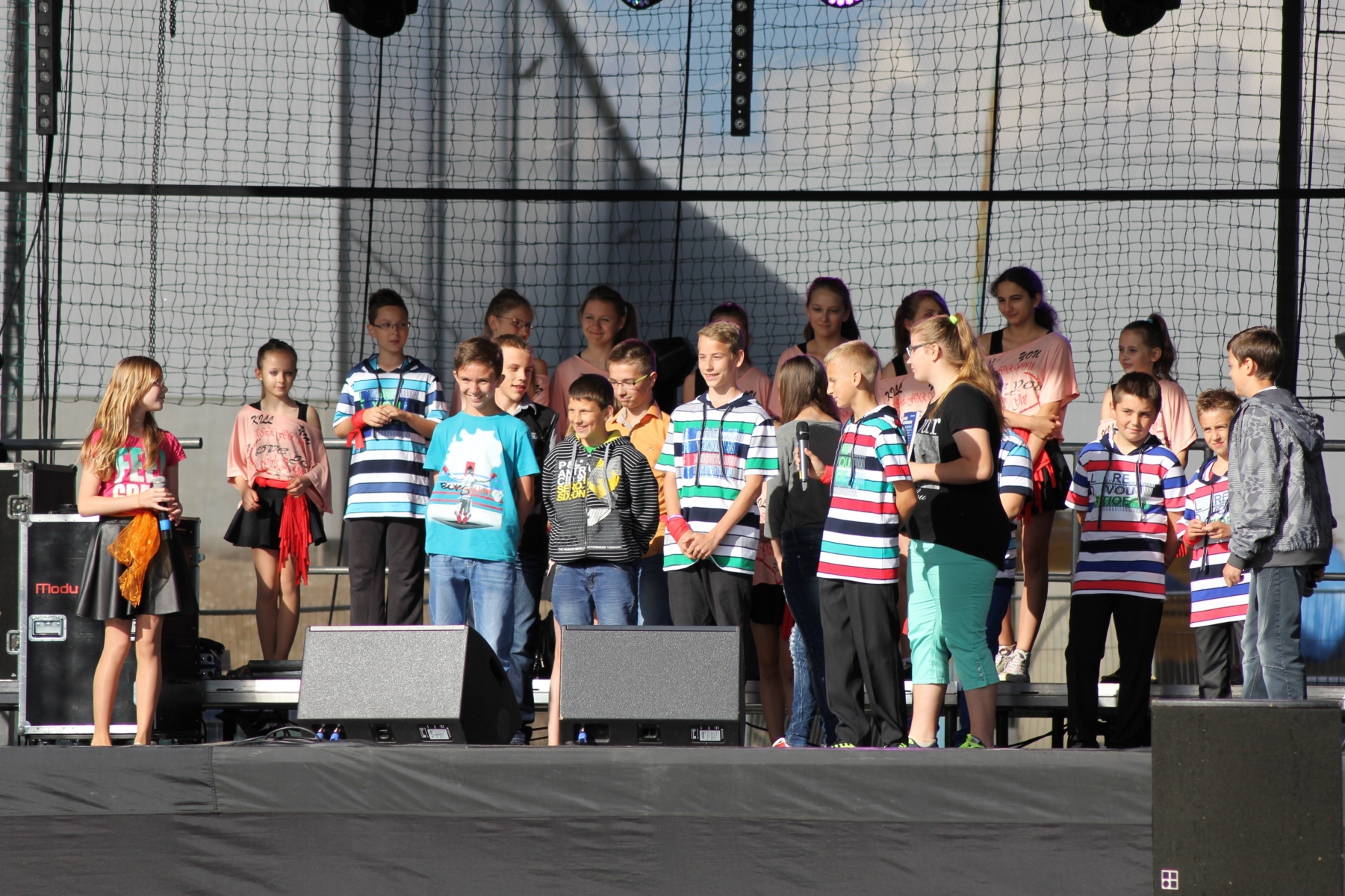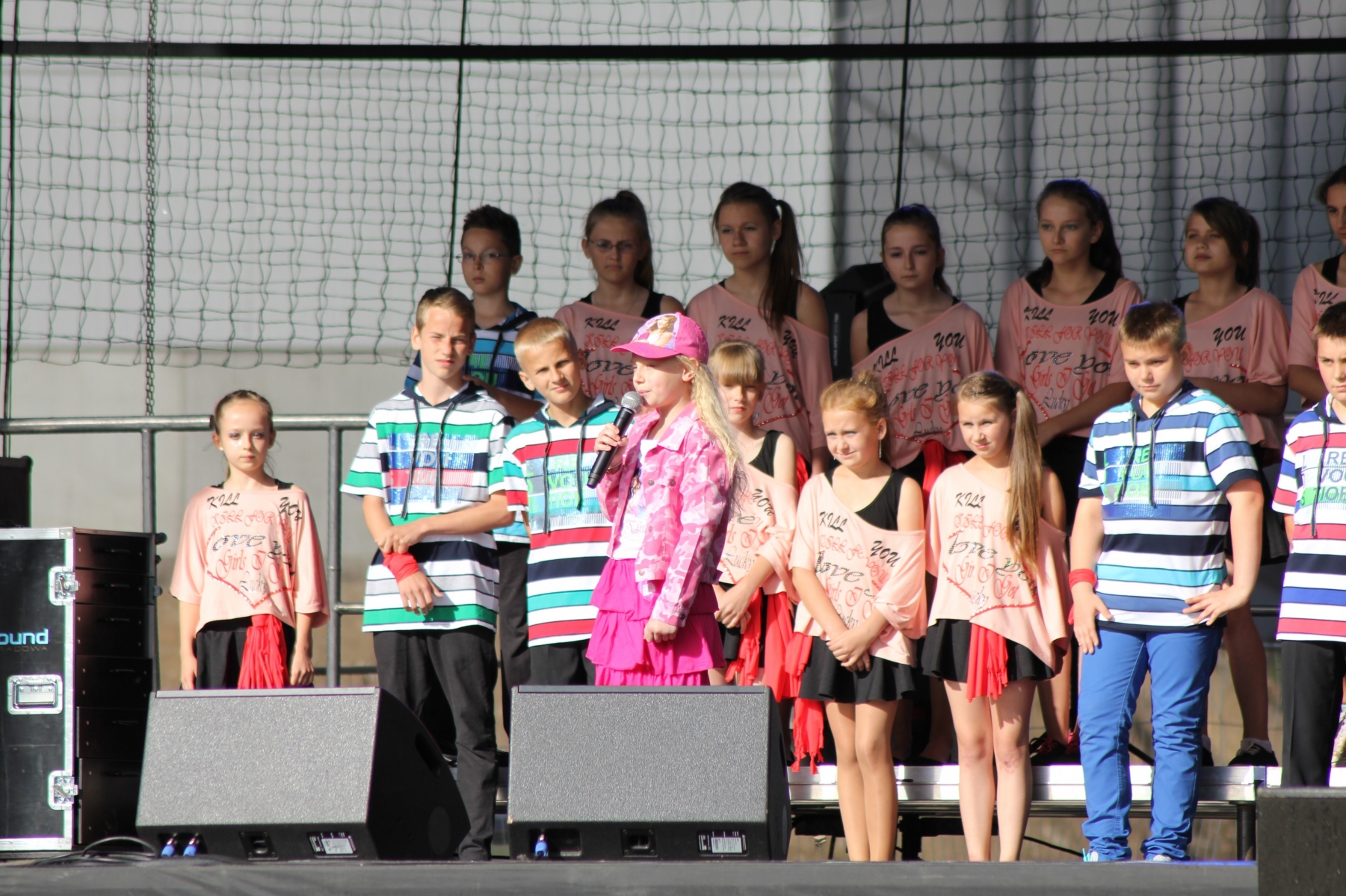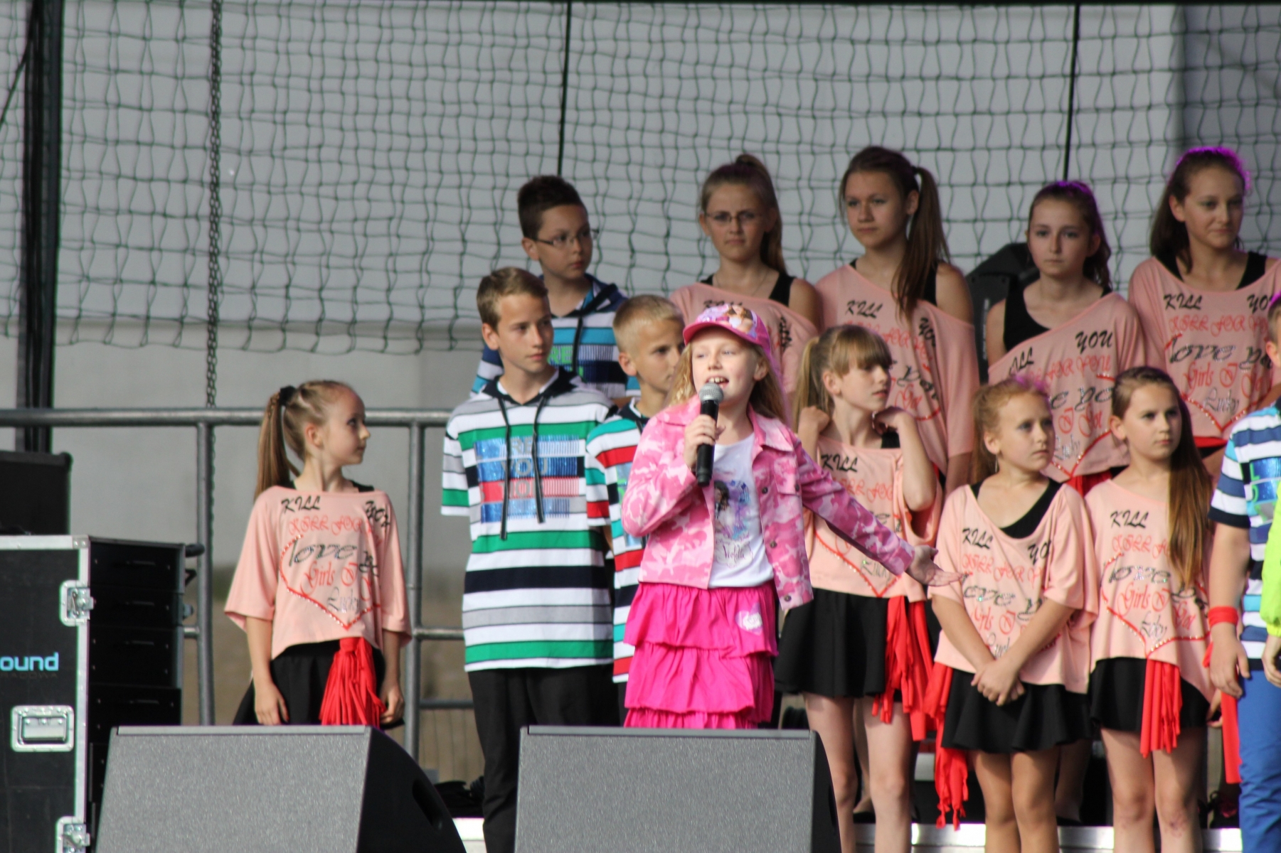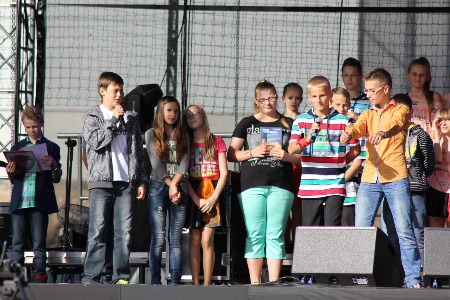 Deszczowe chmury nagromadzone nad sceną ustąpiły miejsca słoneczku, które wyłoniło się, kiedy na scenę wkroczyli młodzi śpiewacy. Kwartet złożony z uczennic klasy czwartej zaśpiewał piosenkę pt.” Żyj do przodu”, najmłodsza uczestniczka naszego występu Maja Grzelka po gwiazdorsku wykonała piosenkę pt. „Śpiewam i tańczę”, nie zabrakło także naszych chłopców z klasy szóstej Jakuba Białasa i Filipa Walczaka, którzy podobnie, jak pozostali śpiewacy zostali przygotowani do występu przez p. Katarzynę Tomczyk.